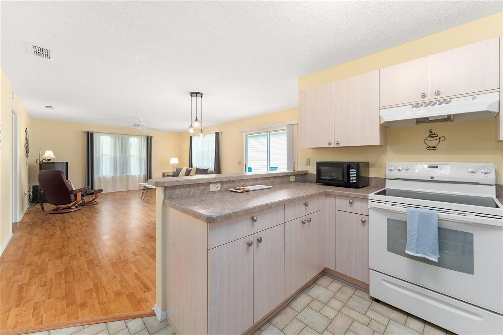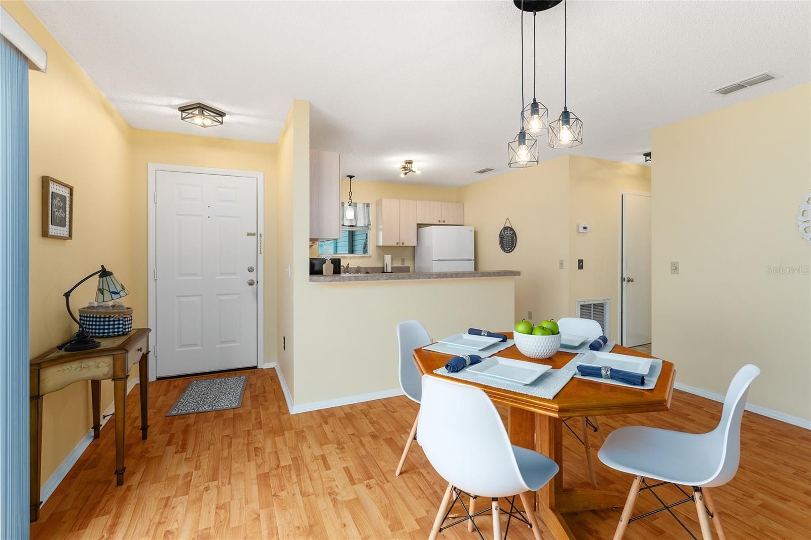 Bond paid, NO carpet, AND comes fully furnished at this super cute and clean patio villa in the sought after village of De La Vista West. As you approach the home, you will notice the nicely manicured lawn with grass and decorative rock. The front lanai is enclosed with chairs, ceiling fan and shades to help keep the area cool. Through the front entry you will find the dining room with a table setting for 4 and new light fixtures. The kitchen has light color cabinetry, counter seating at the bar; also has new lighting, and an open concept for entertaining and viewing the front lanai. The bedroom has a large walk-in closet and attached bathroom with tub/shower combo and vanity. Enjoy the natural light from 2 solar tubes. 2017 EZGO golf cart available for separate purchase making this home a true turnkey possibility. This home is just minutes by golf cart to Sumter landing or Spanish Springs town squares. Cheapest one bedroom one bath patio villa in Sumter County. Come check it out!