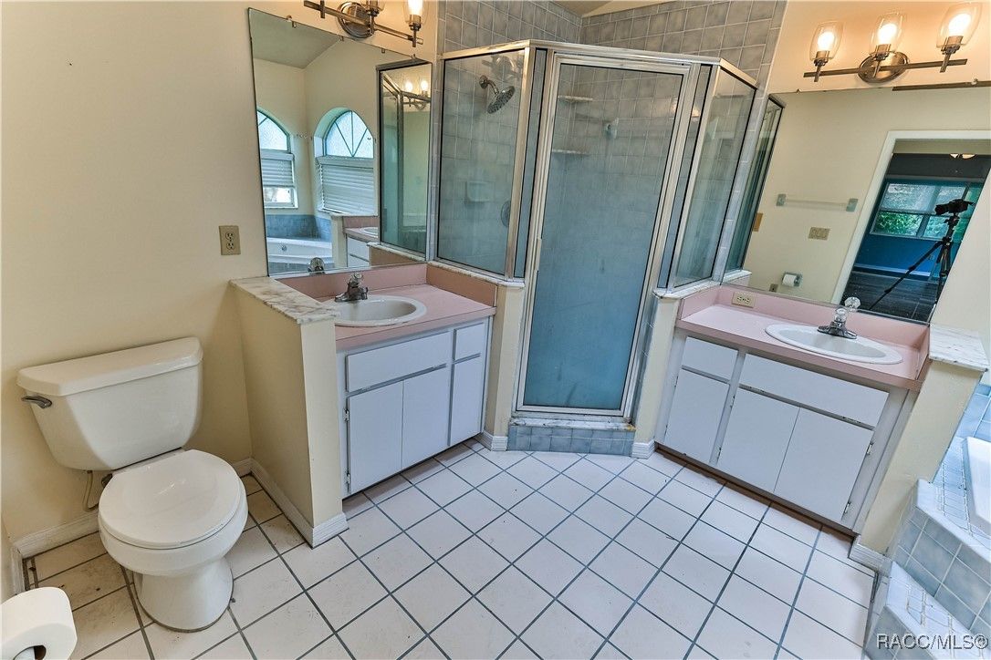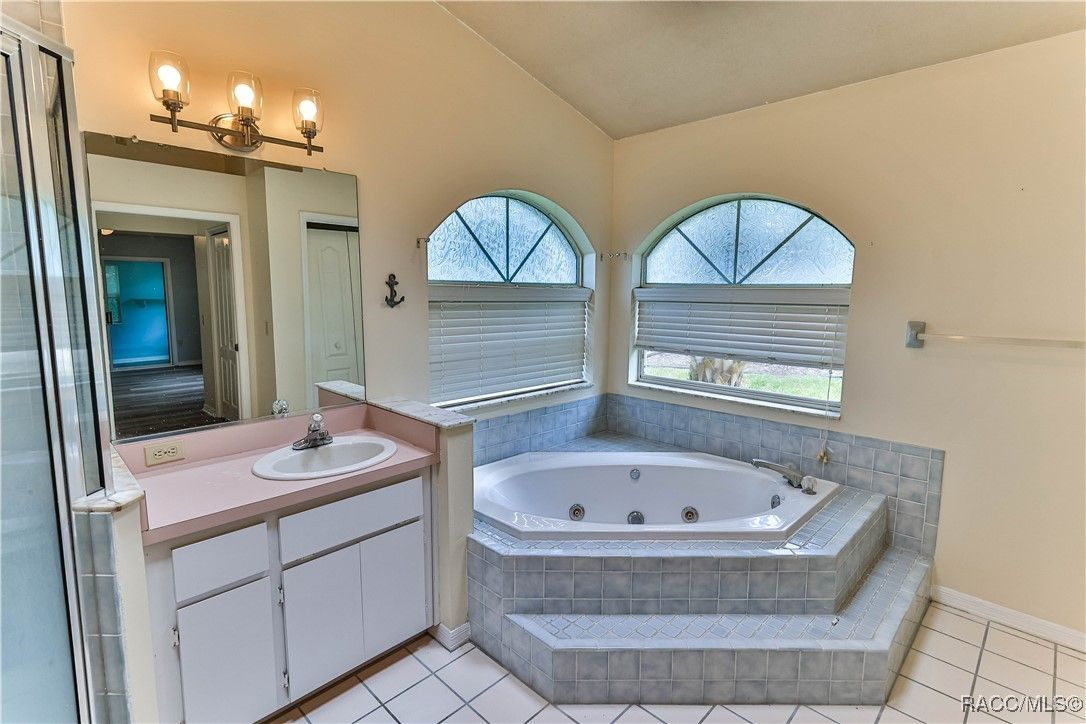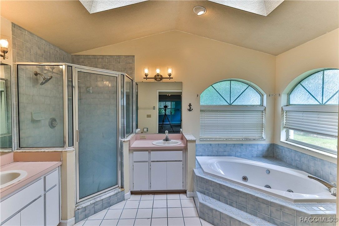 - Bathtub, Cathedral Ceiling(s), Dual Sinks, Laminate Counters, Main Level Primary, Primary Suite, Split Bedrooms, Separate Shower, Tub Shower, Window Treatments