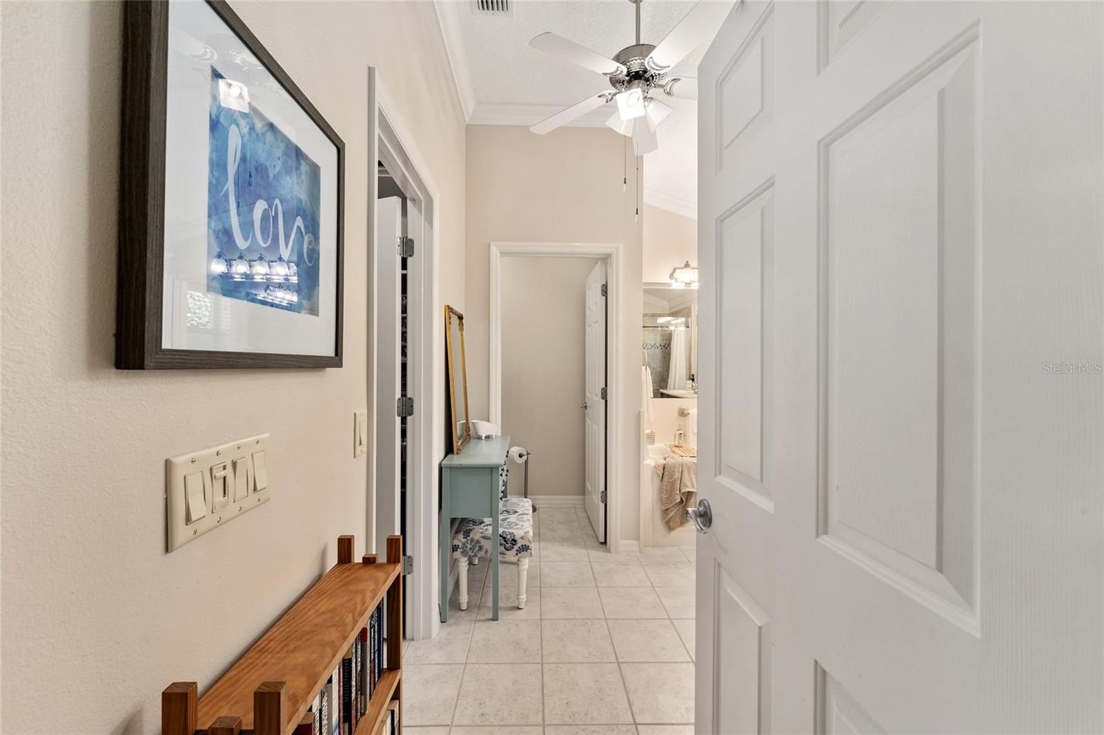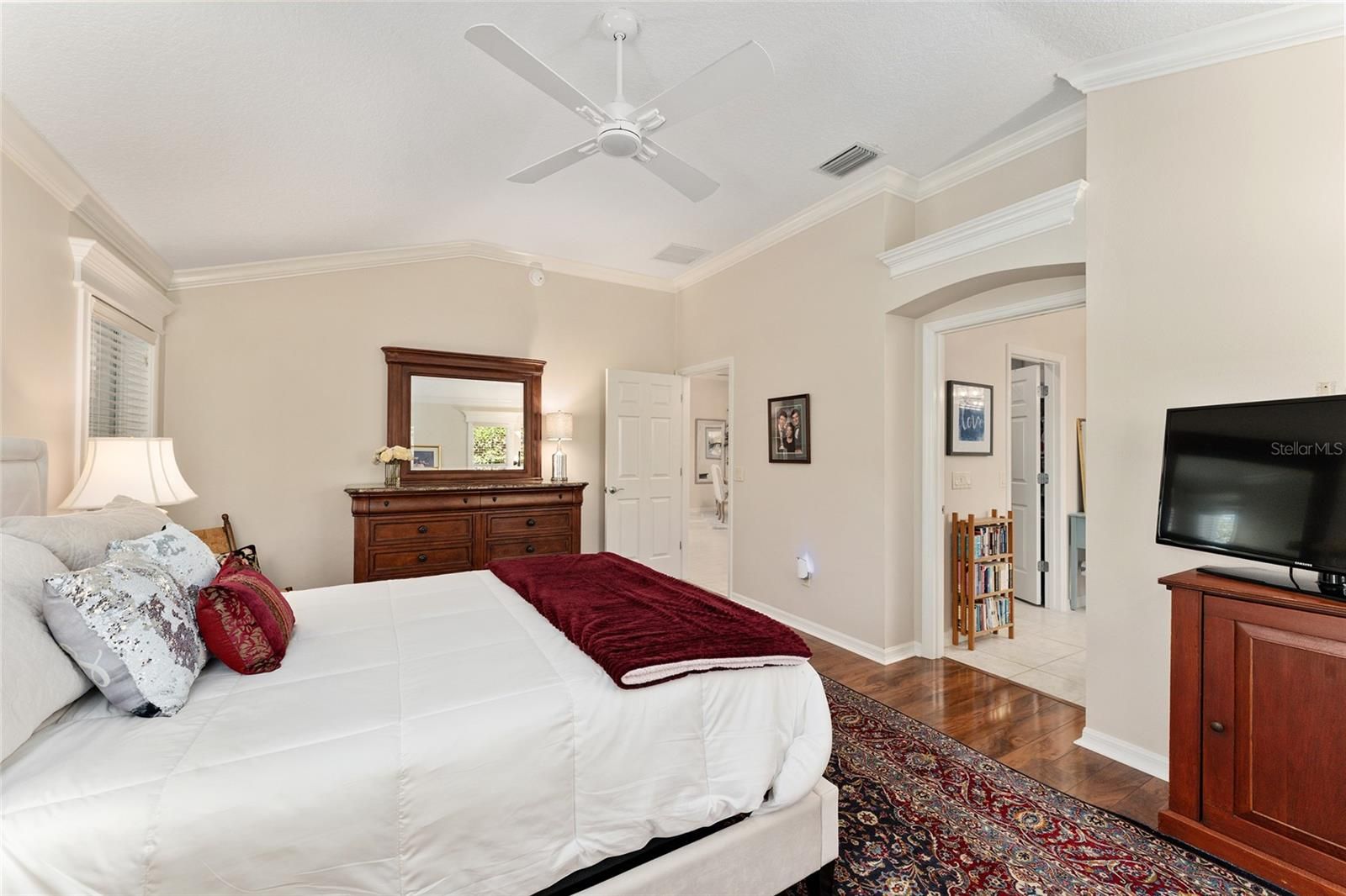 - Built-in Features, Ceiling Fan(s), Crown Molding, High Ceilings, Open Floorplan, Solid-Wood Cabinets, Thermostat, Vaulted Ceiling(s), Walk-In Closet(s)