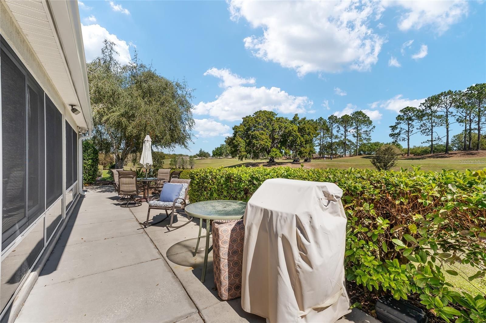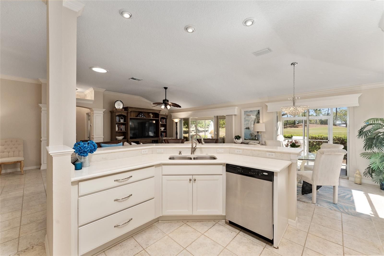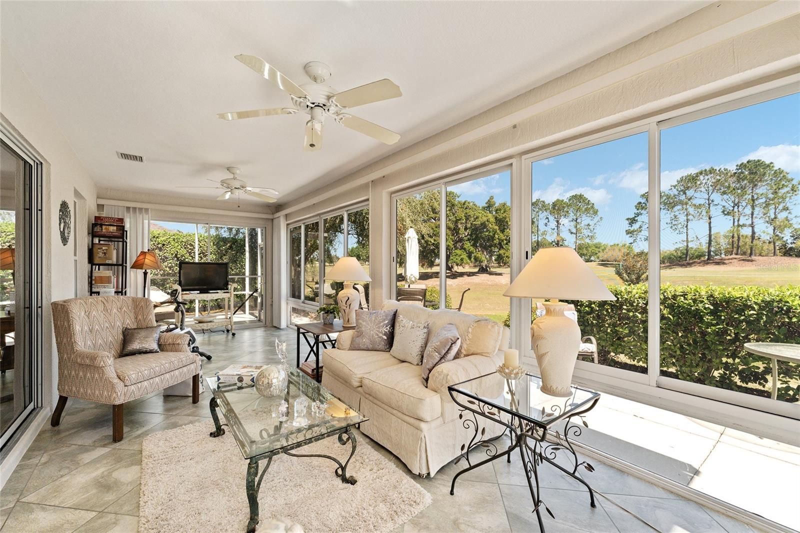 Welcome to this METICULOUSLY MAINTAINED LANTANA DESIGNER MODEL OFFERING BREATHTAKING VIEWS OF THE NANCY LOPEZ GOLF COURSE 7TH HOLE AT TORI PINES. IN THE VILLAGE OF CALUMET GROVE. This three-bedroom, two-bath home features an OVERSIZED 25X24 TWO-CAR GARAGE and charming curb appeal, highlighted by a decorative glass front door with sidelights and an inviting entry foyer. Inside, you’ll FIND TILE FLOORING throughout the main living areas and VAULTED CEILINGS that enhance the spacious feel. Plus, there’s no popcorn ceiling for a clean and modern look. The kitchen has been COMPLETELY UPDATED AND BOASTS QUARTZ COUNTERTOPS AND BACKSPLASH, ENHANCED STAINLESS STEEL APPLIANCES, INCLUDING A GAS RANGE AND NEW GARBAGE DISPOSAL, A PANTRY CLOSET, AND PULL-OUT SHELVES for easy storage. The guest wing features two spacious bedrooms, one with a BAY WINDOW and ample closet space. The updated guest bath showcases a TILED SHOWER. The master suite is a true retreat with, A LARGE WALK-IN CLOSET W/ A BUILT-IN CLOSET SYSTEM, and an elegant master bath complete with A JETTED SOAKING TUB, AN ENHANCED TILED SHOWER W/FRAMELESS GLASS SHOWER DOOR, and a separate water closet. ADDITIONAL UPGRADES INCLUDE CUSTOM WOOD MOLDING AND CORNICES, CUSTOM WINDOW TREATMENTS, AND UPDATED LIGHTING INSIDE AND OUT. Enjoy the comfort of an ENCLOSED HEAT AND AIR VENTED ALL-SEASONS LANAI WITH ACRYLIC WINDOWS ADDS TO THE SQUARE FOOTAGE OF 300SQFT AND TWO EXPANDED BIRDCAGES, perfect for relaxing or entertaining. The private outdoor area is surrounded by a convenient WALKWAY THAT ENCIRCLES THE ENTIRE HOME.. The OVERSIZED GARAGE offers plenty of storage with built-in cabinets, pull-down attic stairs, and floor attic space for ample storage. ***LOW BOND BALANCE $2,325.31, ROOF 2023, TANKLESS HOT WATER HEATER.*** Situated just moments from the FABULOUS, NEW “First Responders” Recreation Center with a Walk-in Pool, Pitch-N-Putt Golf Course, PICKLEBALL, and MORE! Close to Nancy Lopez Country Club, East access to Several Pools (Adult & Family), and Mulberry Grove Rec Center. Shopping, Banking, Restaurants, and the VA Center are nearby! This home provides both relaxation and recreation at your fingertips. Experience luxury living with stunning golf course views — schedule your private showing today!