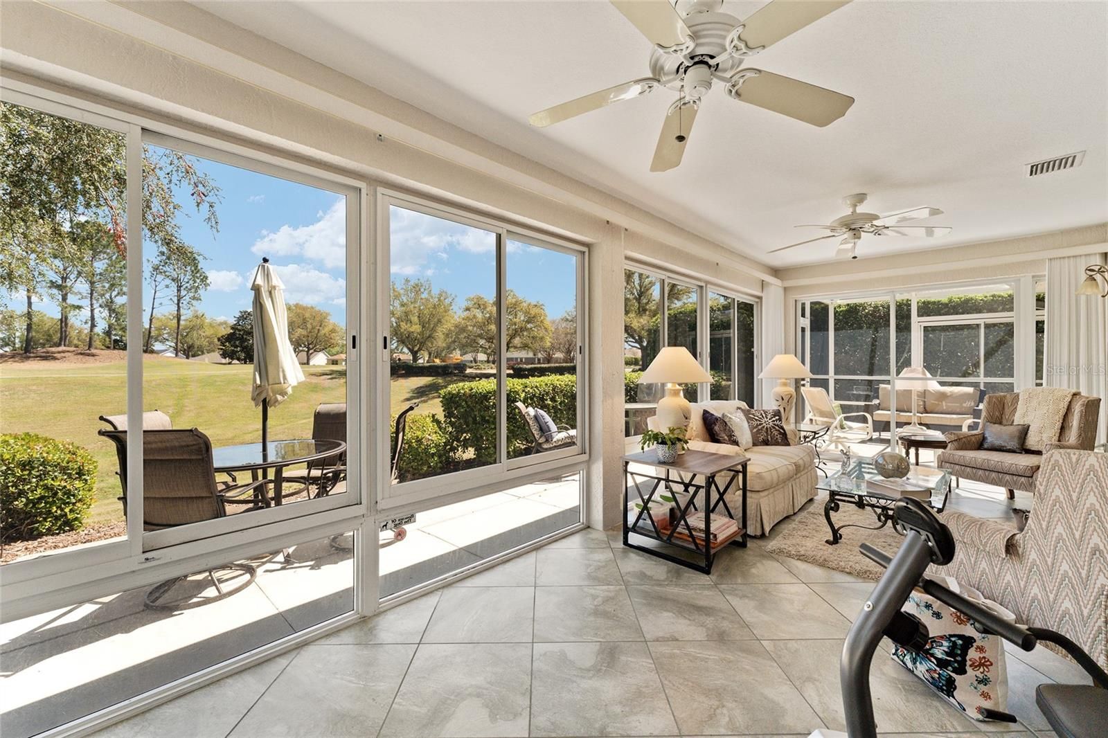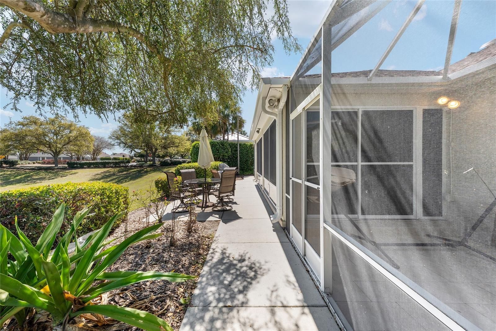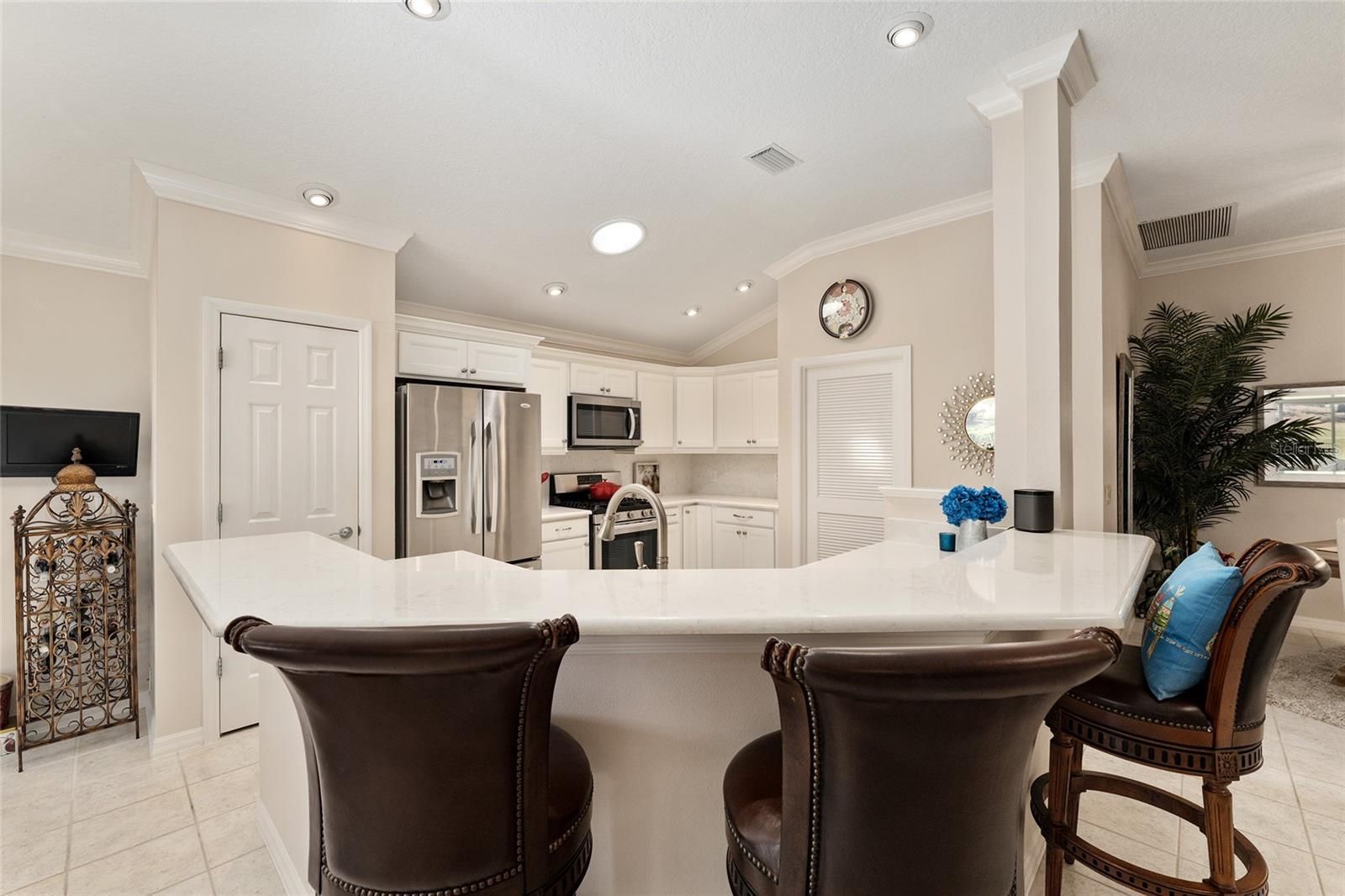 Welcome to this METICULOUSLY MAINTAINED LANTANA DESIGNER MODEL OFFERING BREATHTAKING VIEWS OF THE NANCY LOPEZ GOLF COURSE 7TH HOLE AT TORI PINES. IN THE VILLAGE OF CALUMET GROVE. This three-bedroom, two-bath home features an OVERSIZED 25X24 TWO-CAR GARAGE and charming curb appeal, highlighted by a decorative glass front door with sidelights and an inviting entry foyer. Inside, you’ll FIND TILE FLOORING throughout the main living areas and VAULTED CEILINGS that enhance the spacious feel. Plus, there’s no popcorn ceiling for a clean and modern look. The kitchen has been COMPLETELY UPDATED AND BOASTS QUARTZ COUNTERTOPS AND BACKSPLASH, ENHANCED STAINLESS STEEL APPLIANCES, INCLUDING A GAS RANGE AND NEW GARBAGE DISPOSAL, A PANTRY CLOSET, AND PULL-OUT SHELVES for easy storage. The guest wing features two spacious bedrooms, one with a BAY WINDOW and ample closet space. The updated guest bath showcases a TILED SHOWER. The master suite is a true retreat with, A LARGE WALK-IN CLOSET W/ A BUILT-IN CLOSET SYSTEM, and an elegant master bath complete with A JETTED SOAKING TUB, AN ENHANCED TILED SHOWER W/FRAMELESS GLASS SHOWER DOOR, and a separate water closet. ADDITIONAL UPGRADES INCLUDE CUSTOM WOOD MOLDING AND CORNICES, CUSTOM WINDOW TREATMENTS, AND UPDATED LIGHTING INSIDE AND OUT. Enjoy the comfort of an ENCLOSED HEAT AND AIR VENTED ALL-SEASONS LANAI WITH ACRYLIC WINDOWS ADDS TO THE SQUARE FOOTAGE OF 300SQFT AND TWO EXPANDED BIRDCAGES, perfect for relaxing or entertaining. The private outdoor area is surrounded by a convenient WALKWAY THAT ENCIRCLES THE ENTIRE HOME.. The OVERSIZED GARAGE offers plenty of storage with built-in cabinets, pull-down attic stairs, and floor attic space for ample storage. ***LOW BOND BALANCE $2,325.31, ROOF 2023, TANKLESS HOT WATER HEATER.*** Situated just moments from the FABULOUS, NEW “First Responders” Recreation Center with a Walk-in Pool, Pitch-N-Putt Golf Course, PICKLEBALL, and MORE! Close to Nancy Lopez Country Club, East access to Several Pools (Adult & Family), and Mulberry Grove Rec Center. Shopping, Banking, Restaurants, and the VA Center are nearby! This home provides both relaxation and recreation at your fingertips. Experience luxury living with stunning golf course views — schedule your private showing today!