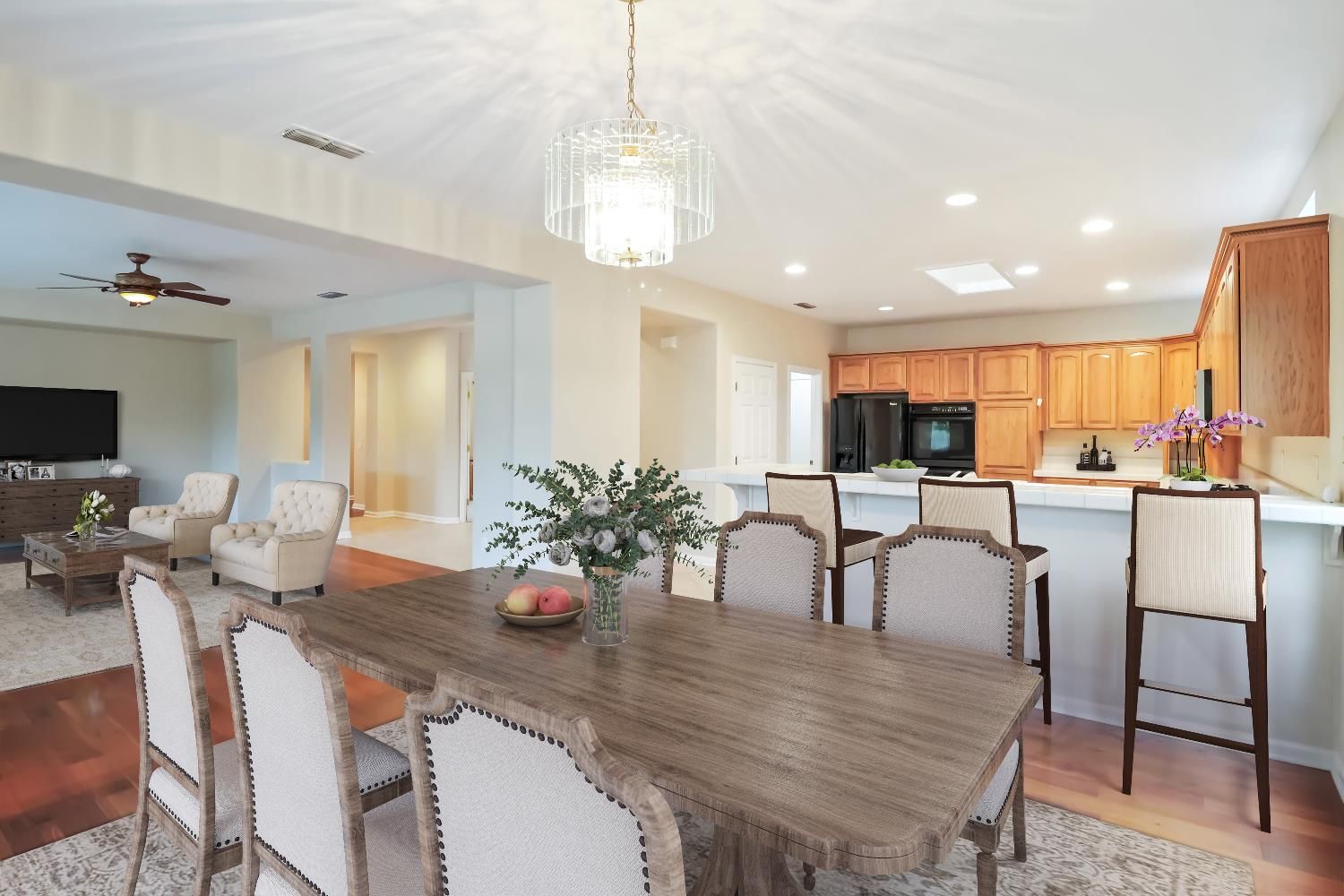 Welcome to this beautifully maintained Orchard Crest model! Featuring 2 bedrooms, 2 baths, plus a dedicated office and a spacious 2.5-car garage perfect for two cars and a golf cart! Inviting open concept floor plan highlighted by elegant walnut wood flooring, fresh interior paint (including garage) and new carpet (2023) that gives the home a bright, move-in-ready appeal. A newer energy-efficient HVAC system with complete duct replacement. The chef's kitchen featuring a center island ideal for gathering, a dining bar, and a spacious dining area large enough for a full-size table. The private office offers a built-in desk and bookshelves. Enjoy peace of mind knowing the home is free of Kitec plumbing and benefits from leased solar panels. Beautifully landscaped backyard oasis with covered patio. Sun City Lincoln Hills offers golf, fitness centers, pools, and social clubs all in a vibrant 55+ community!