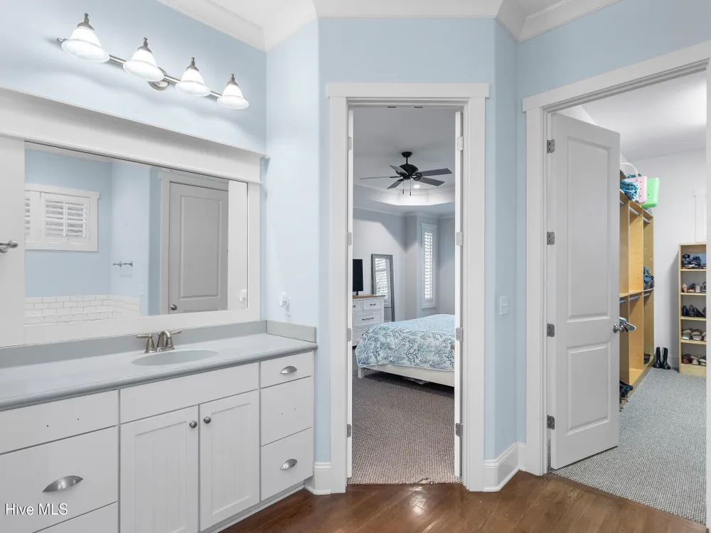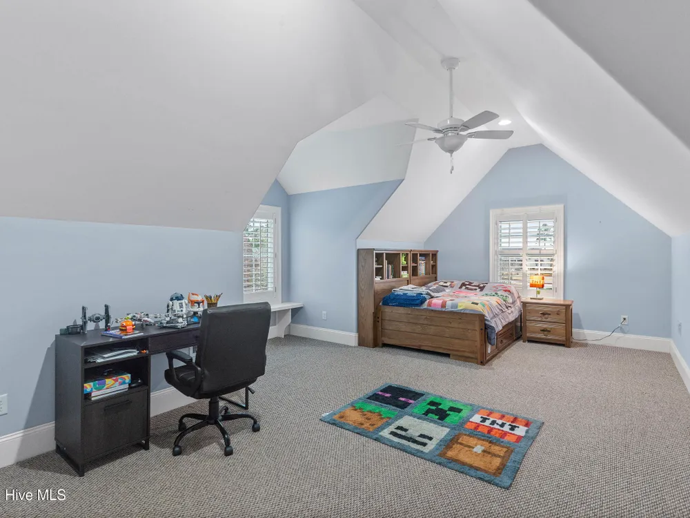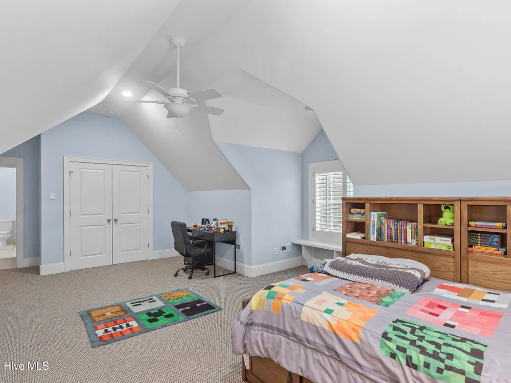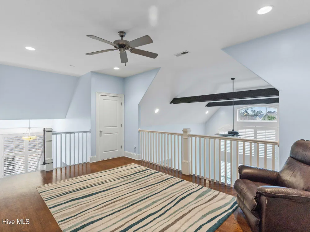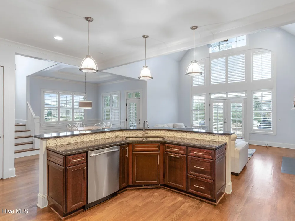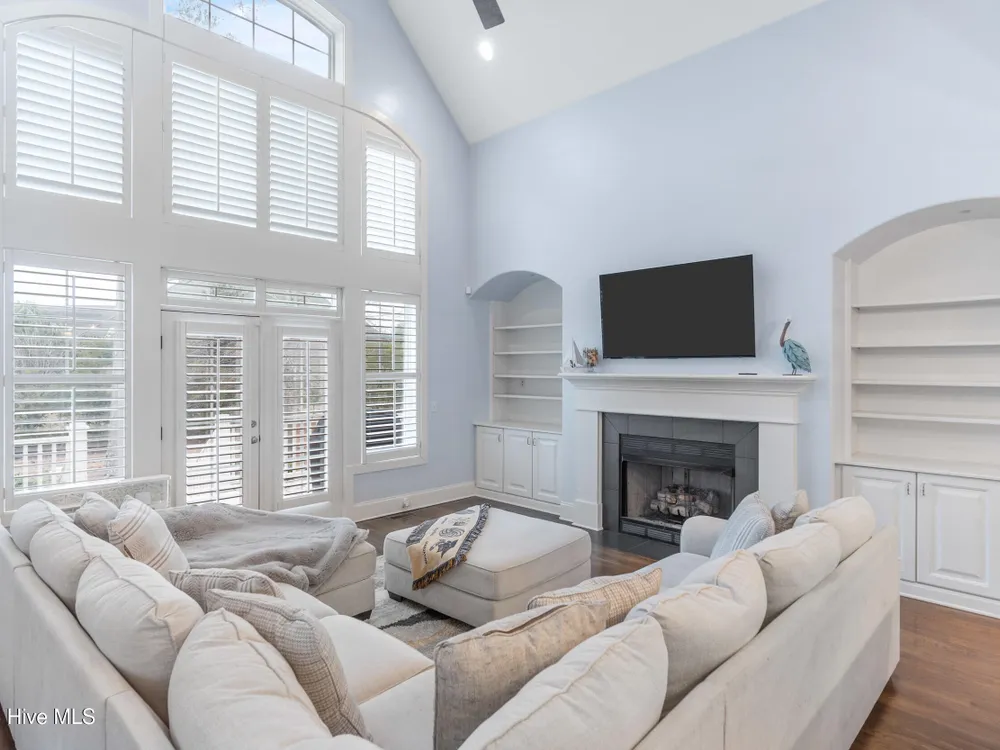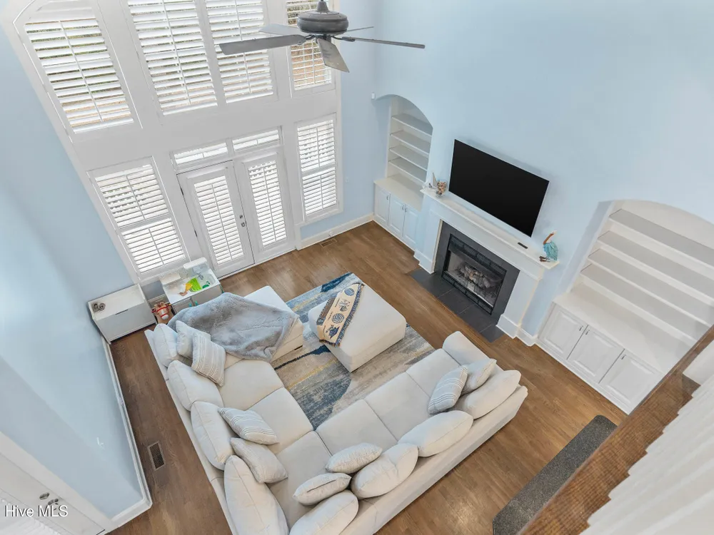 - Blinds/Shades, Solid Surface, Walk-In Closet(s), Walk-in Shower, Vaulted Ceiling(s), Pantry, Entrance Foyer, Master Downstairs, Kitchen Island, High Ceilings, Gas Log, Ceiling Fan(s), Bookcases