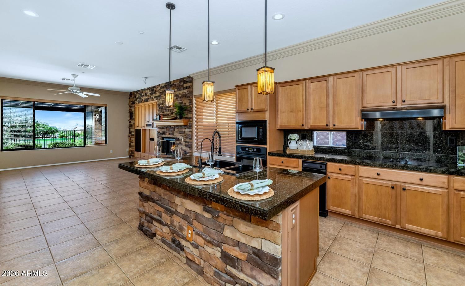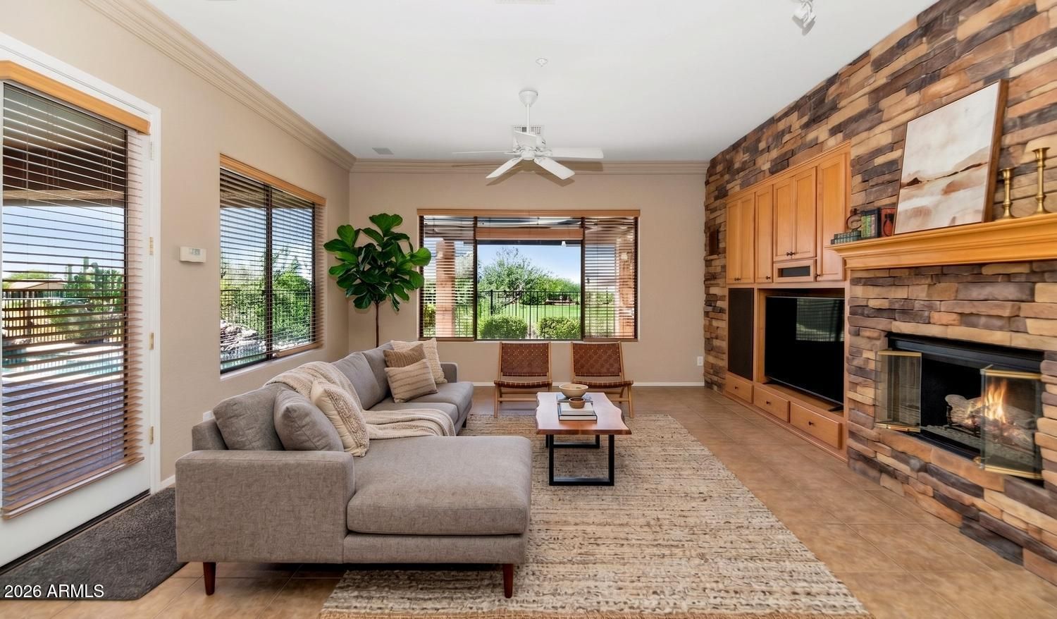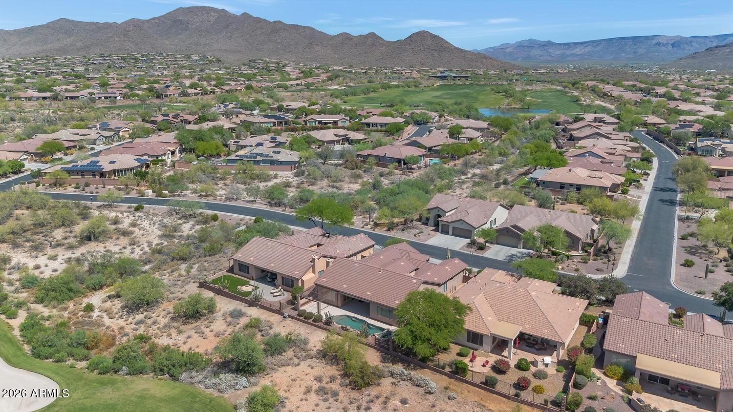 Impressive, elevated golf course and mountain view in Anthem Country Club. A backyard you can really enjoy with a pebble tec pool, spa & built-in BBQ. This popular floor plan blends indoor and outdoor living. Ideal for entertaining and relaxation amidst breathtaking scenery. Kitchen features breakfast bar, pendant lighting, two pantries and crown molding extending into the family room. Spacious setting with fireplace and built in cabinetry, view and access the covered patio. Appreciate all the owner's suite has to offer. Wake up to the spectacular view. Slip outside to take in the morning sun with patio access. Relax in soaking tub, dual vanities for convenience, and a spacious walk-in closet for ample storage. A perfect retreat for comfort and elegance! Plenty of flex space in living/ dining room and the office complemented with French doors. Don't miss this opportunity to have some of the most spectacular views in the country club! Anthem Golf & Country Club is in master planned community were you can truly enjoy resort style living all year. Gated community with 36 holes of championship golf, tennis and pickleball courts, fitness clubs, pools, and restaurants. Experience exceptional living in Anthem Country Club!