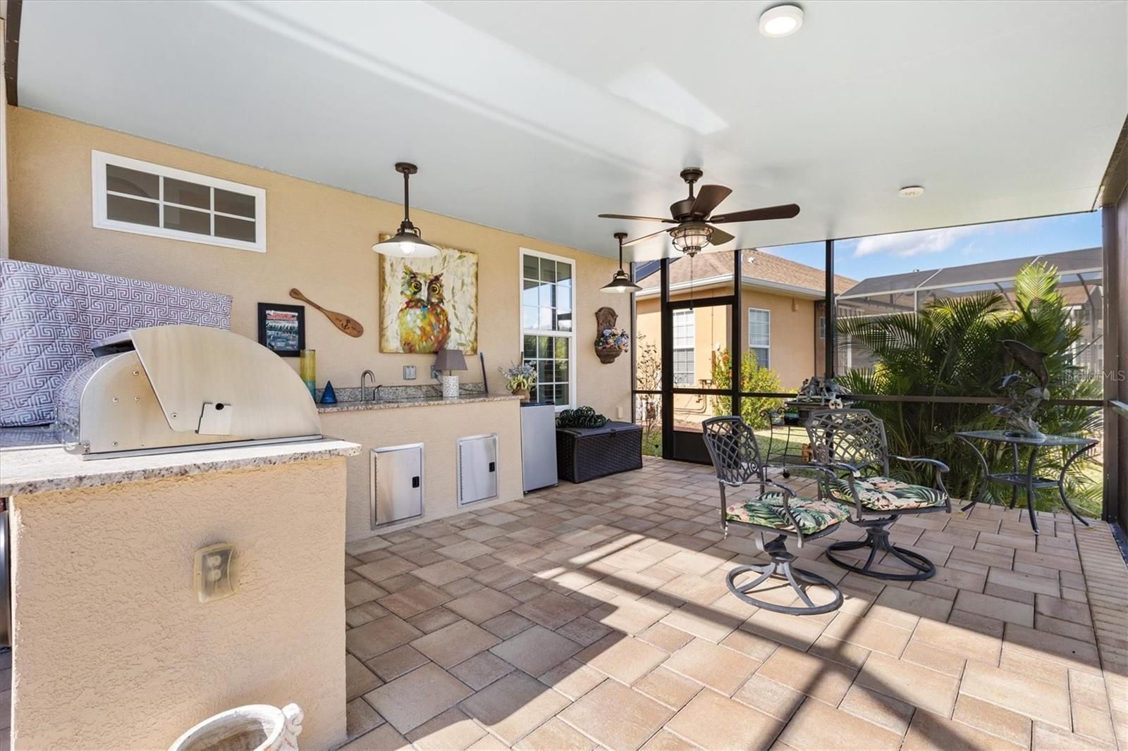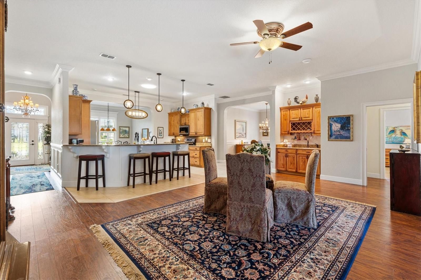 Welcome to your dream home in the Exclusive 55+ Gated Golf Community of STONECREST, where luxury, lifestyle, and location unite in perfect harmony! Ideally situated adjacent to THE VILLAGES, FLORIDA, this custom-built premier residence captures a spectacular WATER VIEW and offers the kind of peaceful sophistication you simply can’t live without. Wake each morning to breathtaking sunrises shimmering across the tranquil water, surrounded by a professionally landscaped yard adorned with elegant rock islands and stone accents that enhance the home’s remarkable curb appeal. Step through the etched-glass front door and be instantly captivated as your gaze flows effortlessly from the spacious living and family rooms to the magnificent lake view beyond. Inside, every detail showcases craftsmanship and comfort. Gorgeous LAMINATE and CERAMIC TILE Flooring, 10-FOOT CEILINGS, and a chef inspired Kitchen designed for both style and function. The kitchen Features rich Hickory cabinetry with self closing drawers, QUARTZ countertops, crushed GRANITE deep sink, STAINLESS STEEL Appliances, DRY BAR, Breakfast bar, and Kitchen island, all beautifully enhanced by exquisite lighting, solar tubes, recessed fixtures, and under-cabinet illumination that brings the glass stone backsplash to life. The outdoor living area is a true extension of the home’s elegance, Featuring BRICK PAVERS under a screened BIRDCAGE enclosure, and a covered OUTDOOR KITCHEN perfectly positioned to enjoy unobstructed water views, a space designed for both relaxation and entertaining, where every sunset feels like a private show! With a NEWER ROOF and HVAC system (both 2015), this home offers not just beauty, but confidence and peace of mind. Come experience the perfect blend of elegance, ease, and energy in a vibrant golf community brimming with amenities. This isn’t just a home...it’s the lifestyle you’ve been dreaming of.