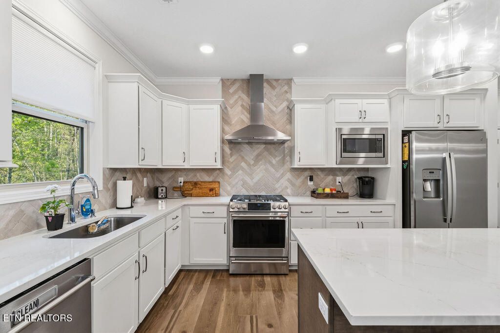 - Gas Range, Dishwasher, Disposal, Microwave, Refrigerator, Self Cleaning Oven