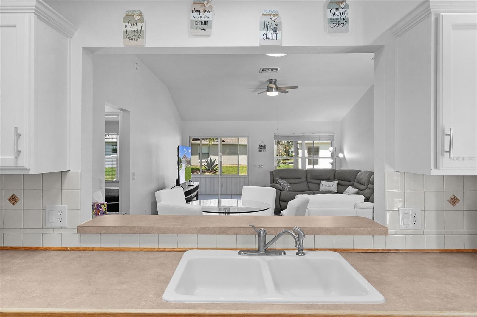 ~NO BOND~ ~2021 ROOF~ ~CUL-DE-SAC~ ~ROOM FOR POOL~ ~FRESHLY PAINTED INSIDE INCLUDING GARAGE~ ~ALL NEW LIGHTING~ ~ALL NEW CEILING FANS~ ~2019 HVAC~ ~2021 HOT WATER HEATER~ Welcome to this beautifully updated WISTERIA designer home in the Village of WOODBURY, ideally situated on an offset CUL-DE-SAC lot with inviting curb appeal. Outside the home, the driveway, walkway to the front entrance, patio and lanai floor have been painted to enhance the exterior of the property. Step inside to HIGH, VAULTED ceilings and a bright, open layout with CERAMIC tile in the entryway and LAMINATE flooring throughout the living room, kitchen, and dining area. The living room is both stylish and comfortable with UPDATED lighting, a NEW CEILING FAN, and a SOLAR TUBE for added natural light. The dining area continues that updated look with new modern lighting. The kitchen features LAMINATE countertops with BUTCHER BLOCK accents, dark appliances (including a GAS stove), a TILE BACKSPLASH, recessed lighting, CROWN MOLDING, ceiling fan, and another SOLAR tube, creating a functional, bright and cheerful space. The primary suite includes LAMINATE flooring, CROWN MOLDING, UPDATED lighting, a NEW CEILING FAN, and an OVERSIZED WALK-IN closet. The ensuite bath features CERAMIC tile flooring, a TILED WALK-IN shower with NEW FIXTURES, linen closet, DOUBLE SINKS, and TALL laminate countertops. Guest accommodation includes a 2nd bedroom with LAMINATE flooring, CROWN MOLDING, UPDATED lighting, ceiling fan, and a built-in closet with shelving, along with a guest bath featuring CERAMIC tile, a TILED tub/shower combo, linen closet, and TALL laminate countertops. The 3rd bedroom also features LAMINATE flooring, CROWN MOLDING, UPDATED lighting, ceiling fan, and a built-in closet, making it ideal for guests or a home office. The INSIDE LAUNDRY ROOM includes a laundry tub and cabinets for added convenience. Relax or entertain in the ENCLOSED LANAI with a newly painted floor, and 2 remote-controlled ceiling fans. The large outdoor space includes a tranquil WATERFALL FEATURE operated by remote control, a grilling area and ROOM FOR A POOL. The well-appointed garage features EPOXY FLOORING, cabinets, storage, and attic stairs. Additional carefully planned updates include all NEW LIGHTING and CEILING FANS throughout, NEW HARDWARE on all RECENTLY PAINTED kitchen, bath and laundry room cabinets; popcorn ceilings, including the garage, have been replaced with modern textured style finish; and all outlet covers and switches have been updated. This move-in ready home combines MODERN UPDATES, thoughtful details, and a desirable location, a fantastic opportunity to enjoy The Villages lifestyle. Minutes from Nancy Lopez Country Club, Mulberry Grove Rec Center and First Responders Rec center plus 4 executive golf courses! You are close to shopping with the Mulberry Grove Shopping Center nearby as well as the convenience of other nearby shopping (such as Publix and big box stores) medical facilities, entertainment, restaurants and both Lake Sumter Landing and Spanish Springs Town Squares!
