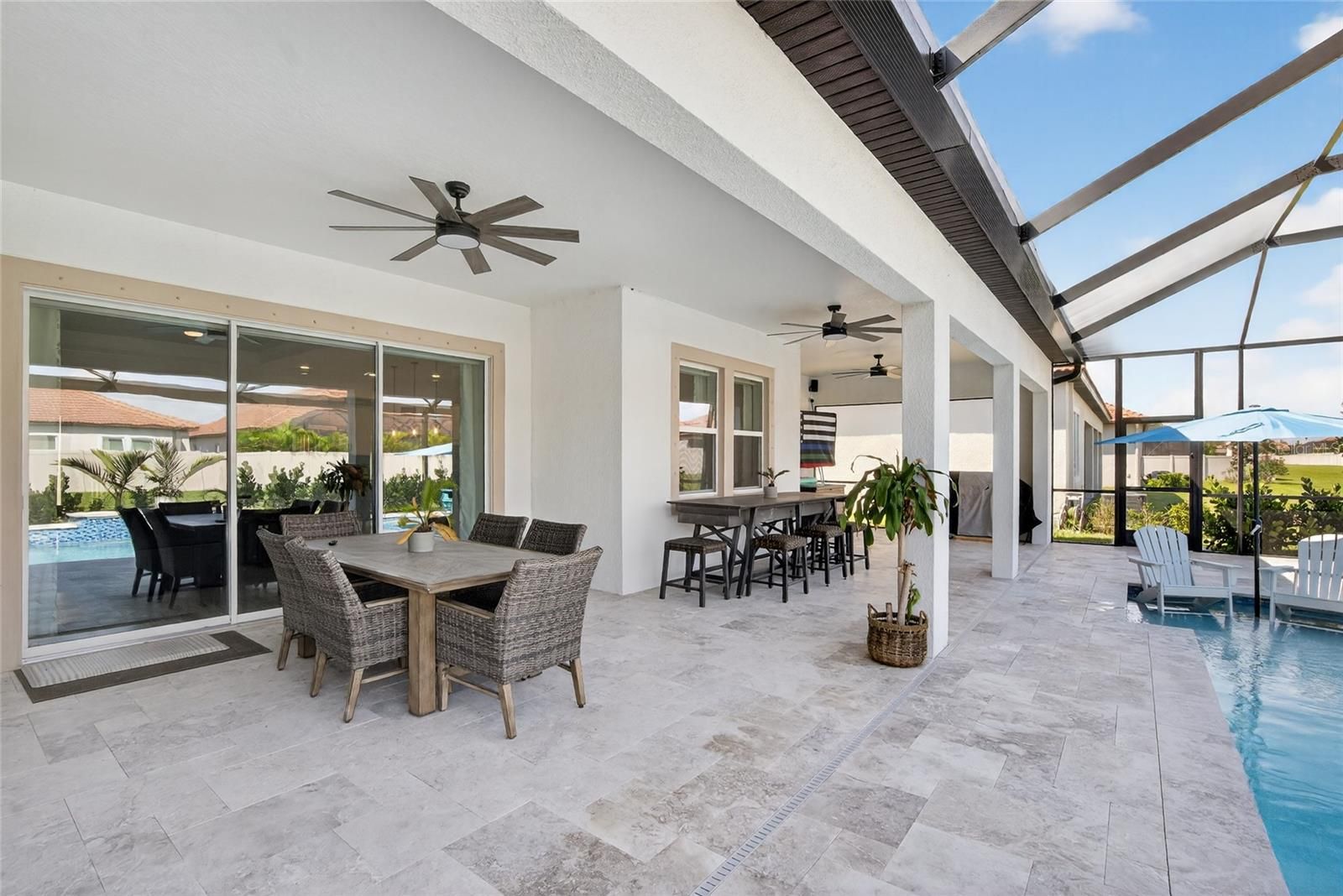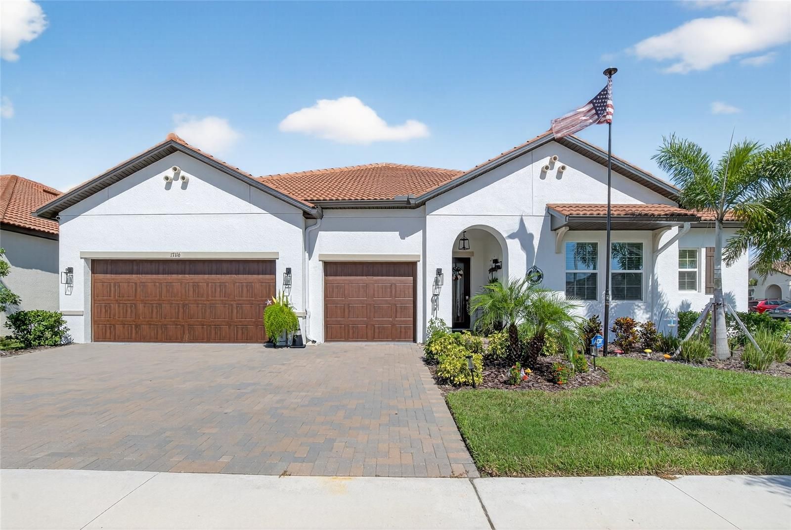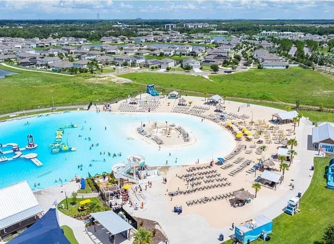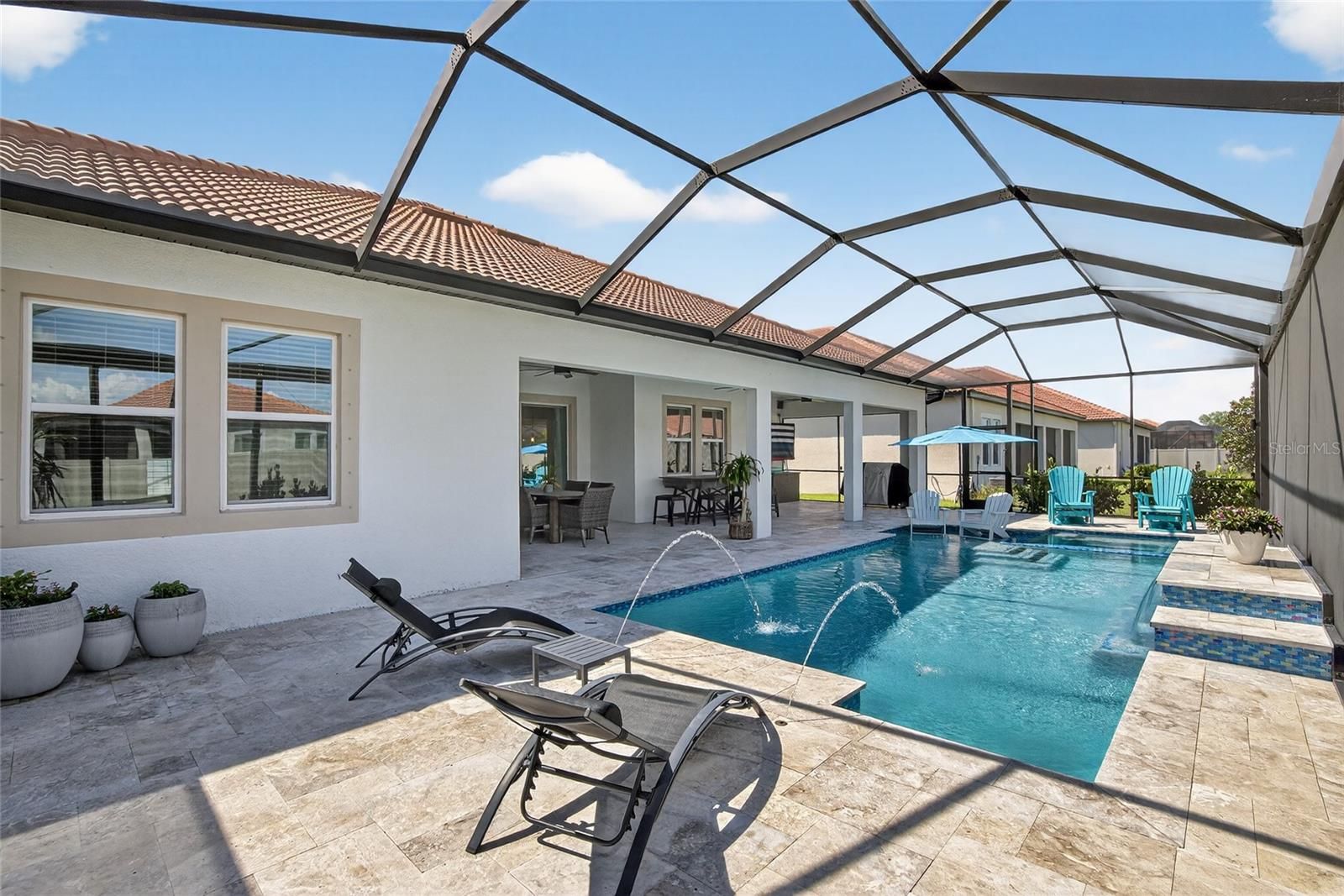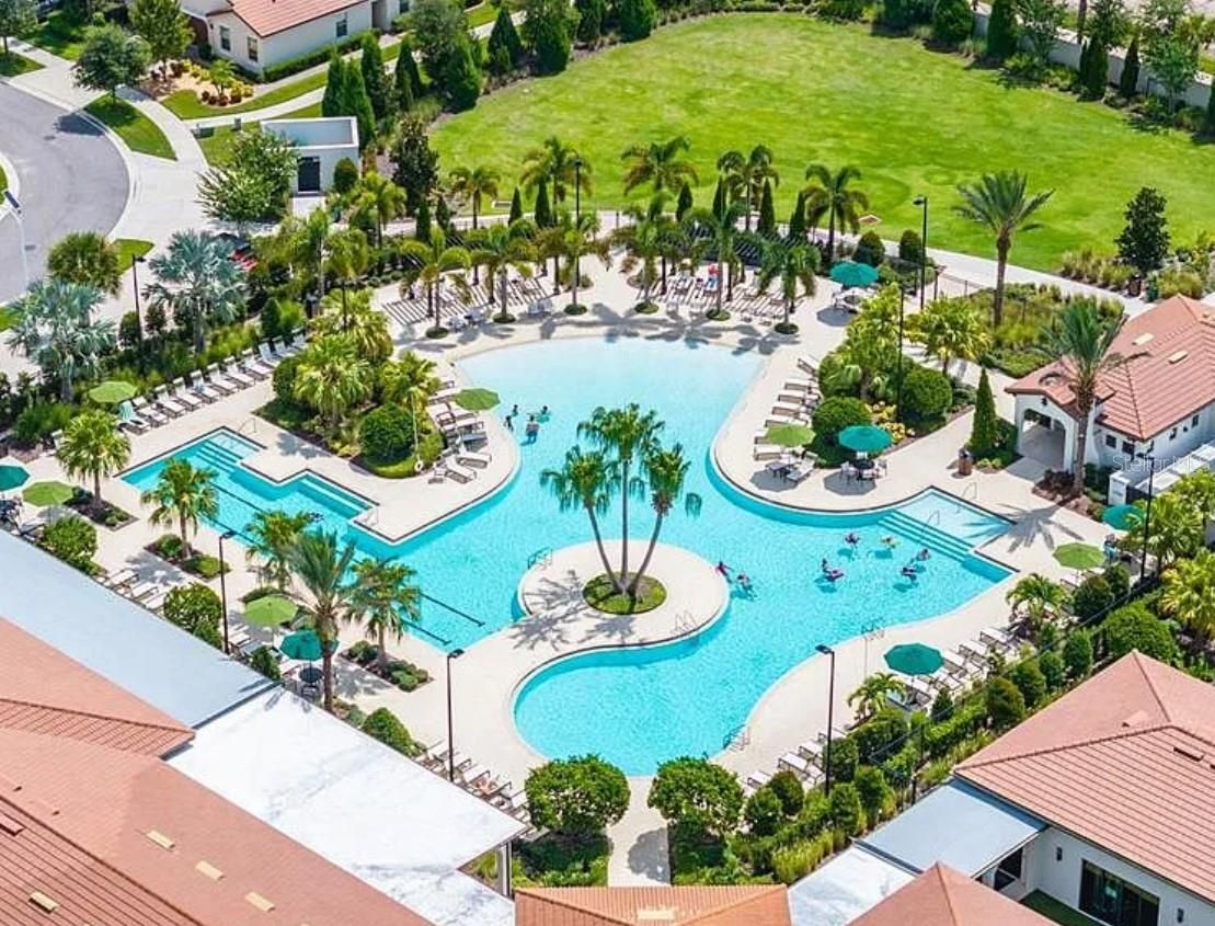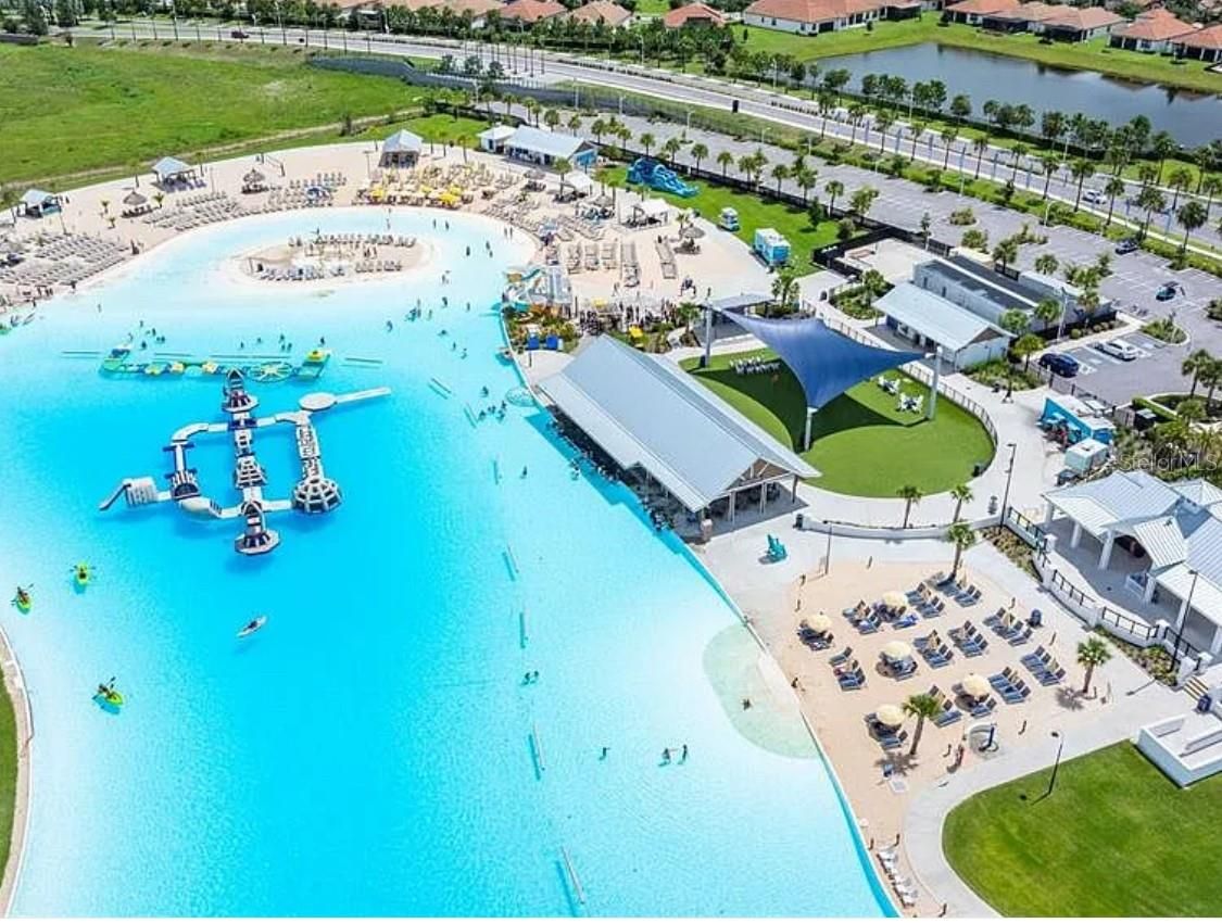 Experience resort-style living in Medley at Southshore Bay, a premier 55+ active adult community! This elegant 4-bedroom, 3-bathroom home with a 3-car garage showcases an open floor plan filled with high-end finishes and luxury tile plank flooring throughout. The heart of the home is the expansive kitchen, featuring quartz countertops, modern cabinetry, stainless steel appliances, a large center island, and both a walk-in and butler’s pantry for added storage and prep space. The kitchen flows effortlessly into the dining and living areas, creating the perfect atmosphere for everyday living and entertaining. The split-bedroom design offers privacy for everyone. The spacious primary suite includes a spa-like ensuite with dual vanities, a large walk-in shower, and an oversized walk-in closet with direct access to the laundry room. Bedrooms 2 and 3 share a convenient Jack-and-Jill bath, while Bedroom 4 is tucked away with a nearby full bath—ideal for guests or in-laws. Step outside to your private retreat featuring a luxurious pool and spa surrounded by a large screened-in patio with tiled flooring and cooling ceiling fans—perfect for relaxing afternoons or hosting gatherings year-round. Life in Medley is about more than just the home—it’s about the lifestyle. Residents enjoy both manned and unmanned gated entrances for secure, easy access, as well as golf-cart friendly paths and trails for exploring the community. The private clubhouse is the social hub, offering a café and bars, billiards, card and game rooms and a formal ballroom for special events. A monthly calendar of activities keeps the community buzzing with energy, offering everything from karaoke nights and comedy shows to live bands, as well as special interest and social groups—including men’s cigar gatherings and several hobby clubs that make it easy to connect with neighbors. Outdoor recreation abounds with pickleball and bocce courts, a dog park, a convenient dog bathing station, walking trails, and a resort-style heated pool—all just steps from the incredible 5-acre Metro Lagoon by Crystal Lagoons. With HOA fees covering internet, basic cable and lawn care, you can spend less time on chores and more time enjoying the endless activities at your fingertips. This move-in ready home offers the perfect blend of luxury, convenience, and community—where every day feels like a vacation.
