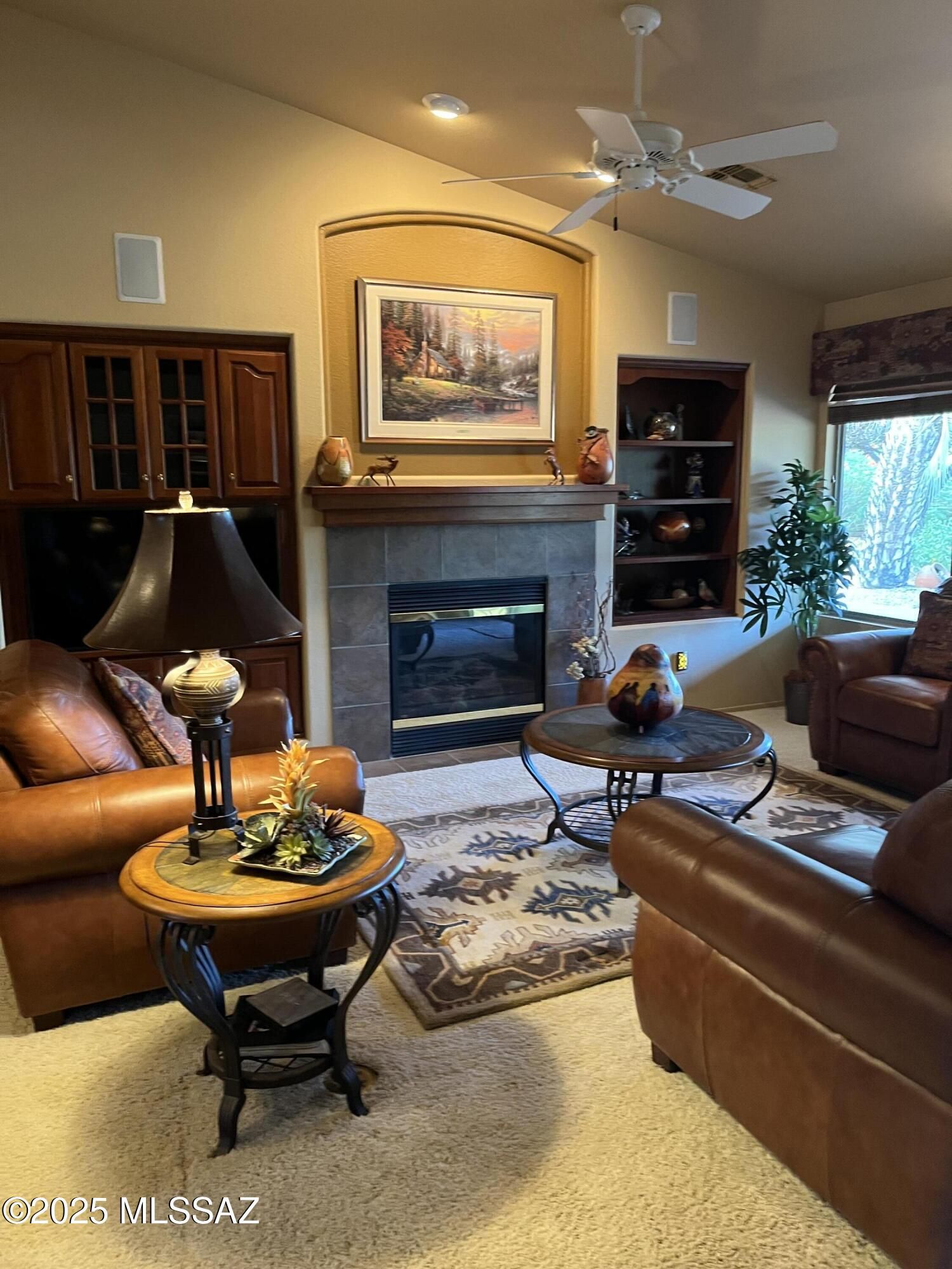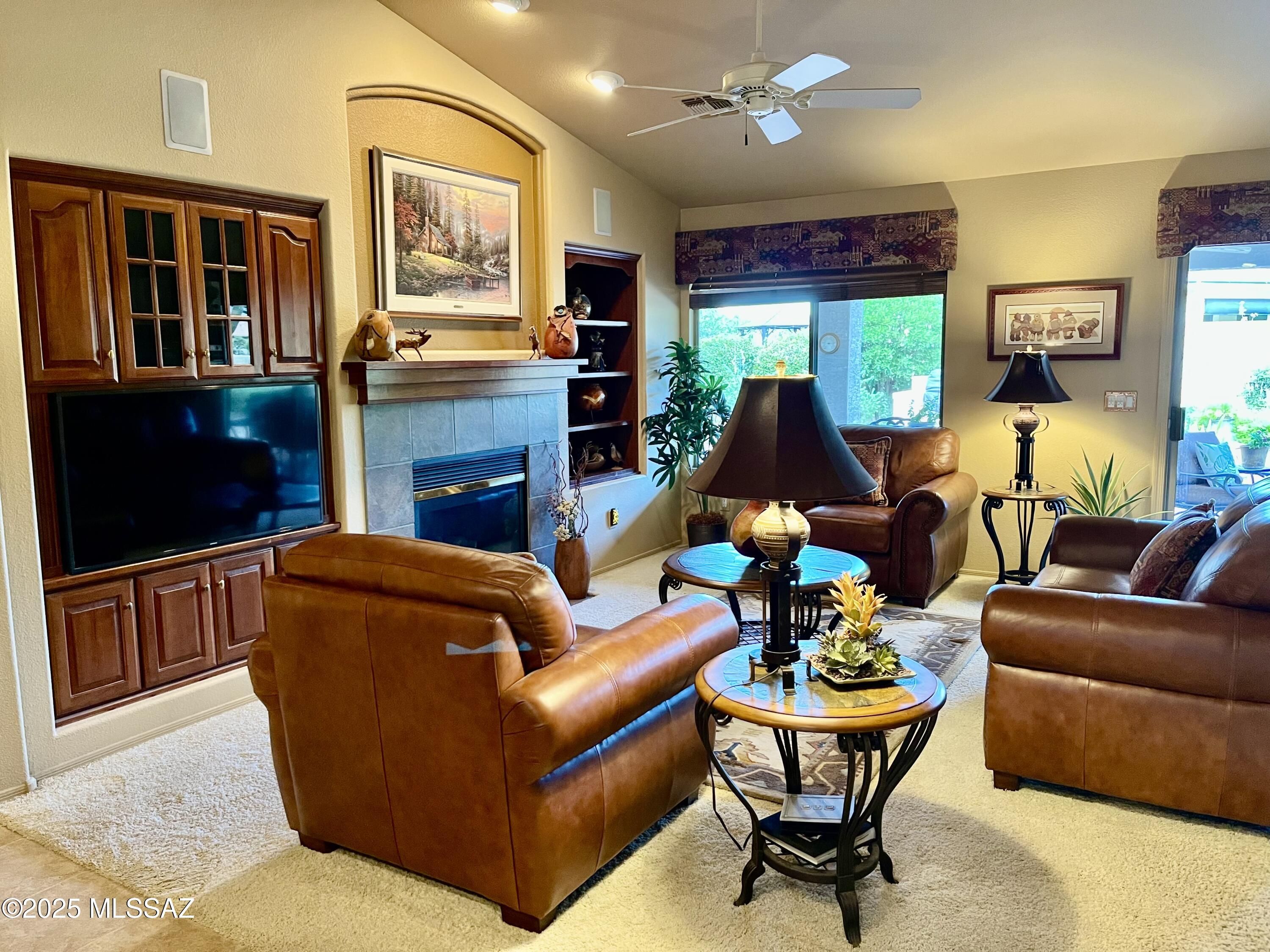 Professionally landscaped home offers plenty of space for entertaining, with welcoming front courtyard. Split floor plan offers 2 bedrooms PLUS a den. The kitchen features an island, convection oven, breakfast nook & plantation shutters. Great room with gas fireplace & beautiful custom carpentry/built-ins add warmth & character. Spacious primary suite with sitting area & large walk-in closet. Generous laundry room with cabinets. New HVAC (2024), roof (2018), 2.5-car garage with excellent storage. Many furnishings available - a golf cart too. Oasis backyard is designed for outdoor living with extended covered patio, built-in BBQ, water feature, brick pavers. Quail Creek is more than a neighborhood--it's a lifestyle. Residents enjoy pickleball golf, fitness & a wide variety of clubs.