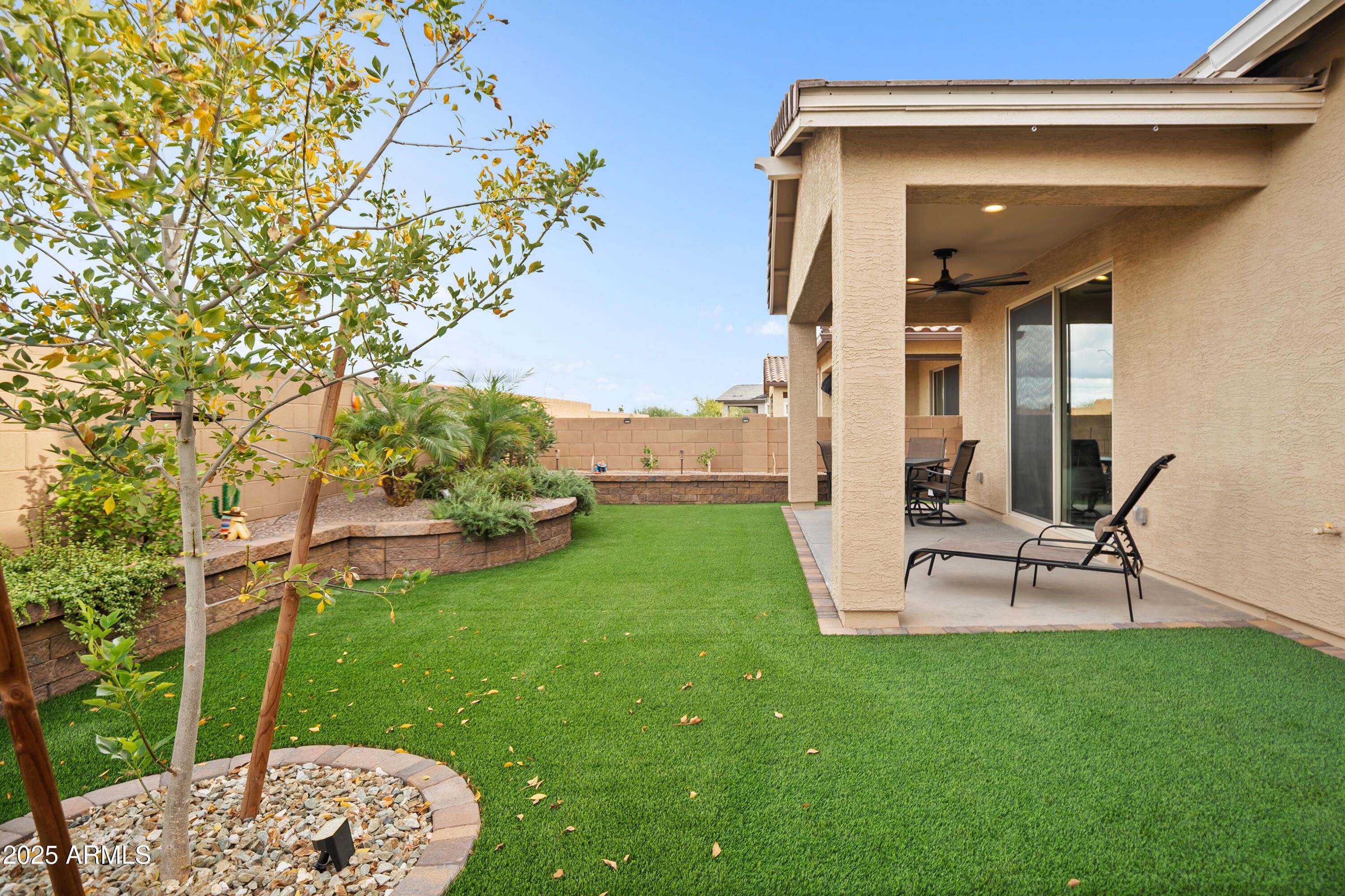 Charming single-owner 2-bedroom, 2-bath home in the 55+ community of Heritage in Surprise. The spacious great room overlooks a private backyard, while the kitchen features rich brown cabinetry, quartz counters, a gas stove, and stainless steel appliances. A cozy dining nook offers a custom feature wall and stylish lighting. The large primary suite includes a custom barn door, dual sinks, vanity area, and a tiled walk-in shower. Enjoy the covered patio, low-maintenance turf, and raised planters with mature shrubs and trees. Community amenities include a beautiful clubhouse, heated pools, pickleball courts, and dog parks—perfect for active adult living.