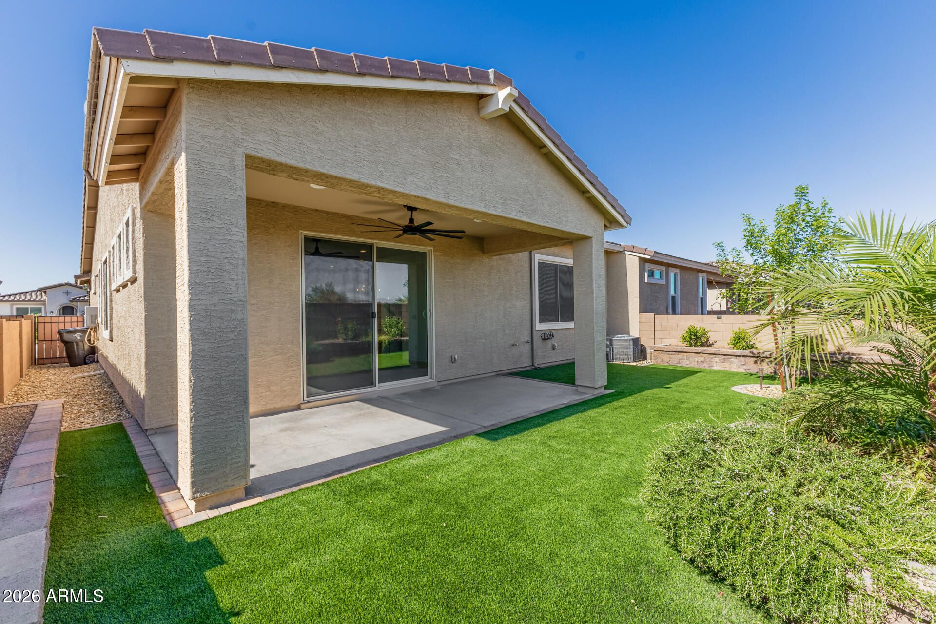 ***PRICED TO SELL! *** More upgrades than the new builds! This 2023 SmartHome, located in a quiet 55+community was gently lived in by part-time owners. Enter through a beautiful custom steel door into a thoughtfully upgraded home featuring high ceilings, large wood ceiling fans, oversized tile flooring, dimmer switches, and upgraded carpet in the bedrooms. The kitchen offers dark wood cabinets with crown molding, stainless steel bar pulls, an undermount sink, newer appliances includes a gas stove, and quartz countertops that double as a breakfast bar. An open den with a board and batten wall can easily function as a dining area. The large laundry room provides shelving for storage. Owned water softener and tankless gas water heater is in the garage. The spacious primary suite features a stylish shiplap accent wall and backyard views providing a restful retreat. The ensuite bath includes a custom barn door, large walk-in tiled shower with grab bars, dual sinks with a step-down quartz vanity, framed mirrors, and oversized walk-in closet. A secondary bedroom and full bath are privately located toward the front of the home. Enjoy a beautifully landscaped backyard with raised planters, mature plants, premium artificial turf, brick pavers, custom lighting, and a covered patio. The clubhouse with heated pools, pickleball, fitness center, fishing lake, putting green and more is walking distance from the home. Shopping, dining, and freeways are minutes away!!