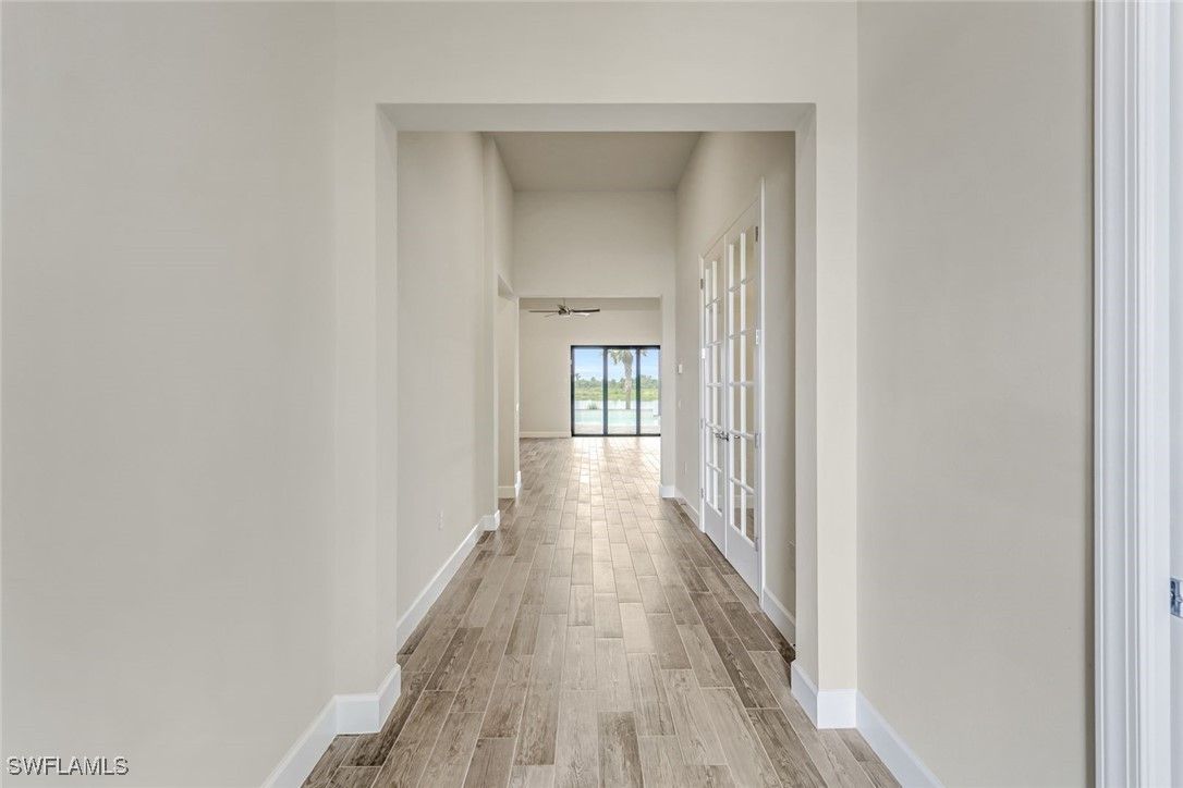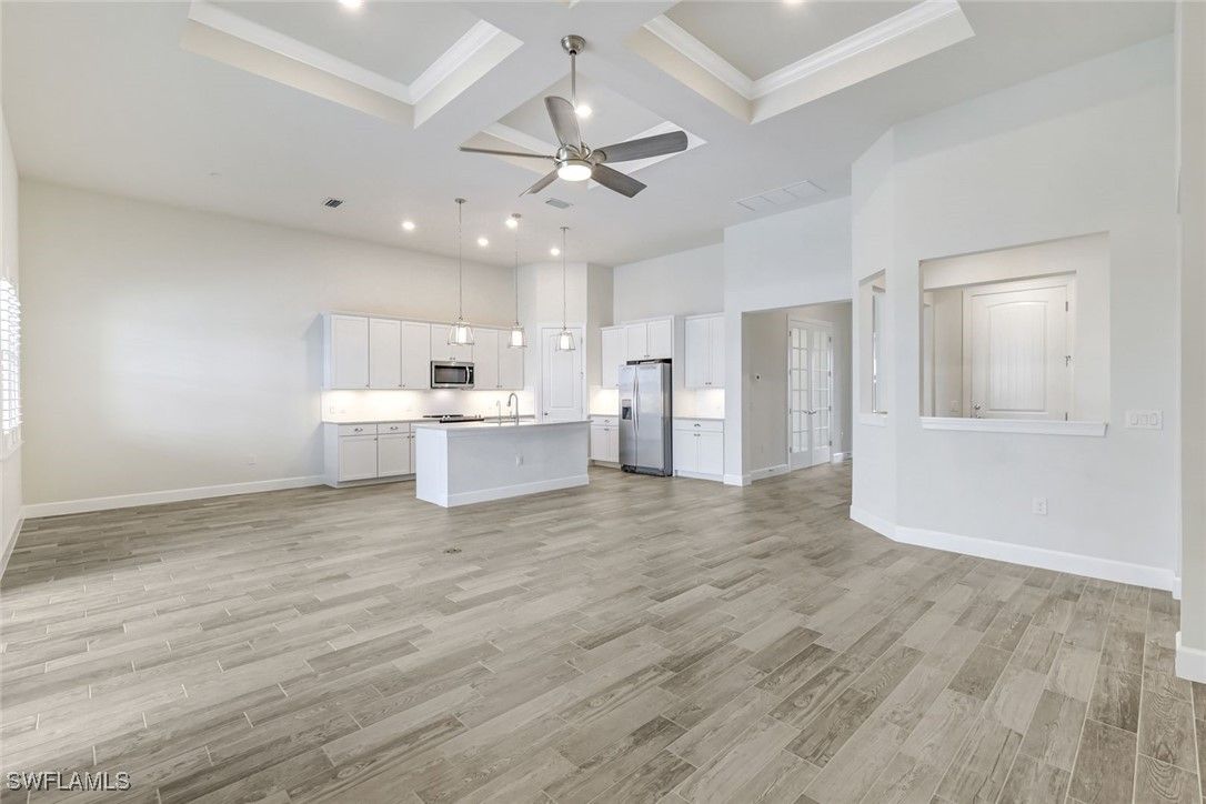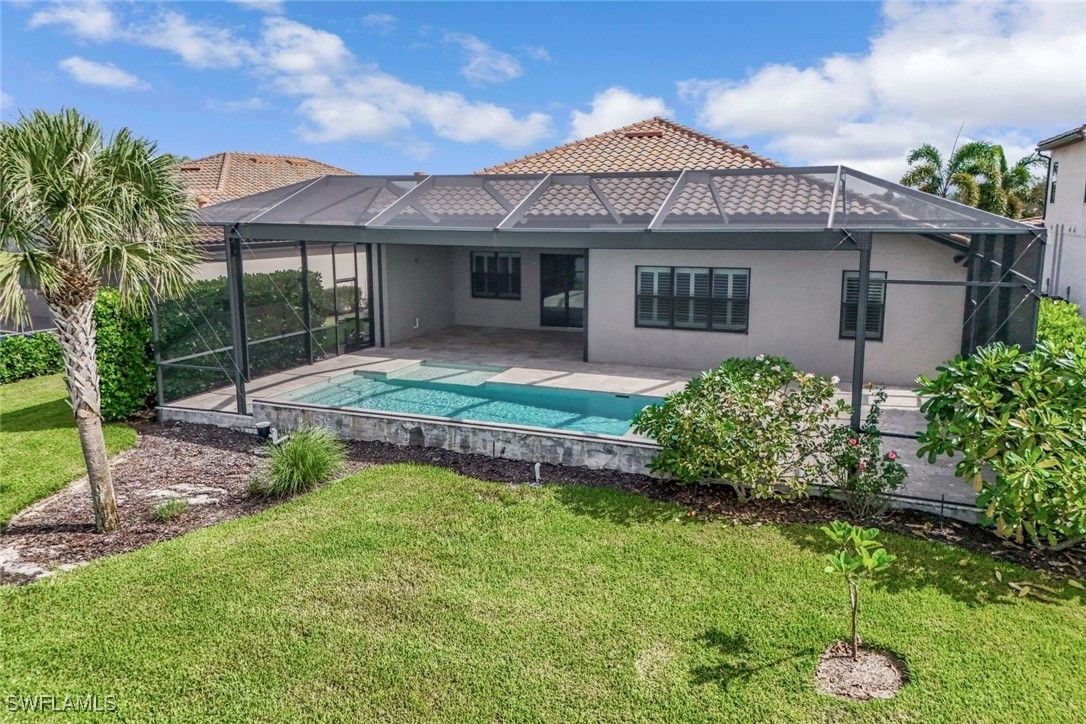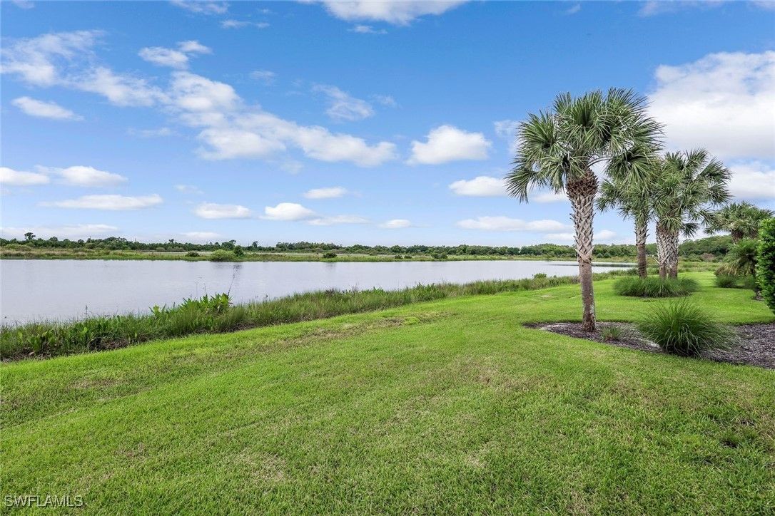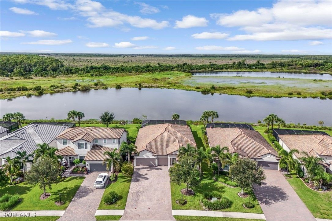 Exquisite Lakefront Retreat in The Place at Corkscrew! Welcome to this stunning 4BR + Den/Office, 3BA single-story home where timeless elegance meets modern luxury. Perfectly positioned on an oversized waterfront lot, this residence captures breathtaking lake views and showcases a heated saltwater pool & spa framed by lush tropical landscaping. From the very first glance, the professional landscaping, and custom glass entry door set the stage for the beauty within. Step inside to discover soaring 12' coffered ceilings, and plank tile flooring that flows seamlessly through the open-concept living spaces. Walls of 10' sliding glass doors invite natural light and create a graceful connection to the outdoors. The gourmet kitchen is a showpiece, featuring quartz counters, pull-out shelves and under-cabinet lighting, premium Whirlpool appliances, a custom walk-in pantry, and an oversized island designed for gatherings. The serene primary suite offers a true retreat with a tray ceiling, plantation shutters, and a spa-inspired bath boasting a soaking tub, frameless glass shower, and expansive walk-in closet. Outdoors, indulge in your private oasis with a spacious covered lanai, picture window screen, Storm Smart shade, and the sparkling heated saltwater pool & spa—all designed to maximize relaxation and panoramic lake views. Additional luxuries include a French-door den, a versatile planning center, and an epoxy-coated 3-car garage. Life at The Place at Corkscrew is unparalleled, offering resort-style amenities: a zero-entry lagoon pool with a 100-ft waterslide, state-of-the-art fitness center, tennis, pickleball, bocce, sand volleyball, dog park, playground, and multiple dining options including the Barefoot Bar & Grill, Bourbon Bar, and café. Conveniently located near a new Publix Plaza, RSW Airport, Miromar Outlets, and Gulf Coast Town Center, this home embodies the perfect blend of luxury, comfort, and lifestyle.