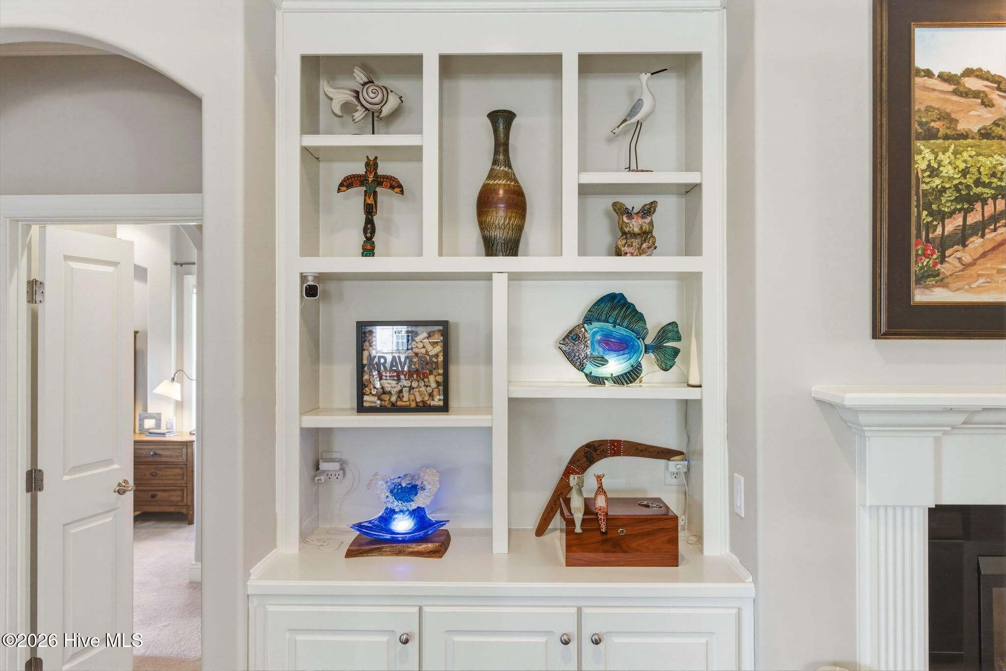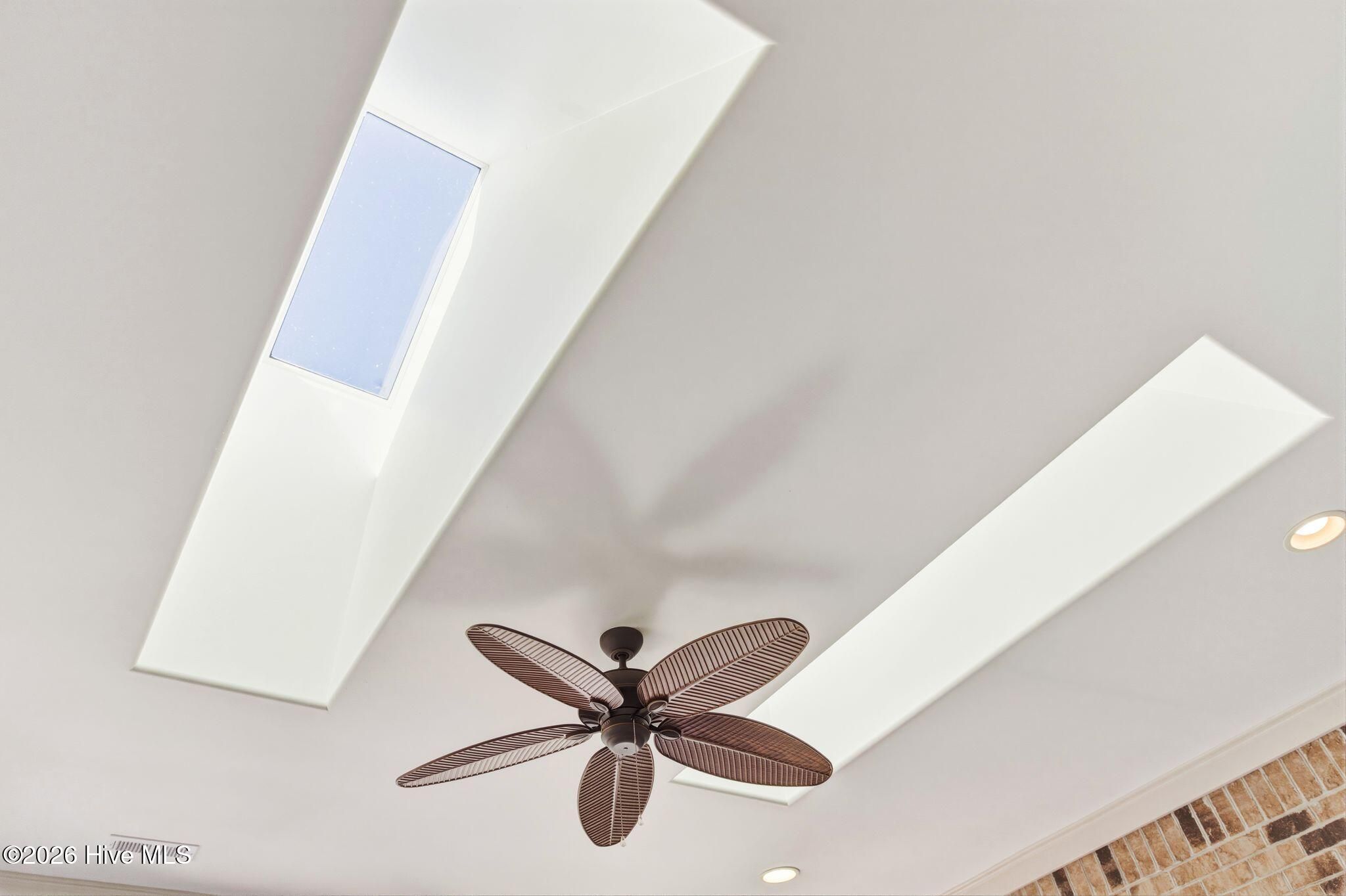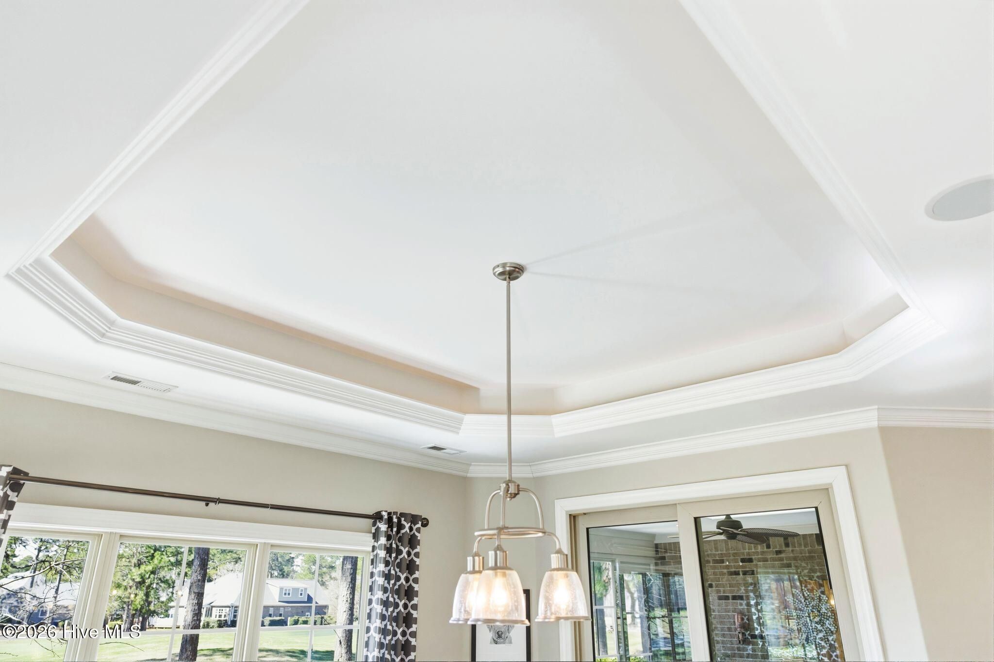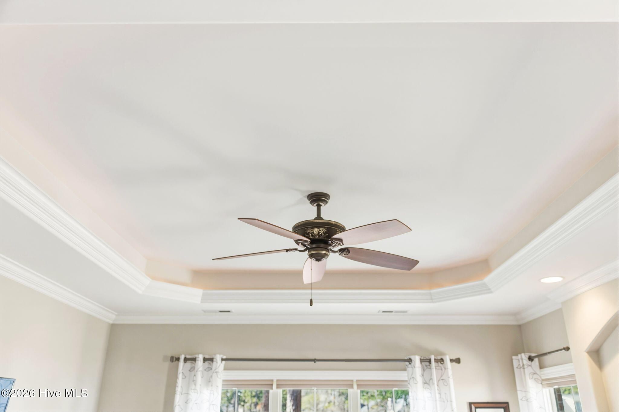 - Master Downstairs, Tray Ceiling(s), High Ceilings, Bookcases, Kitchen Island, Ceiling Fan(s), Walk-In Shower