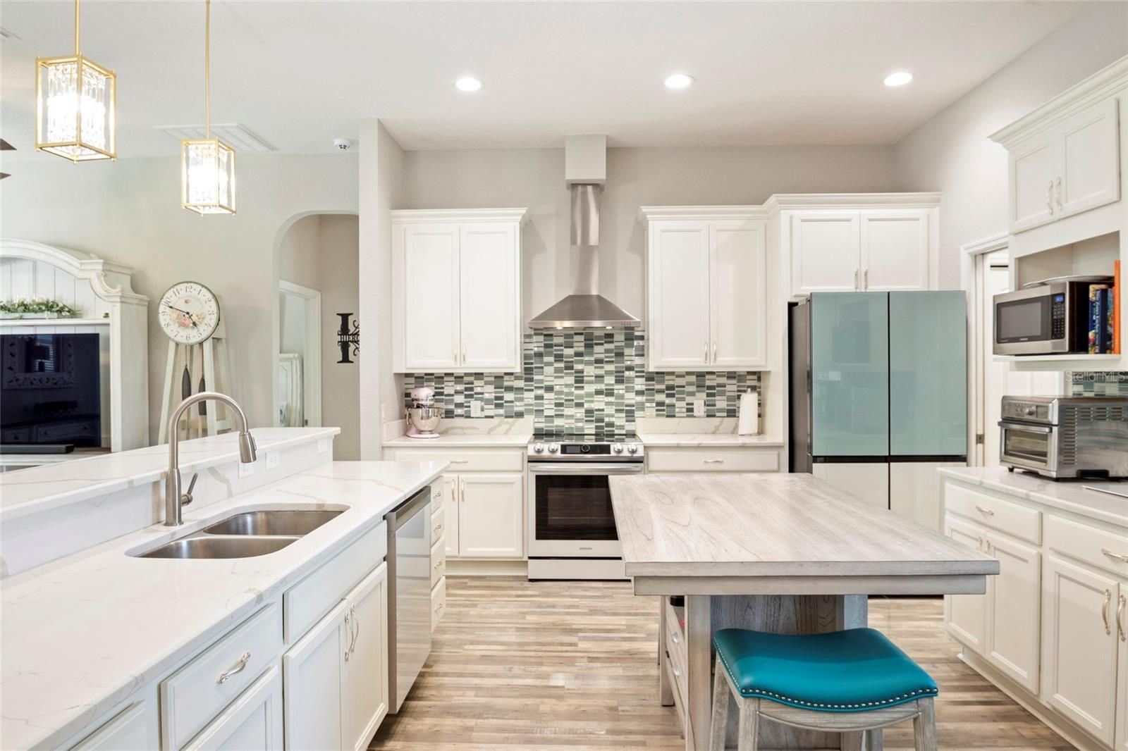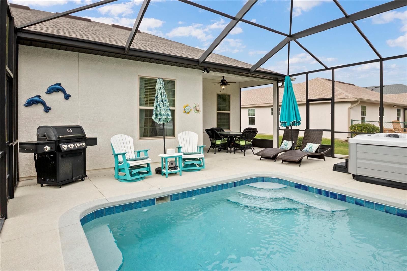 SPECTACULAR 3/2 Sycamore with a SALTWATER POOL, large screened in lanai, and PRIVATE WOODED VIEW in 55+ STONECREST golf community. This home has $100,000 in builder upgrades that you can see and feel the minute you walk in the front door: gorgeous tile, unique lighting, high ceilings, quartz counters, 42" white cabinets with unique pulls in the kitchen, smart appliances (2023), coffee bar, kitchen island, screened lanai pool oasis. This OPEN CONCEPT home is a MUST SEE! Neutral paint and flooring make this move in ready home a blank canvas for your own personal style. The primary suite has high ceilings, a walk in closet with built in closet organizers and an amazing ensuite bathroom with dual sinks, tiled walk-in shower, and a private water closet. Guests will be comfortable on the other side of the home where two guest bedrooms have high ceilings, built in closets, and neutral paint. The guest bathroom is beautiful and functional with a tiled walk-in shower. The indoor laundry area with full size washer and dryer is off the kitchen. This room also boasts extra cabinets and a built-in pantry/closet for all of your storage needs. Looking for a large garage? This home has a 22’x22’ two-car garage with space for cars, golf cars, and more. One the exterior, this stucco home has irrigation, professional landscaping, and gutters all around. There is a patio out front to enjoy sunsets. Roof (2019) Water Heater (2019) HVAC (2019). This gem is MOVE IN READY with QUICK CLOSE POSSIBLE. STONECREST IS A 55+ GOLF COURSE GATED COMMUNITY WITH CLUBHOUSE, RESTAURANT, INDOOR AND OUTDOOR POOLS, PICKLEBALL, TENNIS, WALKNG AND BIKING TRAILS, FITNESS CENTER, CLUBS, ACTIVITIES AND MORE. It is close to shopping, restaurants, medical facilities, and is only 84 minutes north of Orlando. Schedule a showing of this fabulous home and begin living your Florida dream!