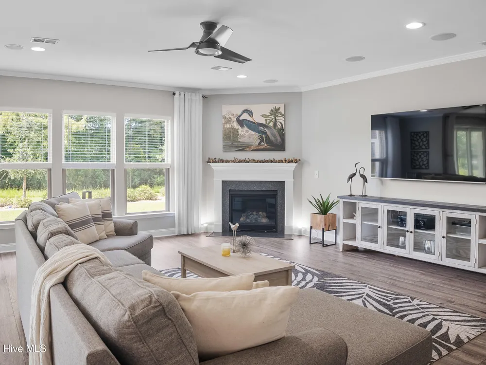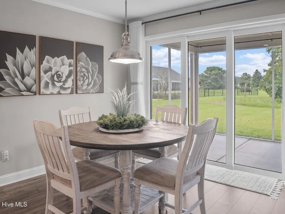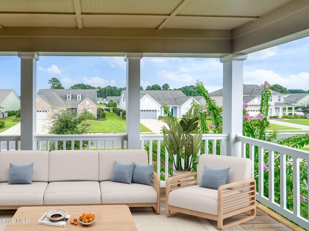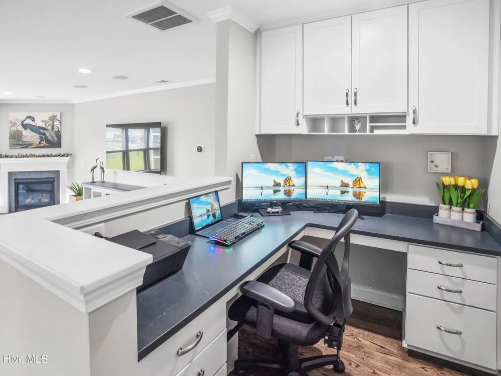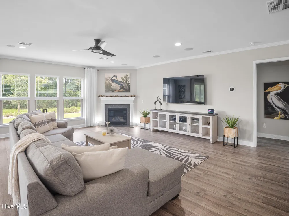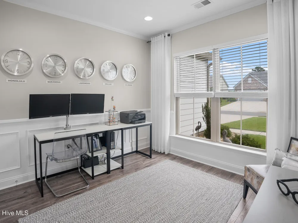 Experience refined coastal living with the Vanderbilt floor plan by Pulte Homes, celebrated for its spacious design and thoughtful details. This 4-bedroom, 2.5-bath residence offers over 3,400 sq. ft. of living space, blending open-concept areas with private retreats and ample space for everyday living. Best of all, this home is located OUTSIDE the flood zone and does not require flood insurance. The property is beautifully landscaped and set along a serene community pond, creating a picturesque backdrop. The main level features a 19' x 26' living room designed for gatherings, seamlessly flowing into a chef's kitchen with an expansive island, abundant cabinetry. Direct access to the dining room through a convenient butler's pantry from the kitchen. At the entrance to the home is a library / study with glass door entry. Large sliding glass doors lead to a covered screened porch extending the living space outdoors.. A unique elevated office overlooking the living room provides the perfect spot for additional workspace while staying connected to the heart of the home. The owner's suite, approximately 16' x 15', offers two generous closets, a spa-inspired bath with a walk-in tile shower, soaking tub with tile surround, and dual vanities topped with granite. Upstairs, the versatile bonus room is ideal as a game room, family room, or hobby space, complemented by 3 guest bedrooms one of which is access to the covered balcony. A 3-Car garage provides ample storage for a multiple cars as well as golf cart, bikes, or recreational vehicles. Located in the gated Crow Creek Golf Community, residents enjoy resort-style amenities including an 18-hole championship course, clubhouse, fitness center, outdoor pool, and walking trails. Just minutes from the shops and dining of Calabash, and a short drive to Sunset and Ocean Isle Beaches, this home checks all the boxes for an ideal coastal lifestyle.