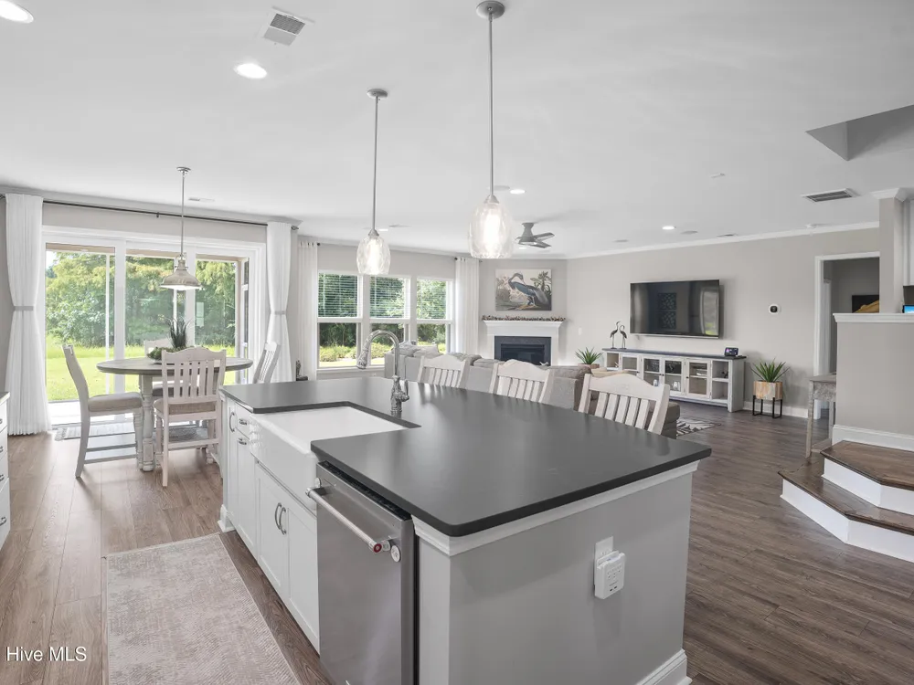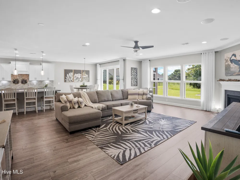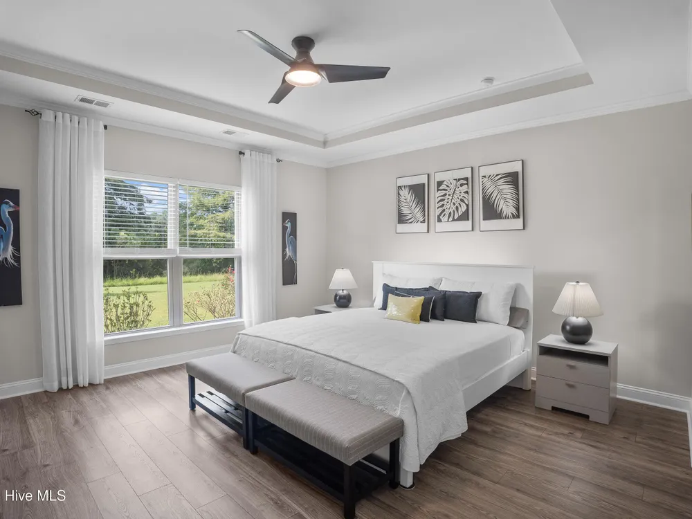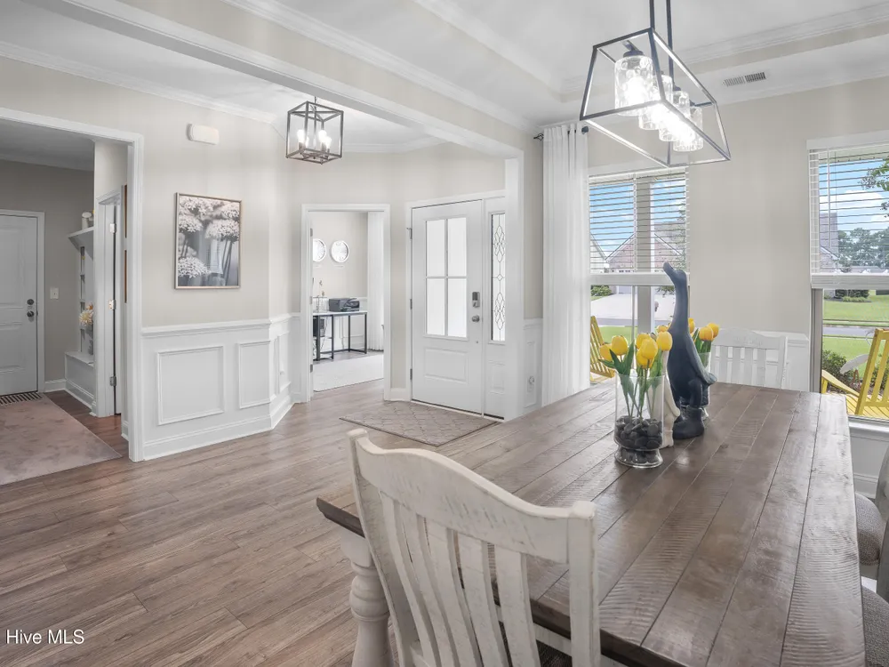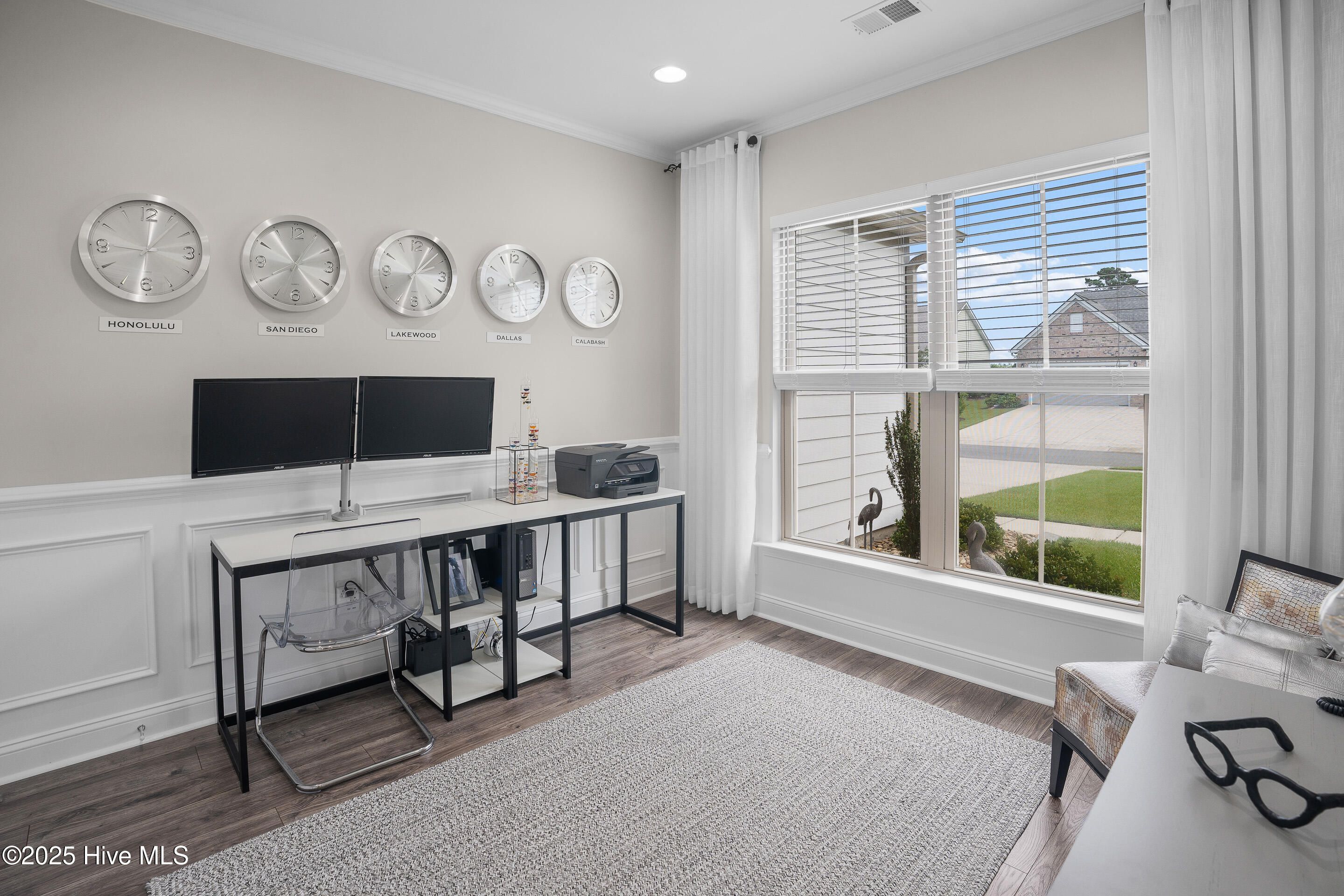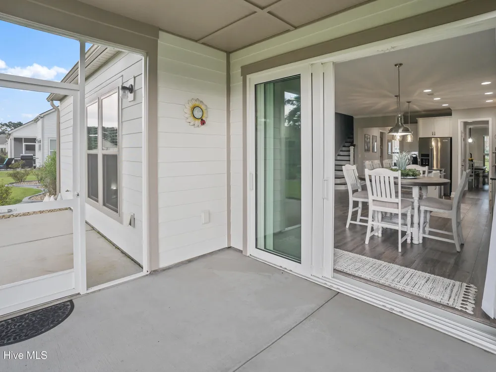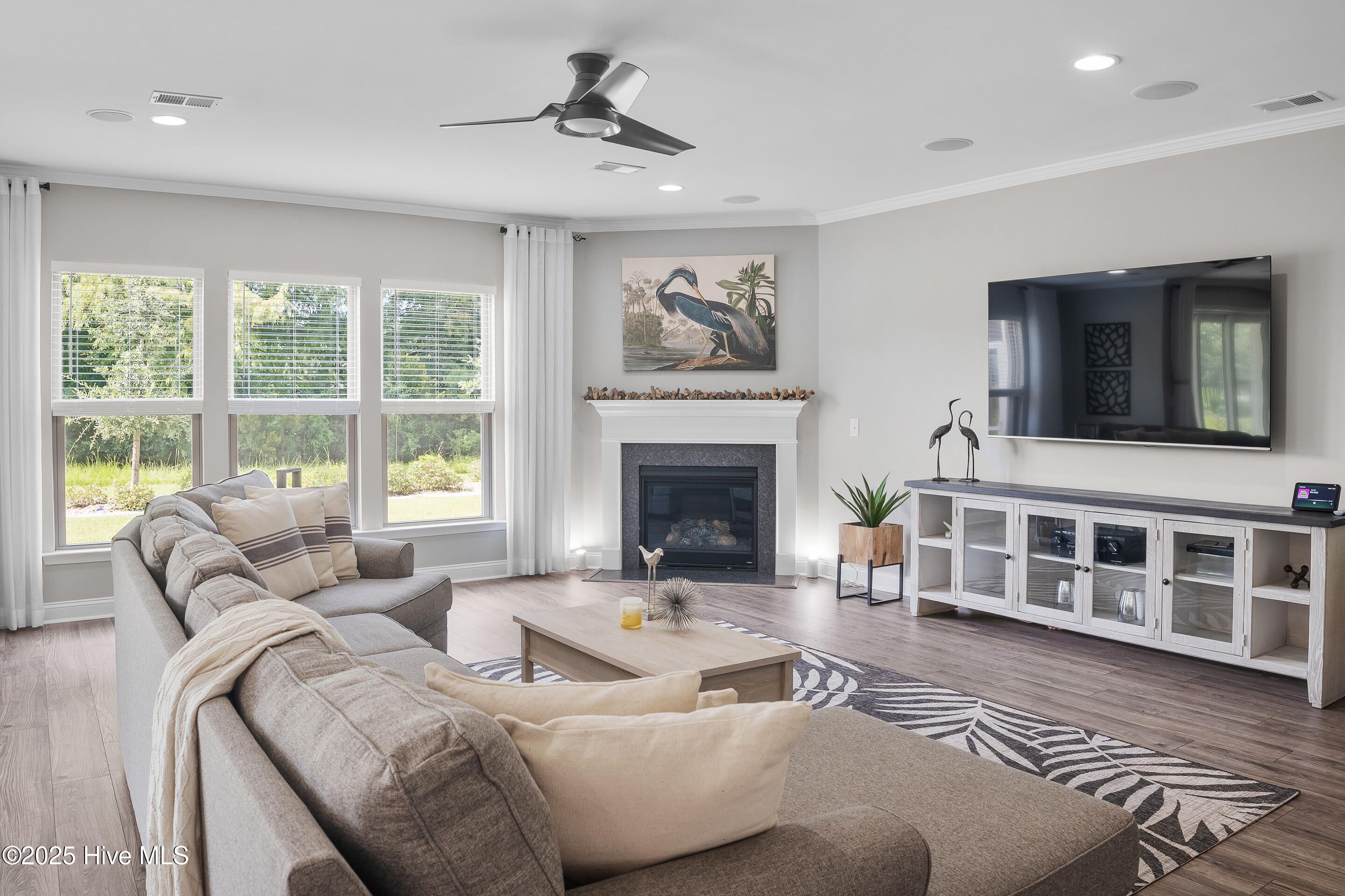Experience refined coastal living with the Vanderbilt floor plan by Pulte Homes, celebrated for its spacious design and thoughtful details. This 4-bedroom, 2.5-bath residence offers over 3,400 sq. ft. of living space, blending open-concept areas with private retreats and ample space for everyday living. Best of all, this home is located OUTSIDE the flood zone and does not require flood insurance. The property is beautifully landscaped and set along a serene community pond, creating a picturesque backdrop. The main level features a 19' x 26' living room designed for gatherings, seamlessly flowing into a chef's kitchen with an expansive island, abundant cabinetry. Direct access to the dining room through a convenient butler's pantry from the kitchen. At the entrance to the home is a library / study with glass door entry. Large sliding glass doors lead to a covered screened porch extending the living space outdoors.. A unique elevated office overlooking the living room provides the perfect spot for additional workspace while staying connected to the heart of the home. The owner's suite, approximately 16' x 15', offers two generous closets, a spa-inspired bath with a walk-in tile shower, soaking tub with tile surround, and dual vanities topped with granite. Upstairs, the versatile bonus room is ideal as a game room, family room, or hobby space, complemented by 3 guest bedrooms one of which is access to the covered balcony. A 3-Car garage provides ample storage for a multiple cars as well as golf cart, bikes, or recreational vehicles. Located in the gated Crow Creek Golf Community, residents enjoy resort-style amenities including an 18-hole championship course, clubhouse, fitness center, outdoor pool, and walking trails. Just minutes from the shops and dining of Calabash, and a short drive to Sunset and Ocean Isle Beaches, this home checks all the boxes for an ideal coastal lifestyle.