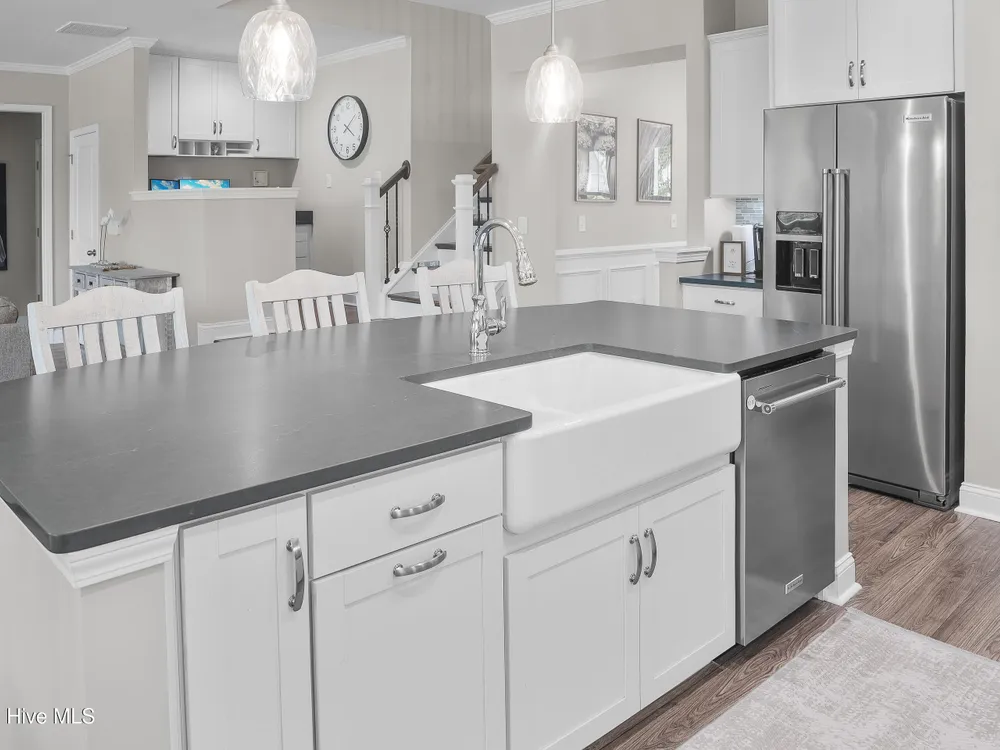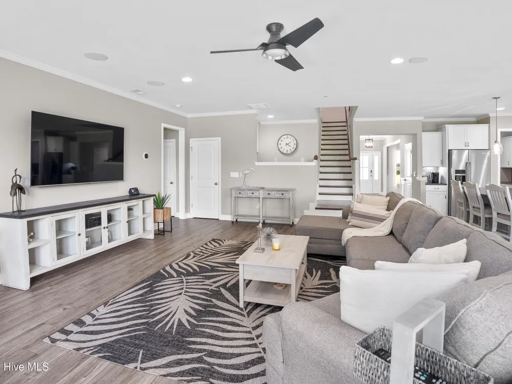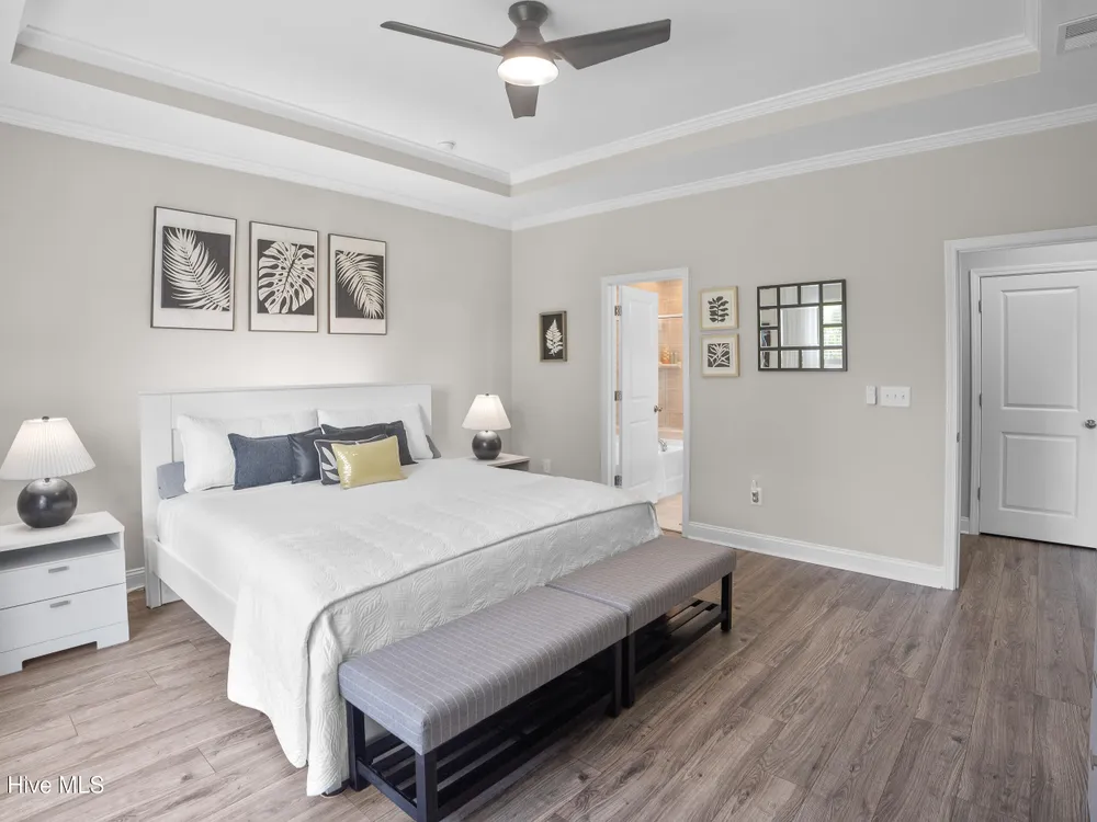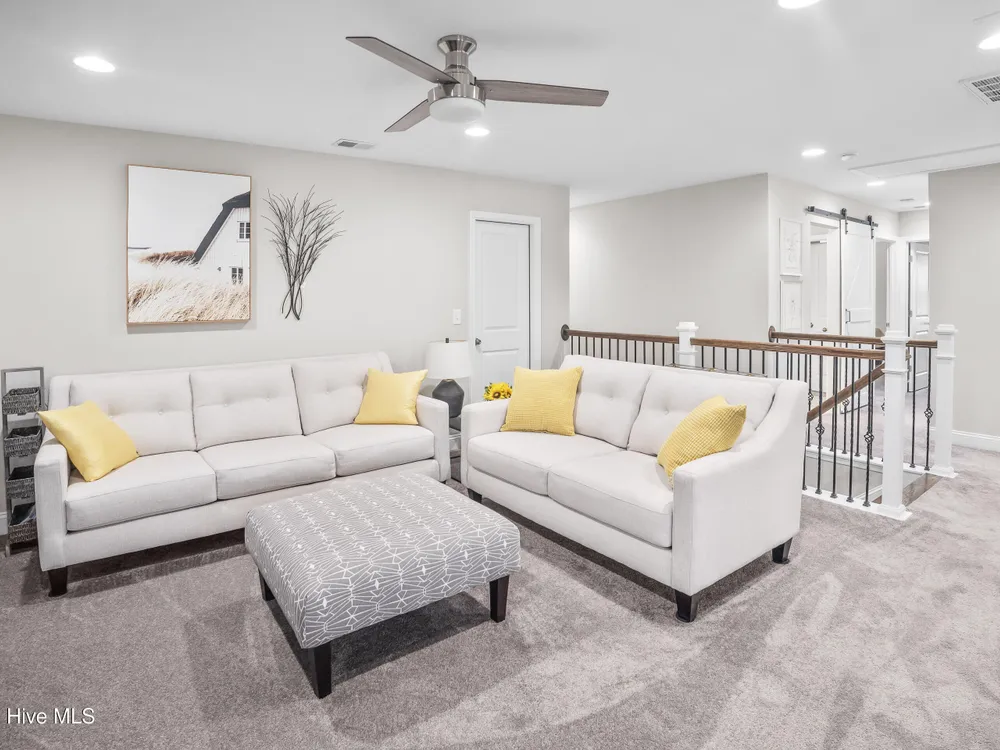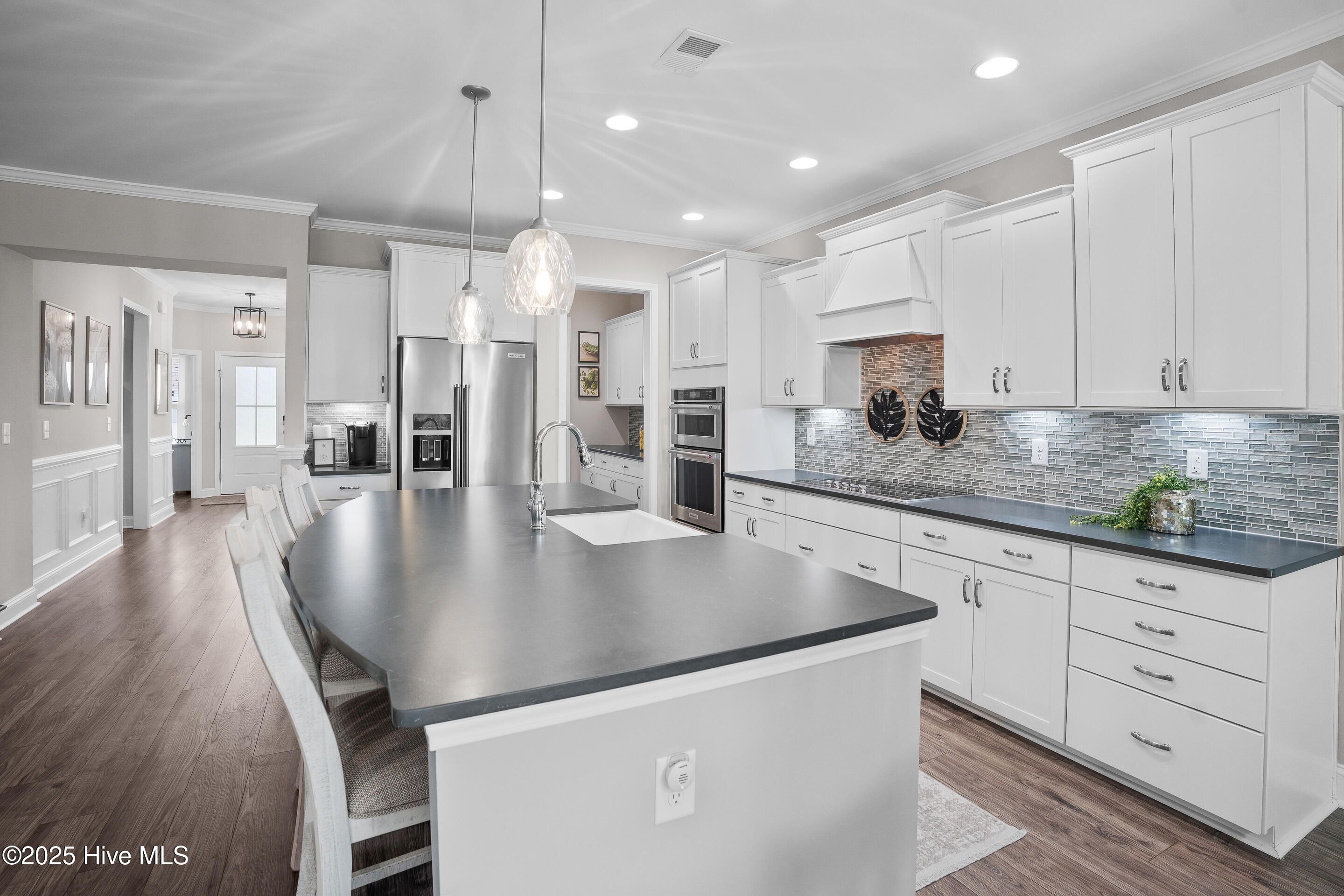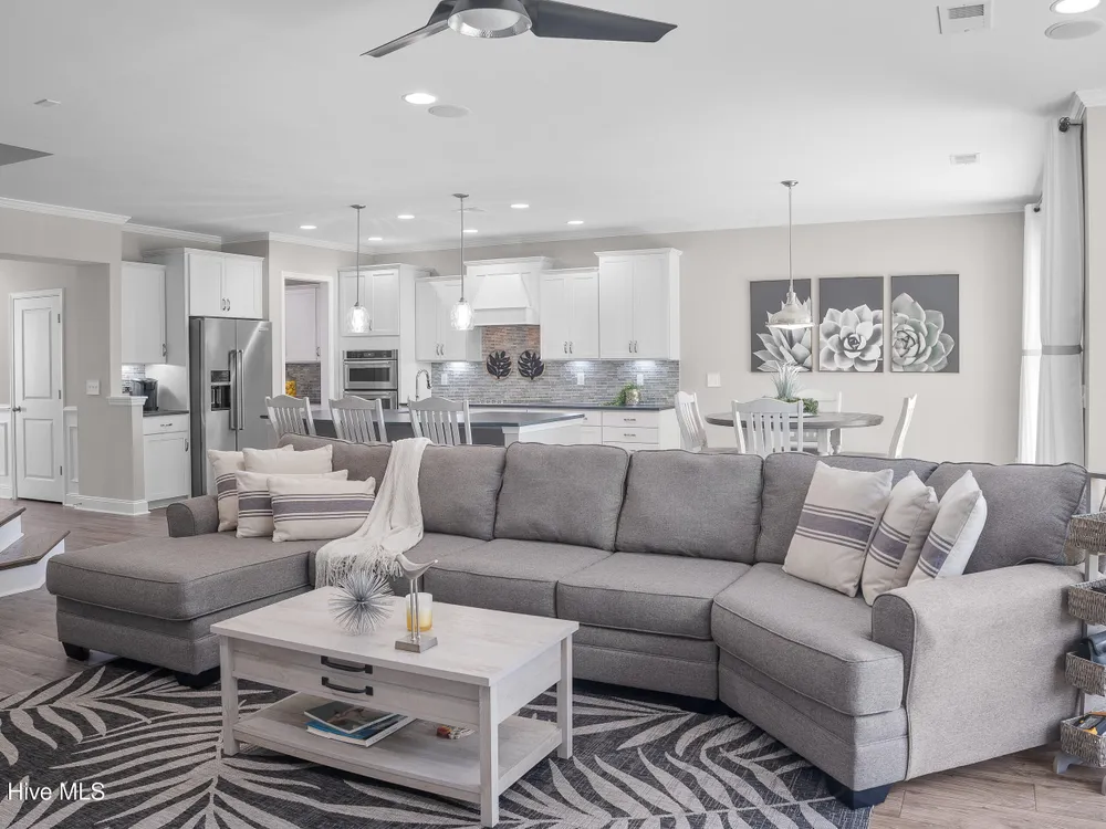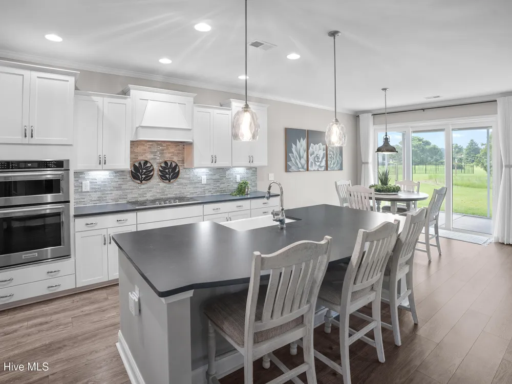 Experience refined coastal living with the Vanderbilt floor plan by Pulte Homes, celebrated for its spacious design and thoughtful details. This 4-bedroom, 2.5-bath residence offers over 3,400 sq. ft. of living space, blending open-concept areas with private retreats and ample space for everyday living. Best of all, this home is located OUTSIDE the flood zone and does not require flood insurance. The property is beautifully landscaped and set along a serene community pond, creating a picturesque backdrop. The main level features a 19' x 26' living room designed for gatherings, seamlessly flowing into a chef's kitchen with an expansive island, abundant cabinetry. Direct access to the dining room through a convenient butler's pantry from the kitchen. At the entrance to the home is a library / study with glass door entry. Large sliding glass doors lead to a covered screened porch extending the living space outdoors.. A unique elevated office overlooking the living room provides the perfect spot for additional workspace while staying connected to the heart of the home. The owner's suite, approximately 16' x 15', offers two generous closets, a spa-inspired bath with a walk-in tile shower, soaking tub with tile surround, and dual vanities topped with granite. Upstairs, the versatile bonus room is ideal as a game room, family room, or hobby space, complemented by 3 guest bedrooms one of which is access to the covered balcony. A 3-Car garage provides ample storage for a multiple cars as well as golf cart, bikes, or recreational vehicles. Located in the gated Crow Creek Golf Community, residents enjoy resort-style amenities including an 18-hole championship course, clubhouse, fitness center, outdoor pool, and walking trails. Just minutes from the shops and dining of Calabash, and a short drive to Sunset and Ocean Isle Beaches, this home checks all the boxes for an ideal coastal lifestyle.