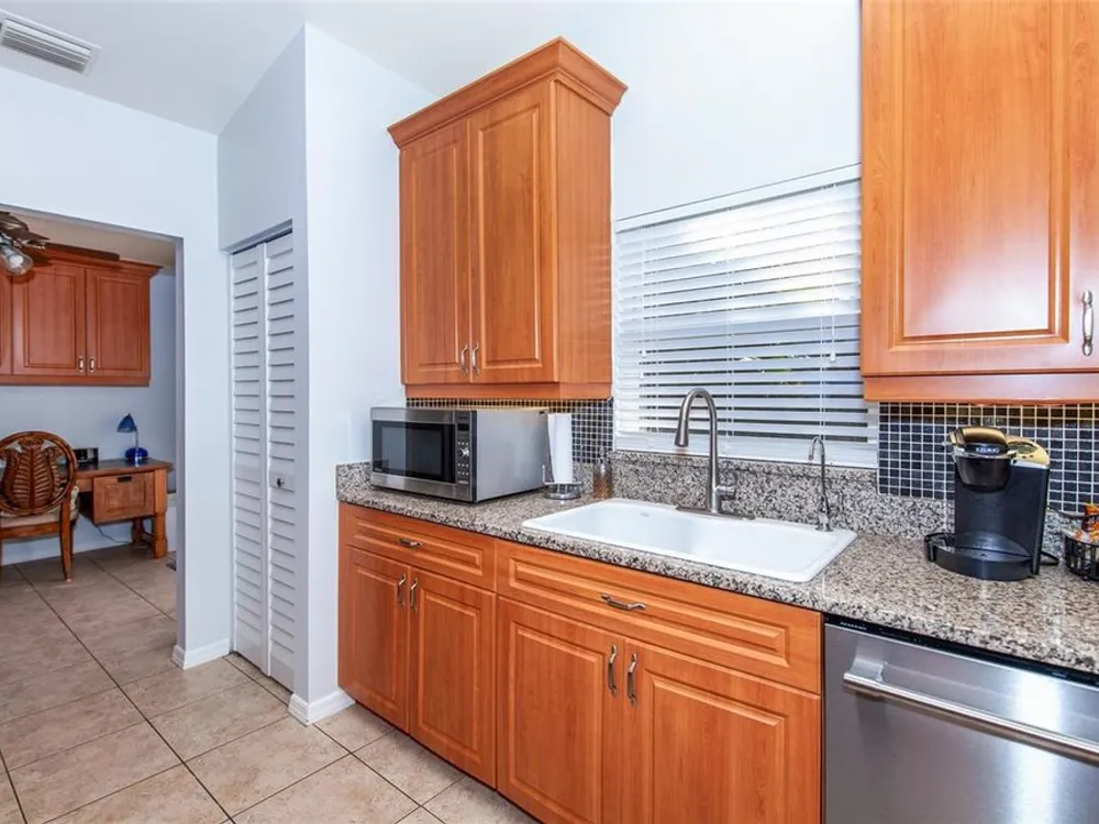 THE ENTIRE AIR CONDITIONING SYSTEM was replaced in APRIL of 2024! This FULLY Furnished villa, nestled in the mature tree lined streets of Myrtle Trace within the Plantation Golf and Country Club in Venice Florida, offers a luxurious lifestyle in a highly coveted neighborhood. Boasting 1750 sq. ft. of bright space, this residence features two master bedrooms, each with its own ensuite bath and walk in closet providing comfort and privacy. Additionally, there is a third half-bath for guests. Granite countertops adorning the kitchen and baths offering a perfect blend of style and functionality. The soft-close cabinets enhance the kitchen's modern appeal, providing ample storage space for all your culinary needs. Additionally, the Kitchen has a reverse osmosis water filtration system. The bonus office space presents a versatile area for work or relaxation, catering to your lifestyle requirements, not to mention an attached two car garage. Indulge in breathtaking views of the serene lake as you unwind in the tranquil lanai, a perfect setting to witness picturesque sunsets and immerse yourself in the beauty of nature. Residents can also enjoy leisurely moments at the community pool, fostering a sense of community and relaxation within the neighborhood. One notable feature of this exceptional villa is its resilience against adverse weather conditions. Unscathed by recent hurricanes, you can rest assured of the villa's sturdiness and safety, providing peace of mind during unpredictable seasons. Don't miss the opportunity to own this exceptional villa in Myrtle Trace, offering a blend of nature, comfort, and tranquility in the heart of Plantation Golf and Country Club (memberships available) with its 2 professional 18 hole golf courses, tennis and Pickleball courts, 2 gyms and exceptional social and dining experiences. Centrally located just 6 miles from beautiful downtown Venice and your choice of 4 area beaches and a bike ride away from Wellen Park with its fabulous restaurants and shopping and the Atlanta Braves Spring Training arena. Enjoy premium living at its finest in this remarkable abode.