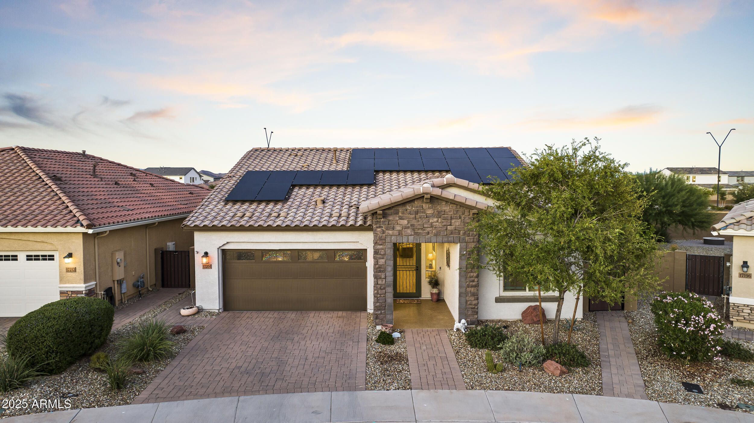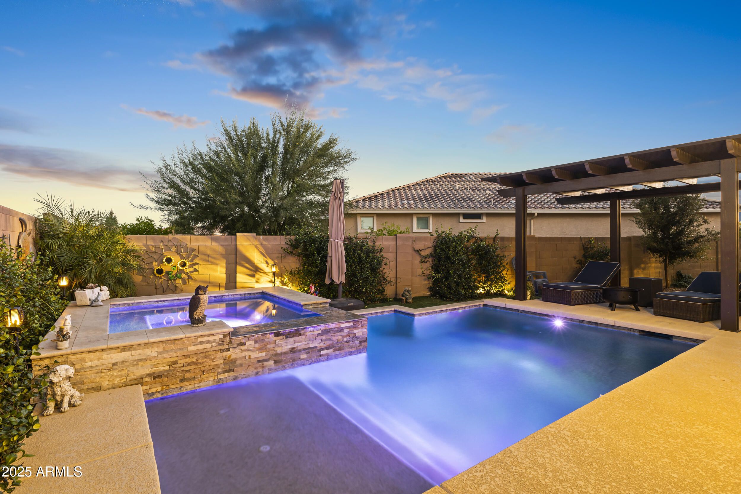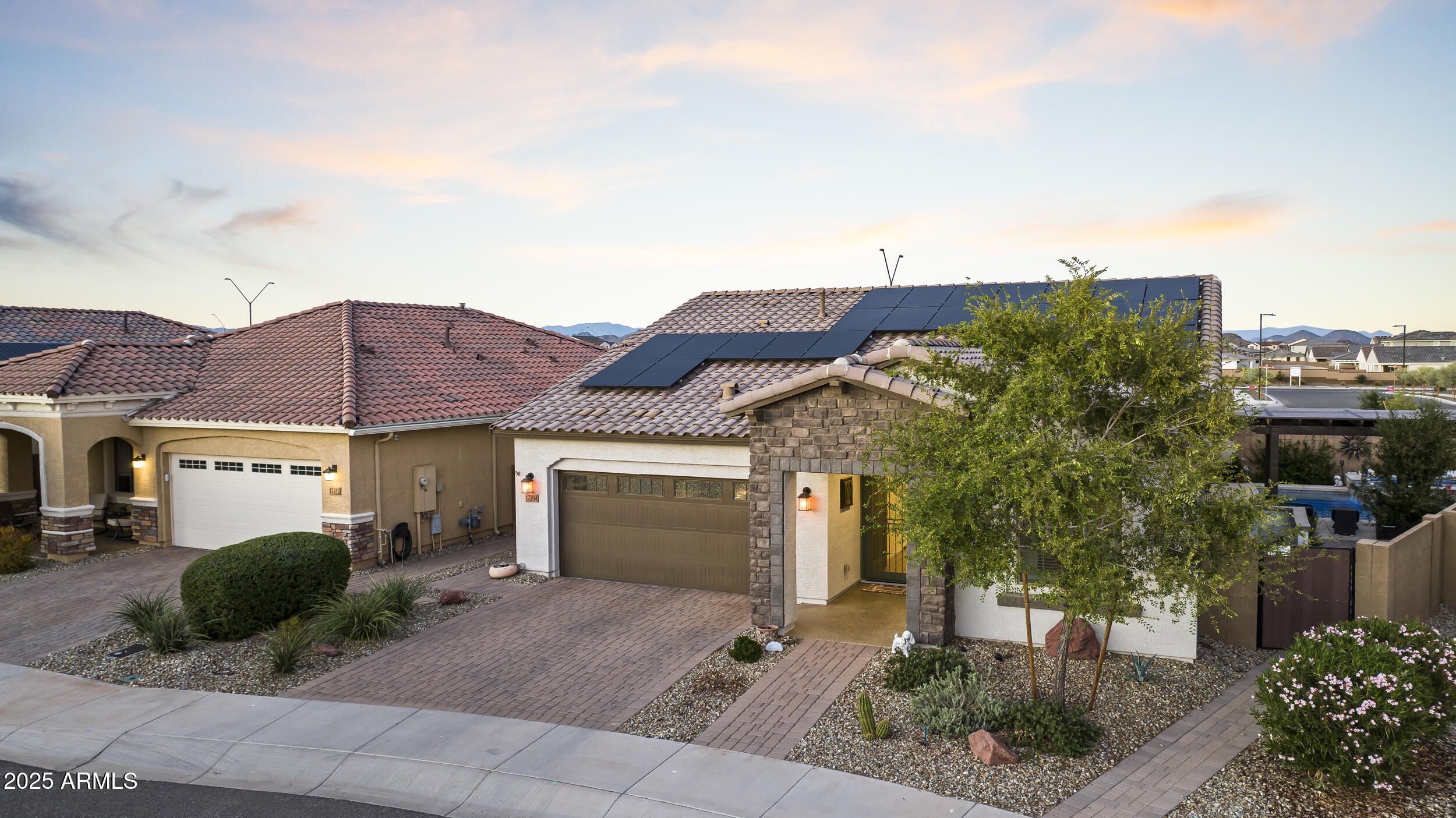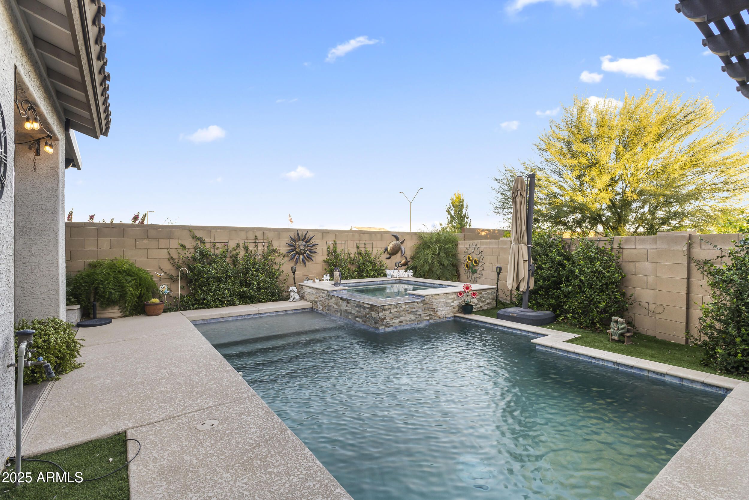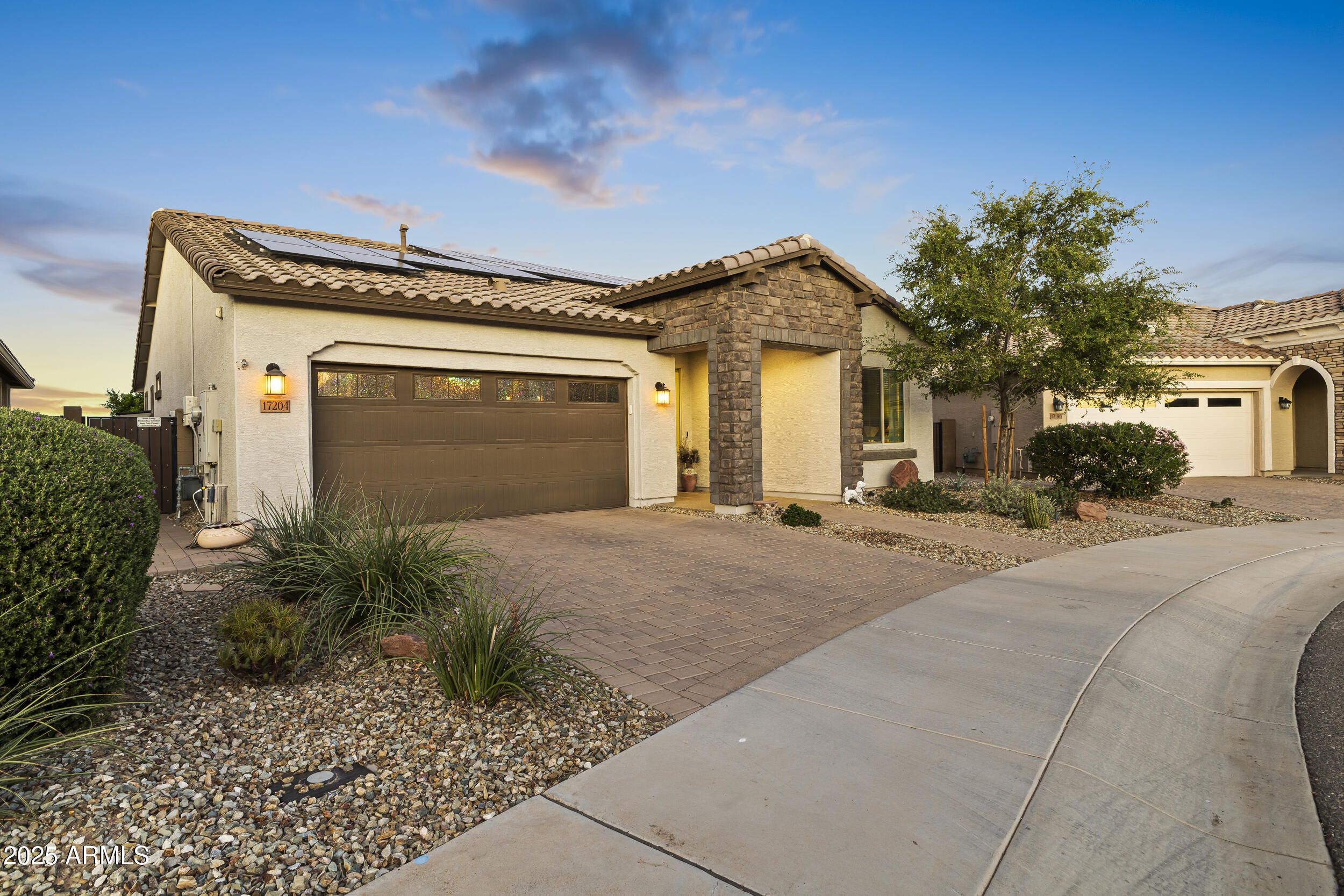 BACK ON THE MARKET! Previous buyer canceled for non-property reasons. Come see this beautiful home! Welcome to Heritage at Asante, a premier gated 55+ community offering resort-style amenities including a clubhouse, pickleball courts, temperature-controlled pools, putting course, dog parks, and fitness centers. This beautifully maintained single-owner Kennedy floorplan by Lennar features 2 bedrooms plus a den and 2 bathrooms. The open-concept kitchen showcases rich brown cabinetry, quartz countertops, a gas range, stainless steel appliances, and ample storage space. The spacious great room and separate dining area provide the perfect setting for gatherings and relaxation. The primary suite offers peaceful backyard views and includes dual vanities, a walk-in shower, and a large closet that Passes through laundry to kitchen. Step outside to your private oasis complete with a sparkling pool and spa, paved covered patio with pergola, artificial turf, and mature landscaping. With no neighbors behind and solar panels for added efficiency, this home is a true gem.