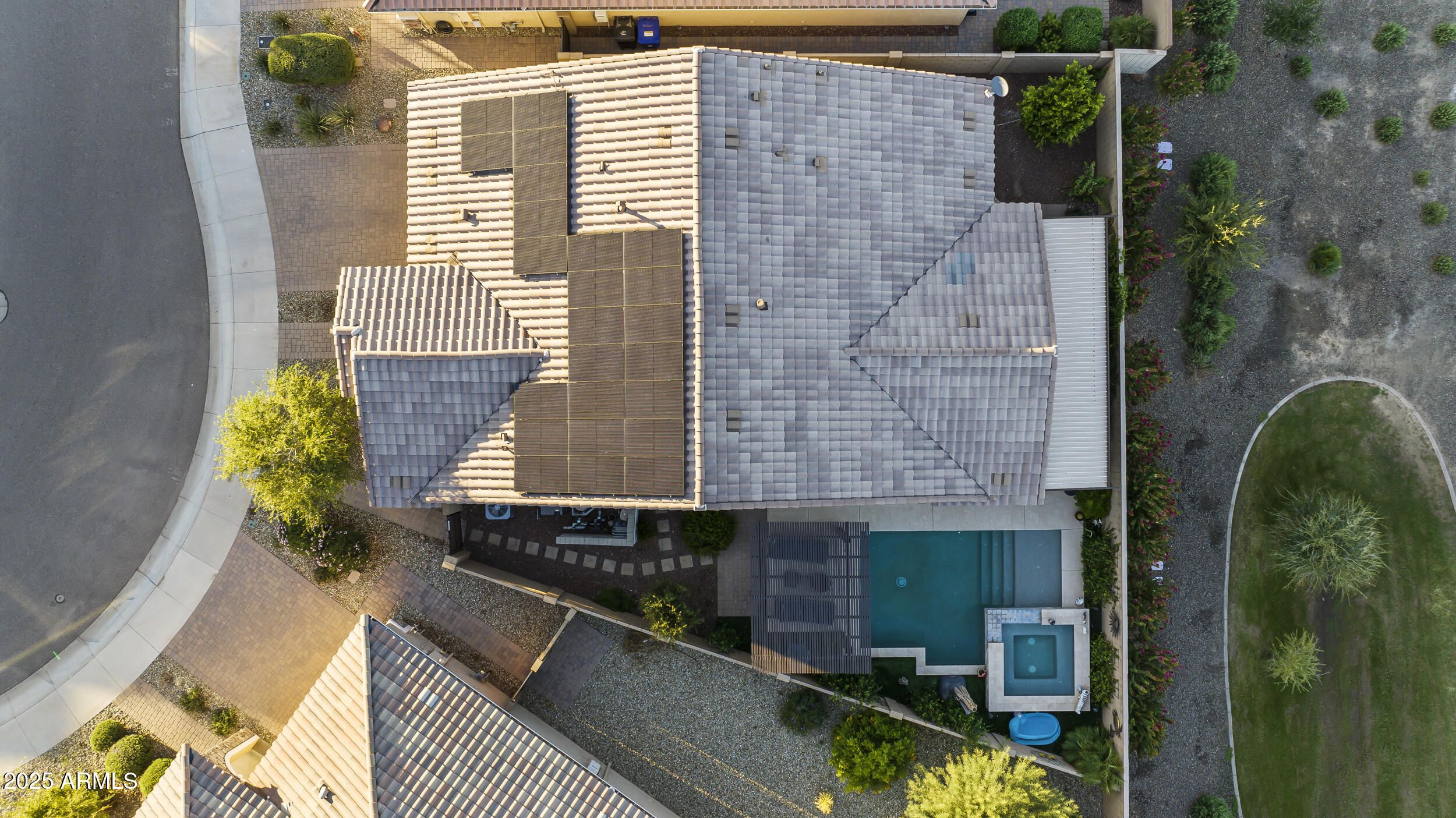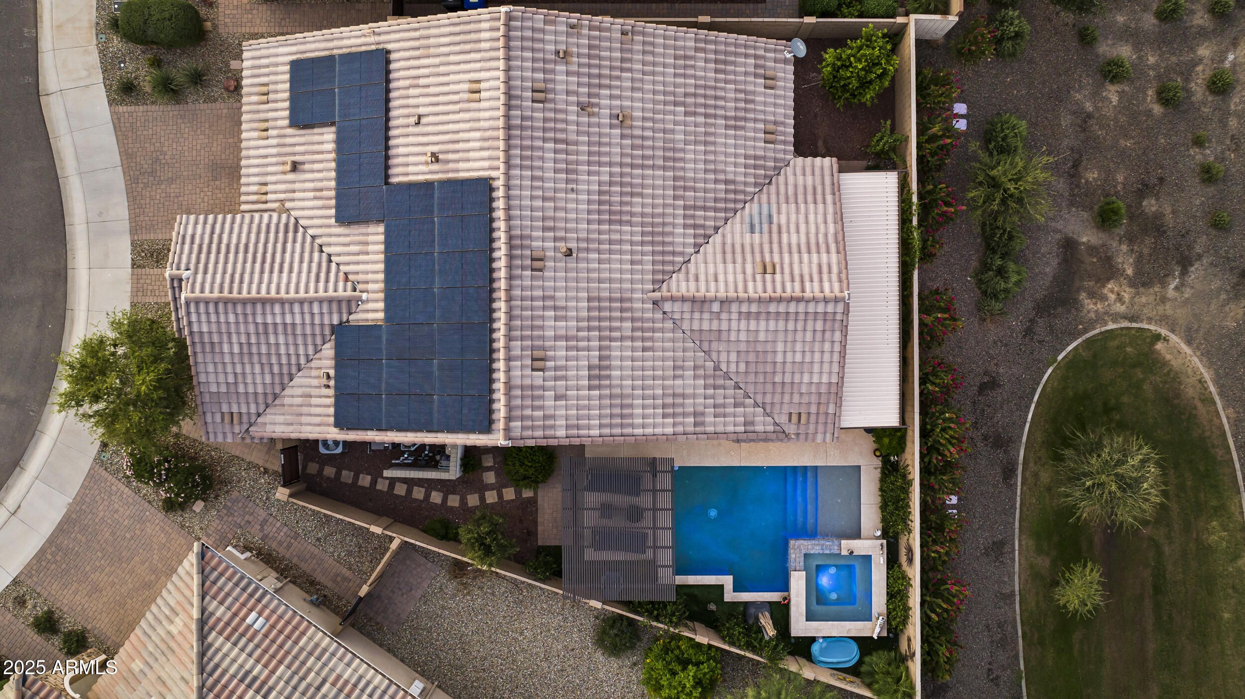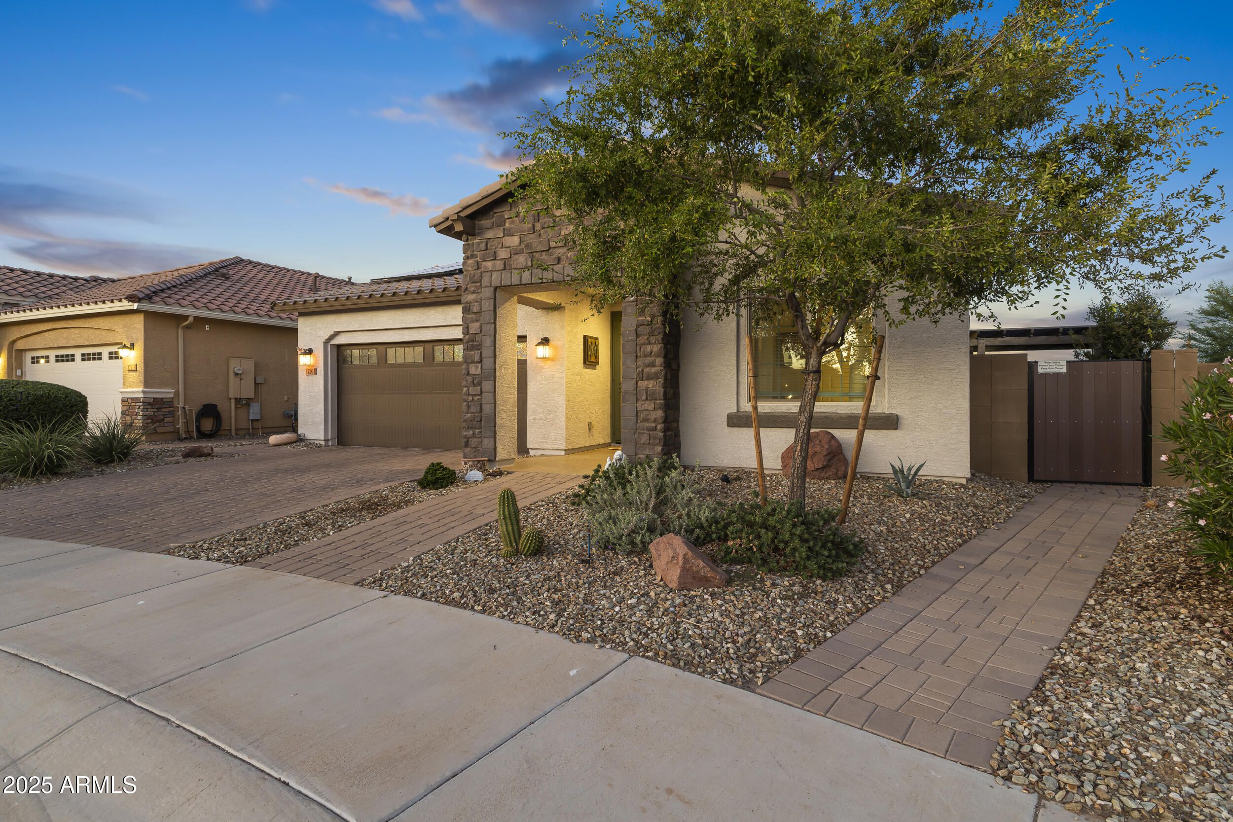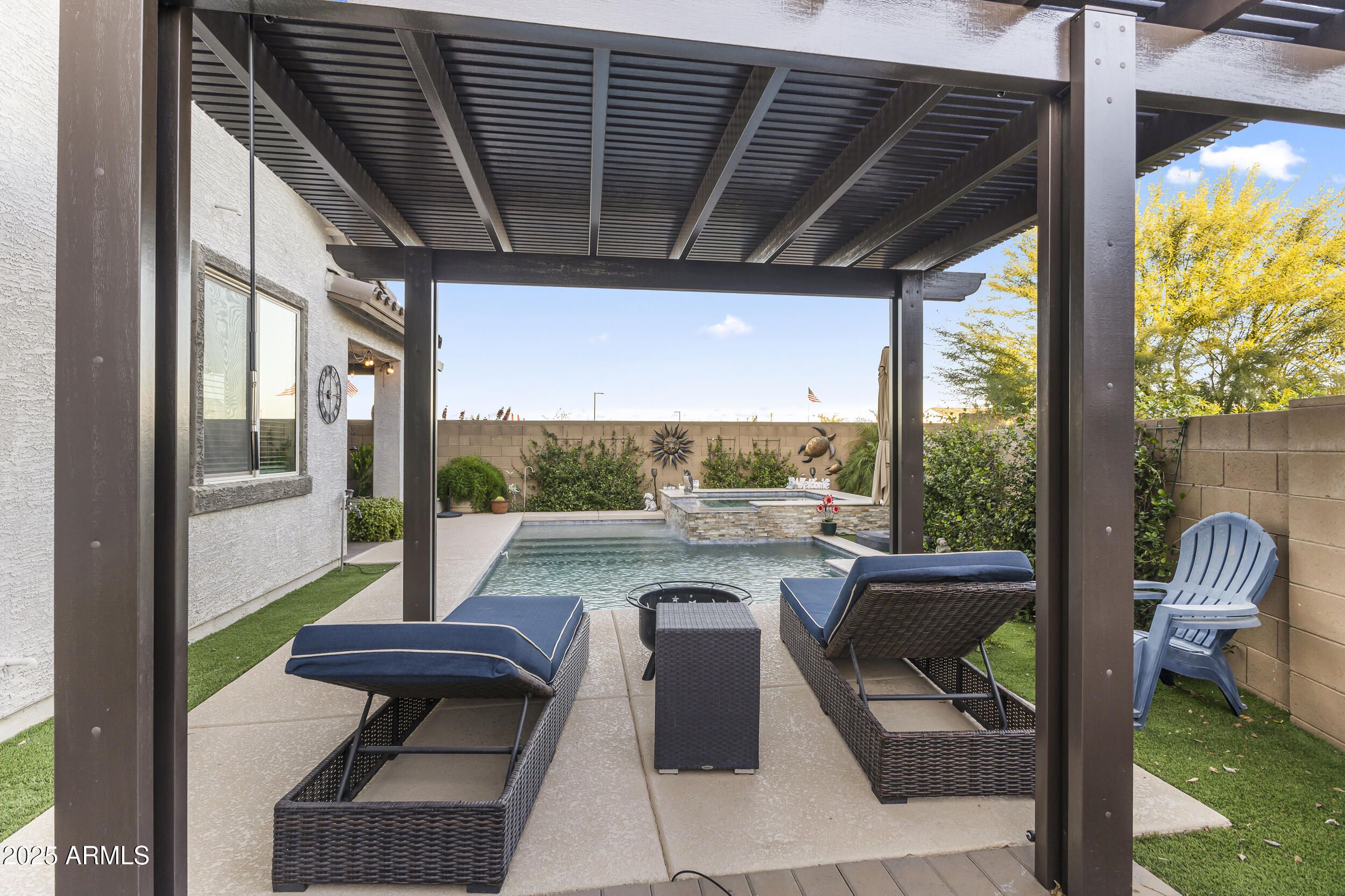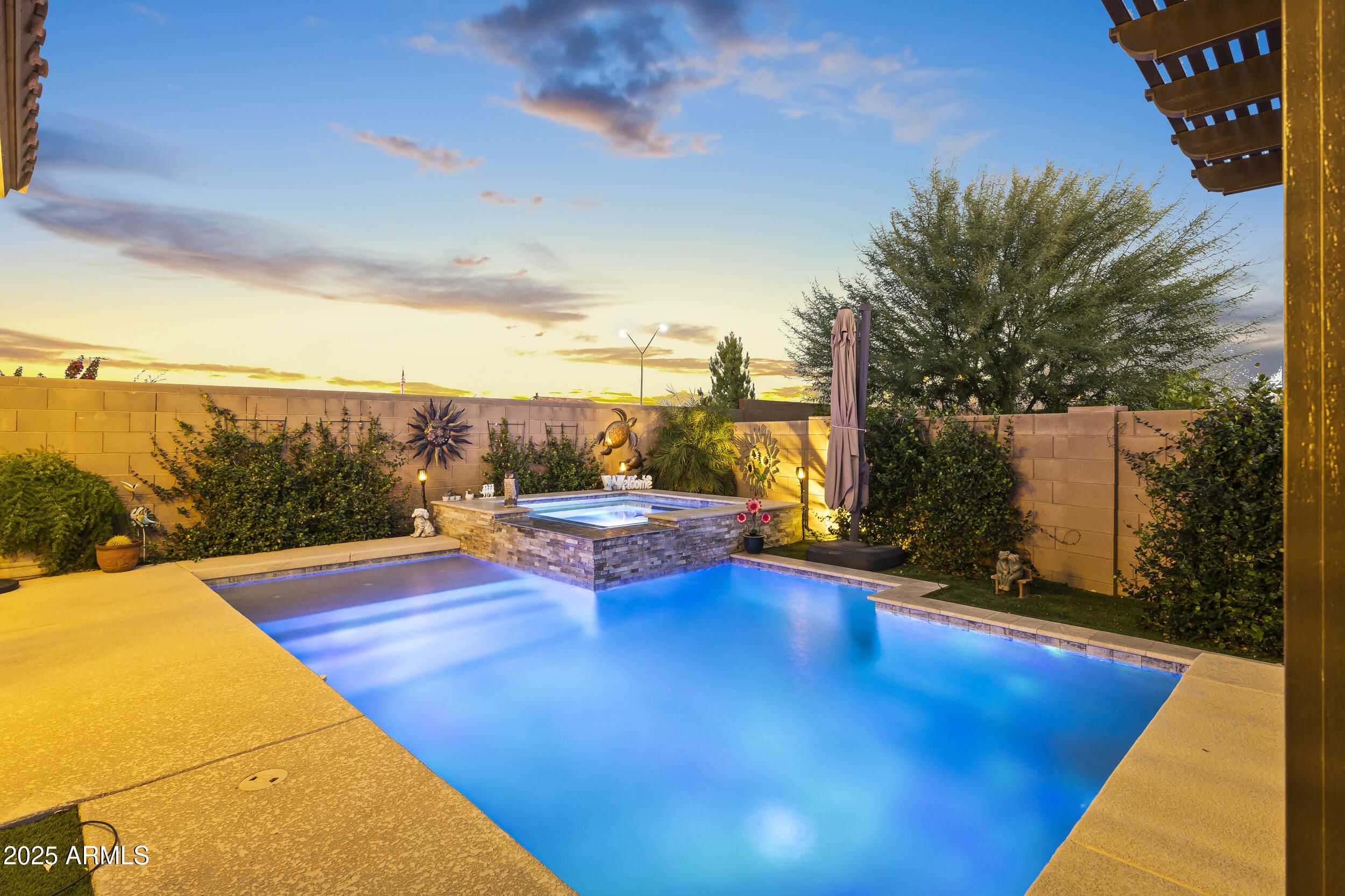 BACK ON THE MARKET! Previous buyer canceled for non-property reasons. Come see this beautiful home! Welcome to Heritage at Asante, a premier gated 55+ community offering resort-style amenities including a clubhouse, pickleball courts, temperature-controlled pools, putting course, dog parks, and fitness centers. This beautifully maintained single-owner Kennedy floorplan by Lennar features 2 bedrooms plus a den and 2 bathrooms. The open-concept kitchen showcases rich brown cabinetry, quartz countertops, a gas range, stainless steel appliances, and ample storage space. The spacious great room and separate dining area provide the perfect setting for gatherings and relaxation. The primary suite offers peaceful backyard views and includes dual vanities, a walk-in shower, and a large closet that Passes through laundry to kitchen. Step outside to your private oasis complete with a sparkling pool and spa, paved covered patio with pergola, artificial turf, and mature landscaping. With no neighbors behind and solar panels for added efficiency, this home is a true gem.
