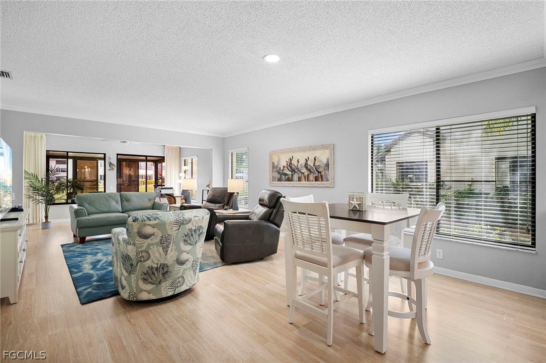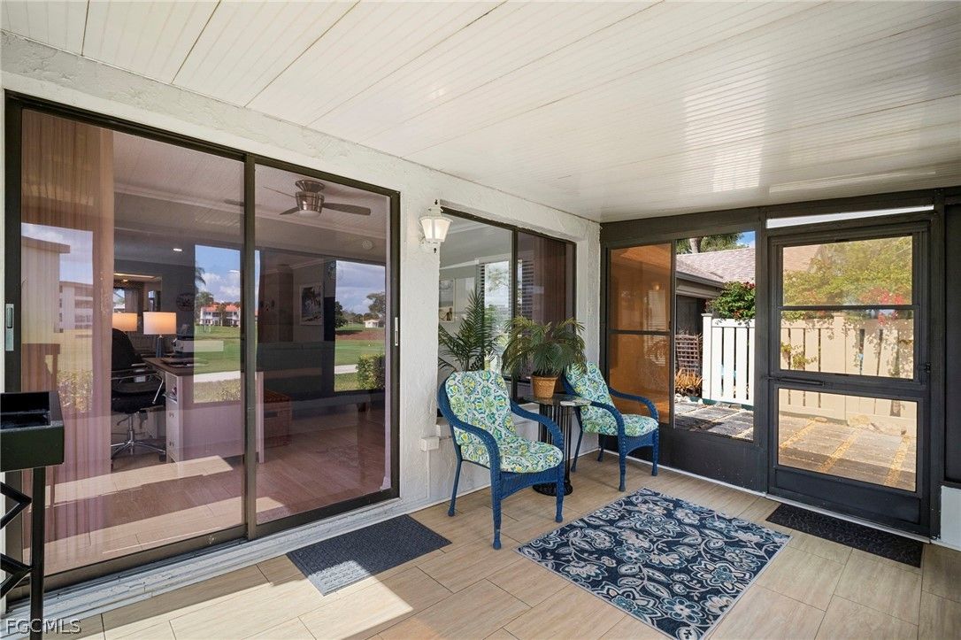 Beautiful Villa with a spacious floor plan with lots of natural light. High-End furnishings included with only a few exclusions. Update luxury vinyl flooring throughout, and refaced cabinets in kitchen with granite countertop, new dishwasher 2024, refrigerator 2019, and washer and dryer 2023. Crown molding and new lights and fans. Both Bathroom have walk-in showers with updated vanities. Beautiful views of the golf course sit in the screened in lanai and enjoy the winter breeze or sit on the outside patio off the lanai and get some sun. Golf cart included too!! This is a 55+ Gated Community is peacefully set in the middle of everything there is to do in South Fort Myers. Close to RSW International Airport, and Punta Gorda Airport which offers you options for you to frequent this as your seasonal home or if you intend to live full time. Golfing is Bundled in your Fees for 2 Owners to Play as you Desire. Putting Green, Driving Range, Basketball, 6 Tennis Courts, Pickleball, Bocce Ball or Shuffleboard. Many Cards and Game Groups, Planned lifestyle events and outings. Live Music events and Entertainment brought in for you and your guests. "Tee Room" Restaurant/Bar, Great Neighbors and Social Support. Close to shopping, restaurants, everything you need is here or just outside our gates. Condo fees cover all your amenities plus your internet/cable, water, sewer, trash removal, lawn maintenance, you pay your electricity. Great fun, friendly community!