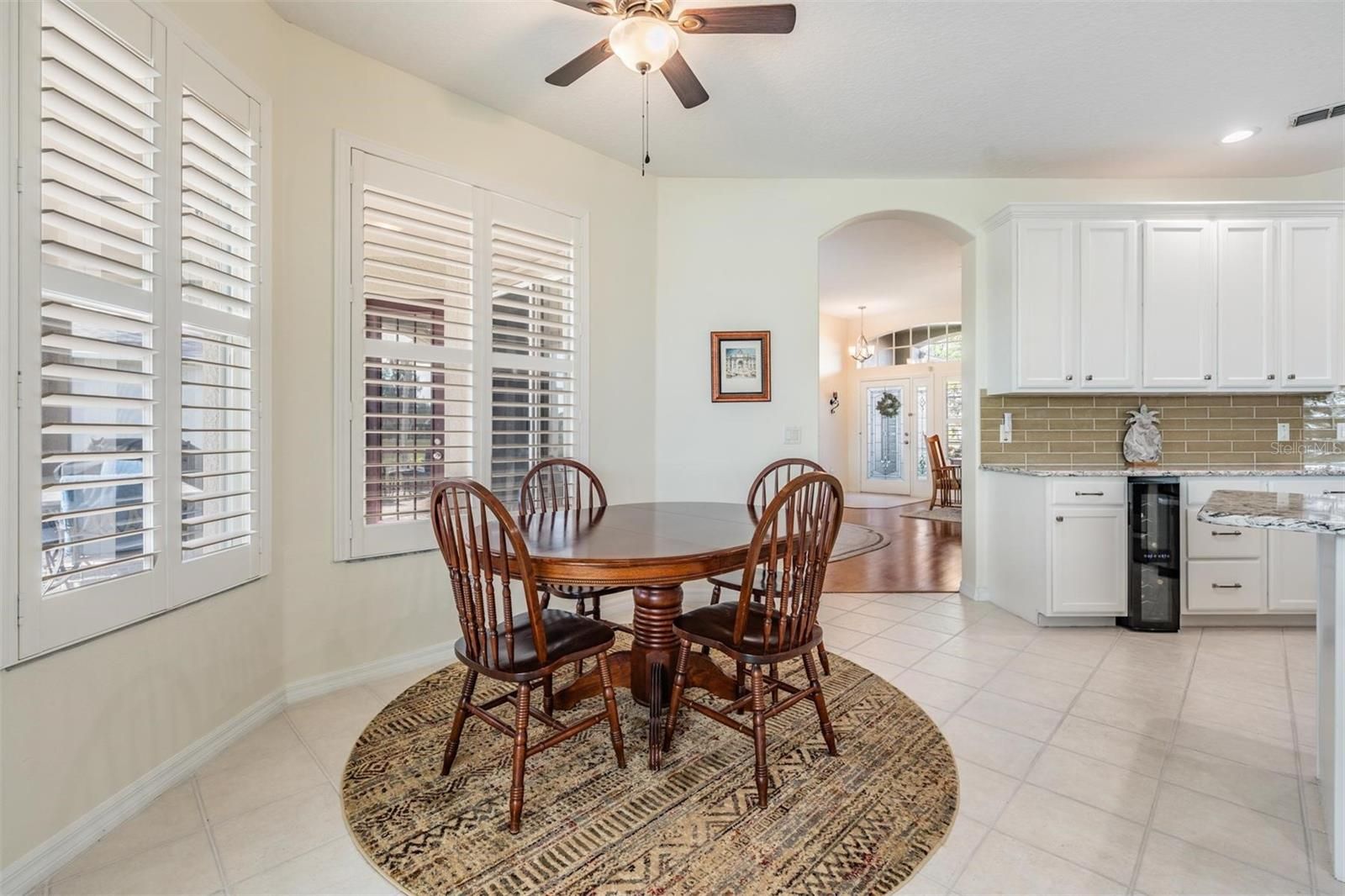 - Ceiling Fan(s), Crown Molding, Eat-in Kitchen, High Ceilings, Kitchen/Family Room Combo, Living/Dining Room, Open Floorplan, Solid Surface Counters, Split Bedrooms, Stone Counters, Walk-In Closet(s), Window Treatments