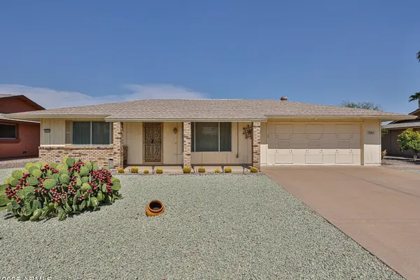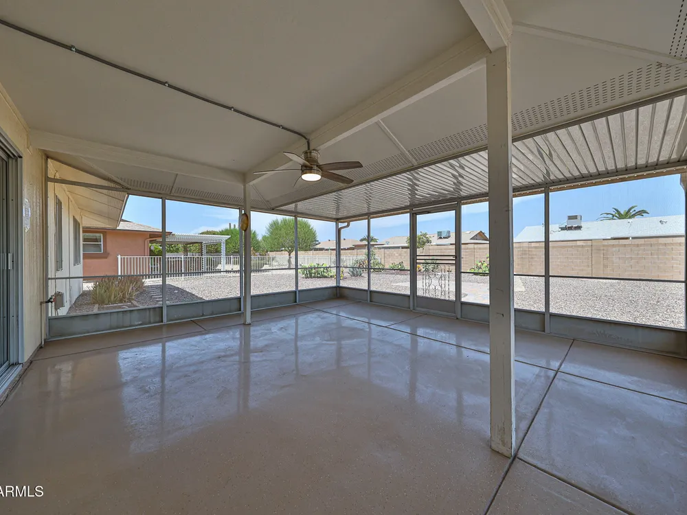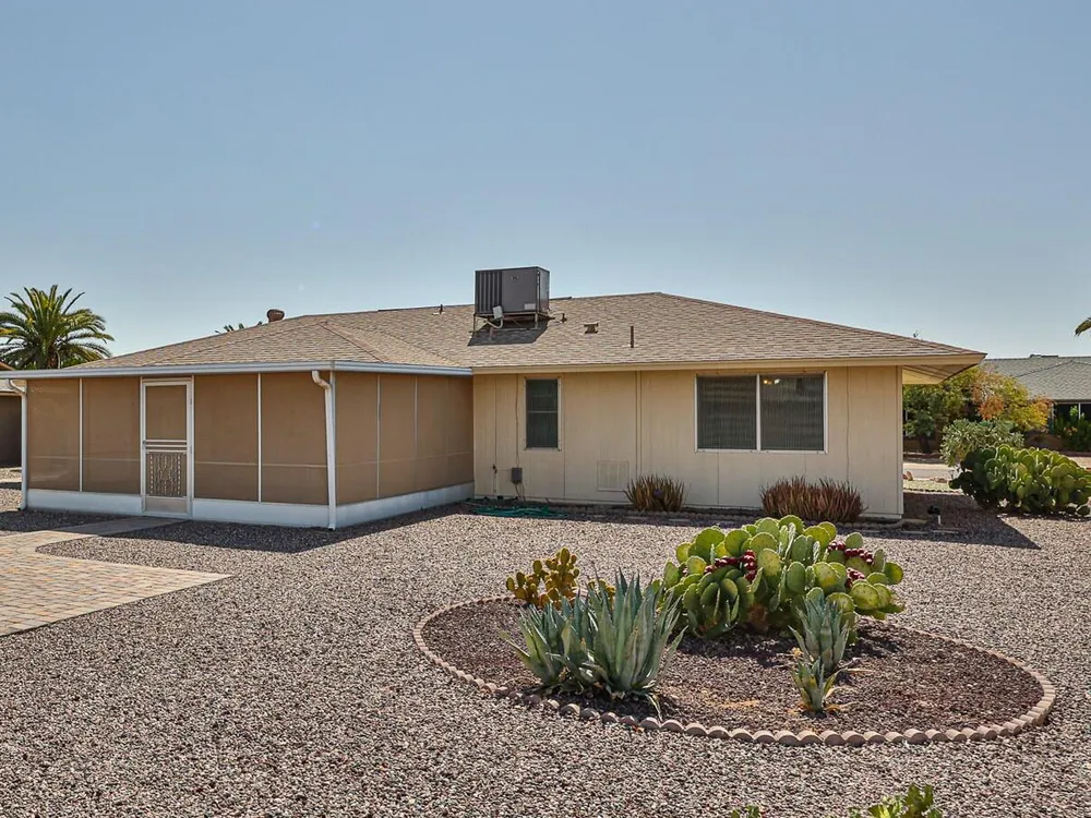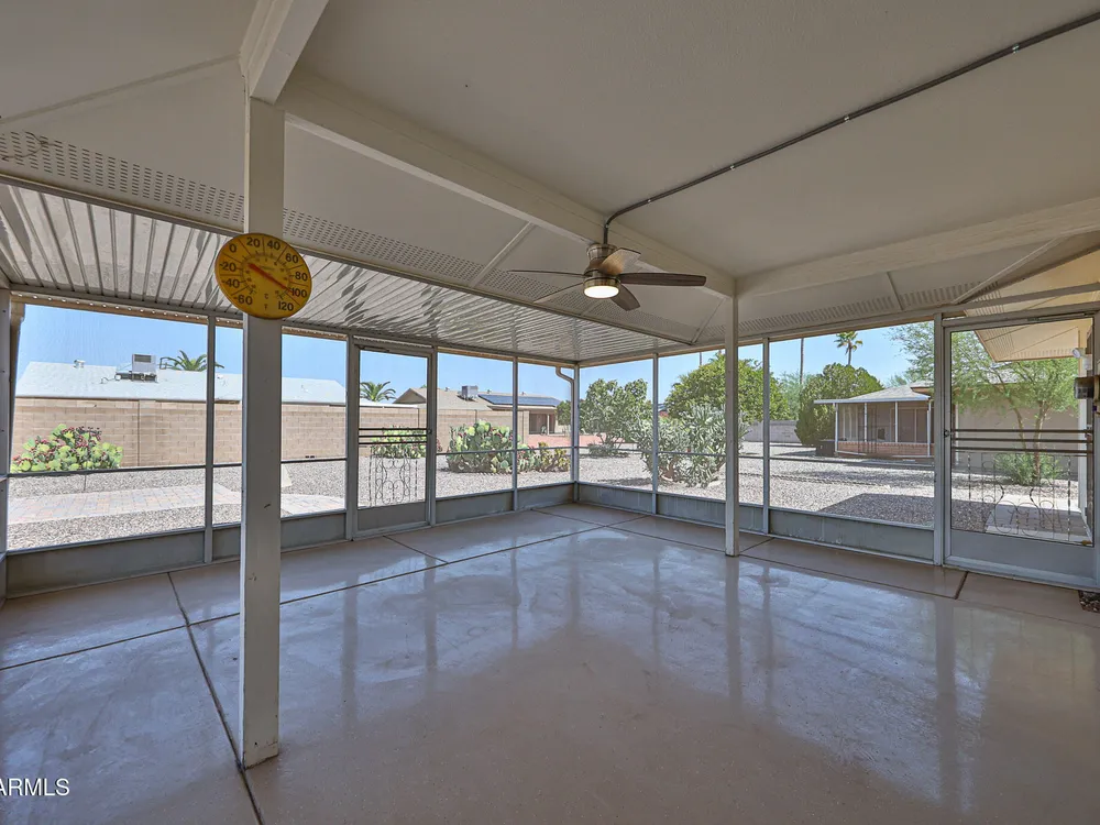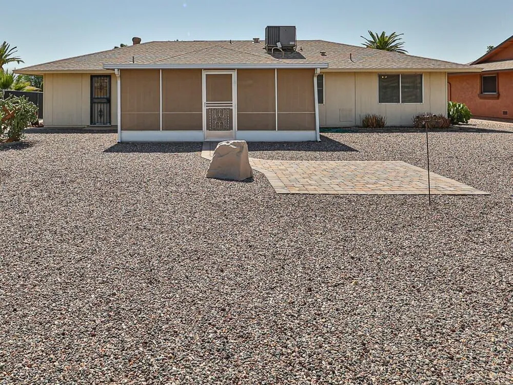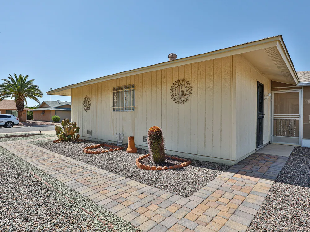 This charming 2-bedroom, 1-bath home located in Phrase III. Interior highlights include neutral tile flooring, fresh window treatments, ceiling fans throughout. Popcorn ceilings have been removed from every room, including the garage. The kitchen features stainless steel appliances, complemented with roof replaced in 2018. The exterior is equally impressive, featuring a large, enclosed back patio with epoxy flooring, beige sun-blocking screens, and a remote-control ceiling fan. The front patio and garage also have epoxy-coated floors with the garage boasting Lift Master opener. New Hot Water Heater 9/25. Motion-sensor lights illuminate both front and back, irrigation system keeps landscaping lush. A paved walkway connects the front yard to the backyard for easy access.
