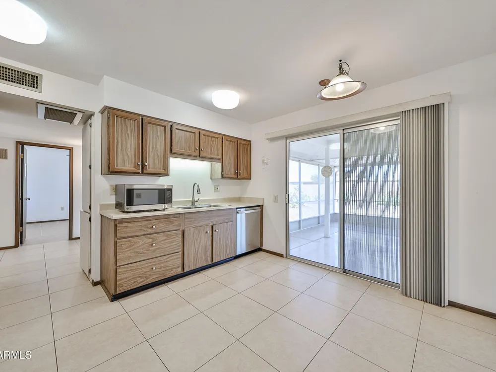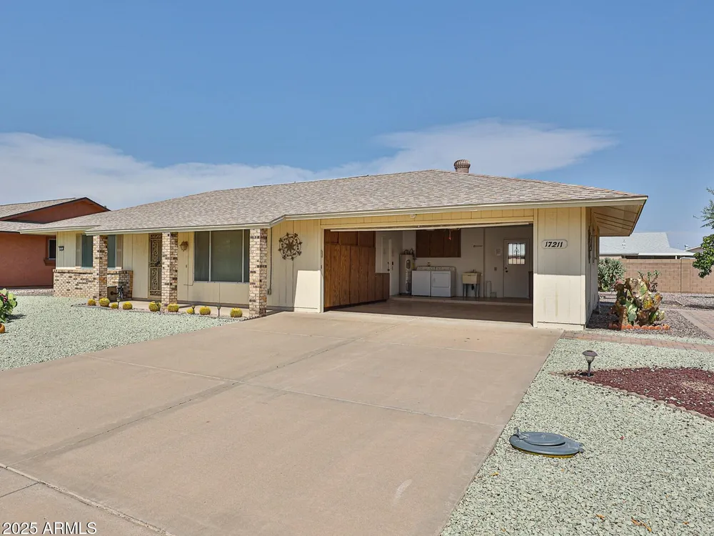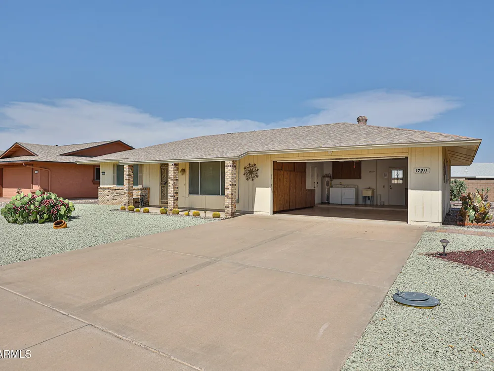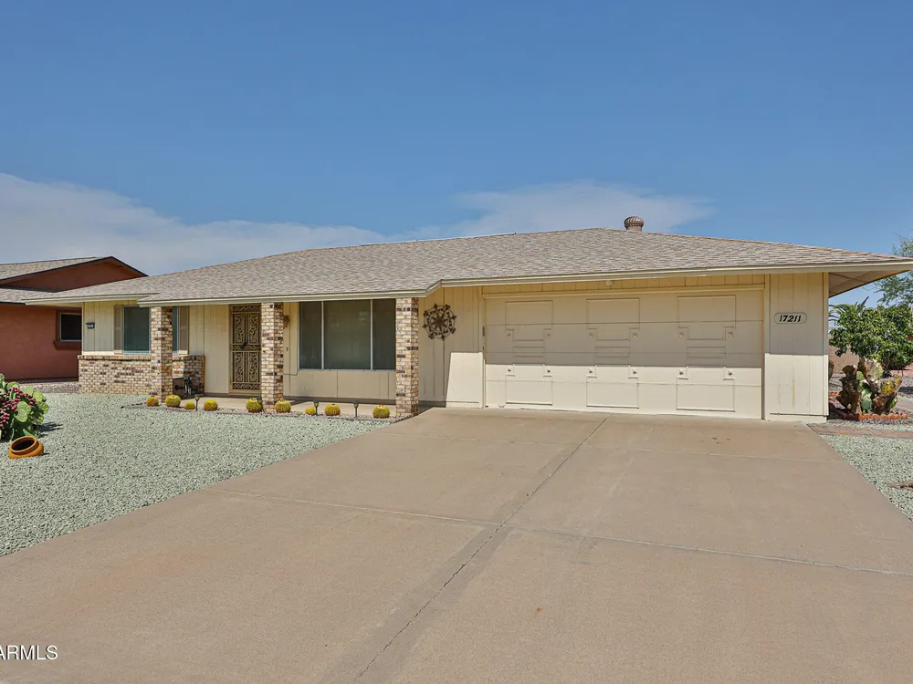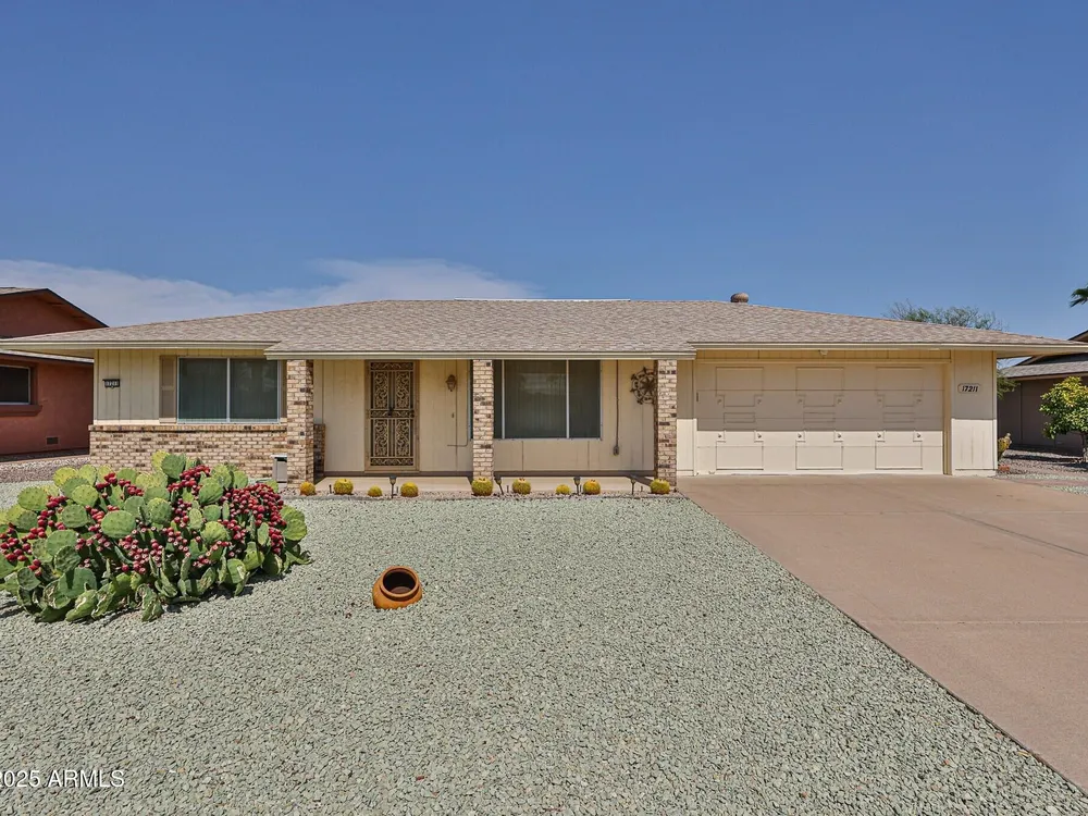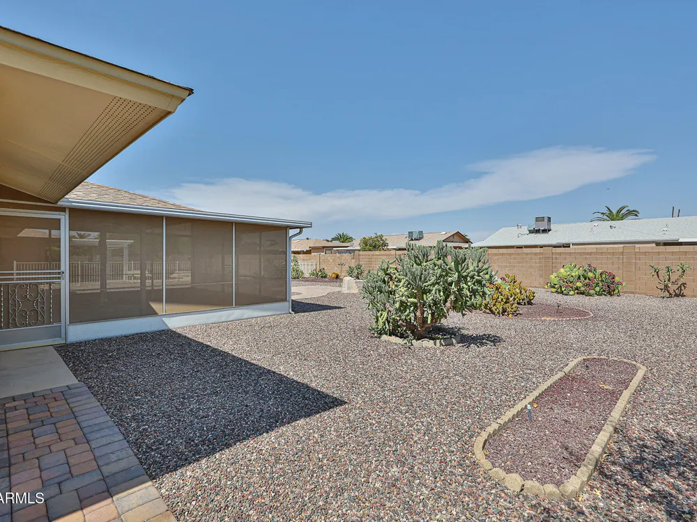 This charming 2-bedroom, 1-bath home located in Phrase III. Interior highlights include neutral tile flooring, fresh window treatments, ceiling fans throughout. Popcorn ceilings have been removed from every room, including the garage. The kitchen features stainless steel appliances, complemented with roof replaced in 2018. The exterior is equally impressive, featuring a large, enclosed back patio with epoxy flooring, beige sun-blocking screens, and a remote-control ceiling fan. The front patio and garage also have epoxy-coated floors with the garage boasting Lift Master opener. New Hot Water Heater 9/25. Motion-sensor lights illuminate both front and back, irrigation system keeps landscaping lush. A paved walkway connects the front yard to the backyard for easy access.