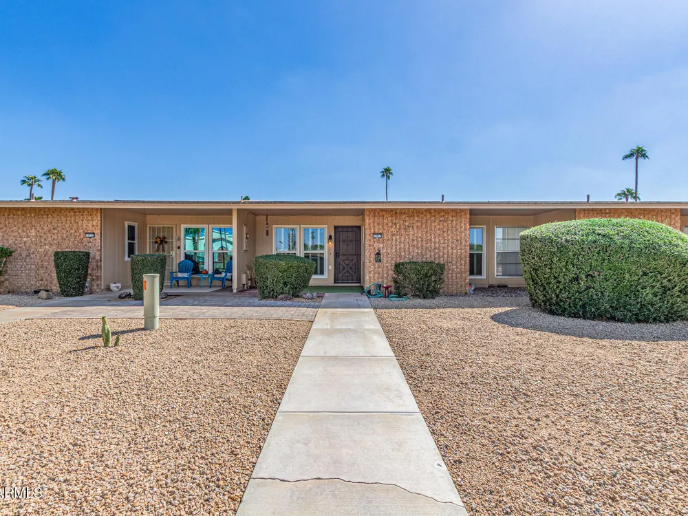Absolutely charming 1BR/1BA home with den/formal dining in Sun City! Features bamboo flooring, an updated white kitchen with stainless steel appliances, modern backsplash, skylight, and shutters. Spacious bedroom with walk-in and wall closet. Private paver patio, extended front patio, and hardwired ceiling fans. Tile in kitchen, hall & bath. Community amenities, from a refreshing pool to tennis courts and a fitness center! What are you waiting for? Don't miss out! Major updates: Roof (2019), HVAC (2016), Water Heater (2018), Exterior Paint (2021). 1-car garage with W/D hook-up. No rentals—1 small dog allowed!