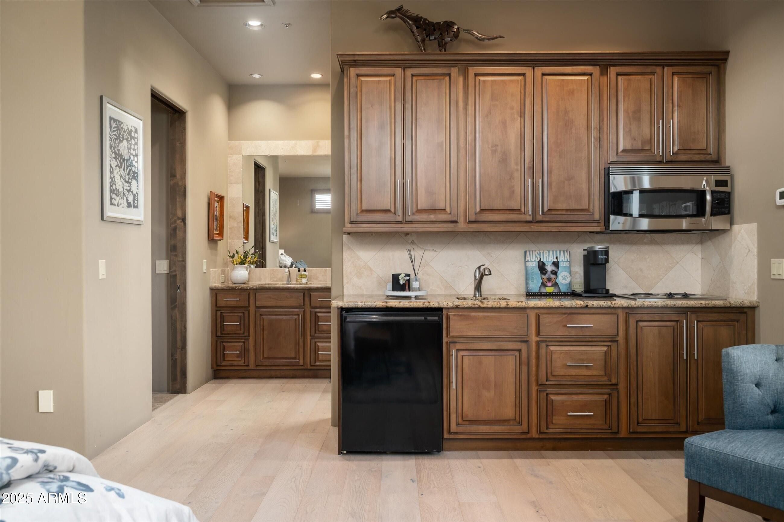 BEAUTIFULLY REMODELED CUSTOM HOME RECENTLY UPDATED WITH A FRESH LOOK CONTEMPORARY REDESIGN. This welcoming home opens to a vibrant entry and spacious great room with custom bar designed for entertaining friends & family. The interior warmth continues in the kitchen with mountain views and great natural light. Spectacular floor to ceiling windows showcases the brand-new pool and oasis-style landscaping transformation featuring an expansive covered patio, BBQ, firepit, fountain & outdoor shower. Main home features guest bedroom, theater room, full office and gorgeous dining room. Separate guest casita features 500 sq ft of living space including its own laundry for extended stays. This home seamlessly incorporates modern design elements with timeless southwest architecture.