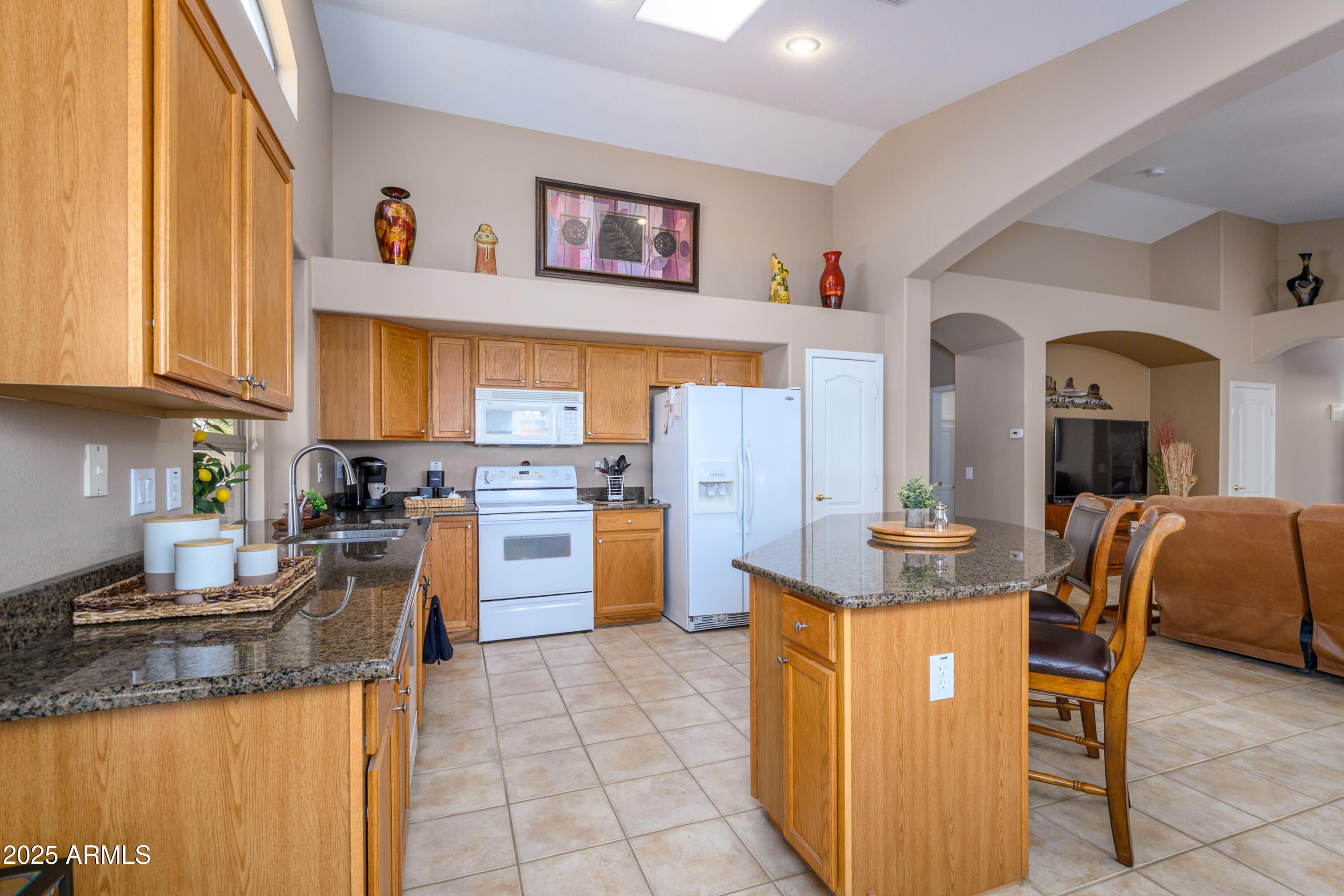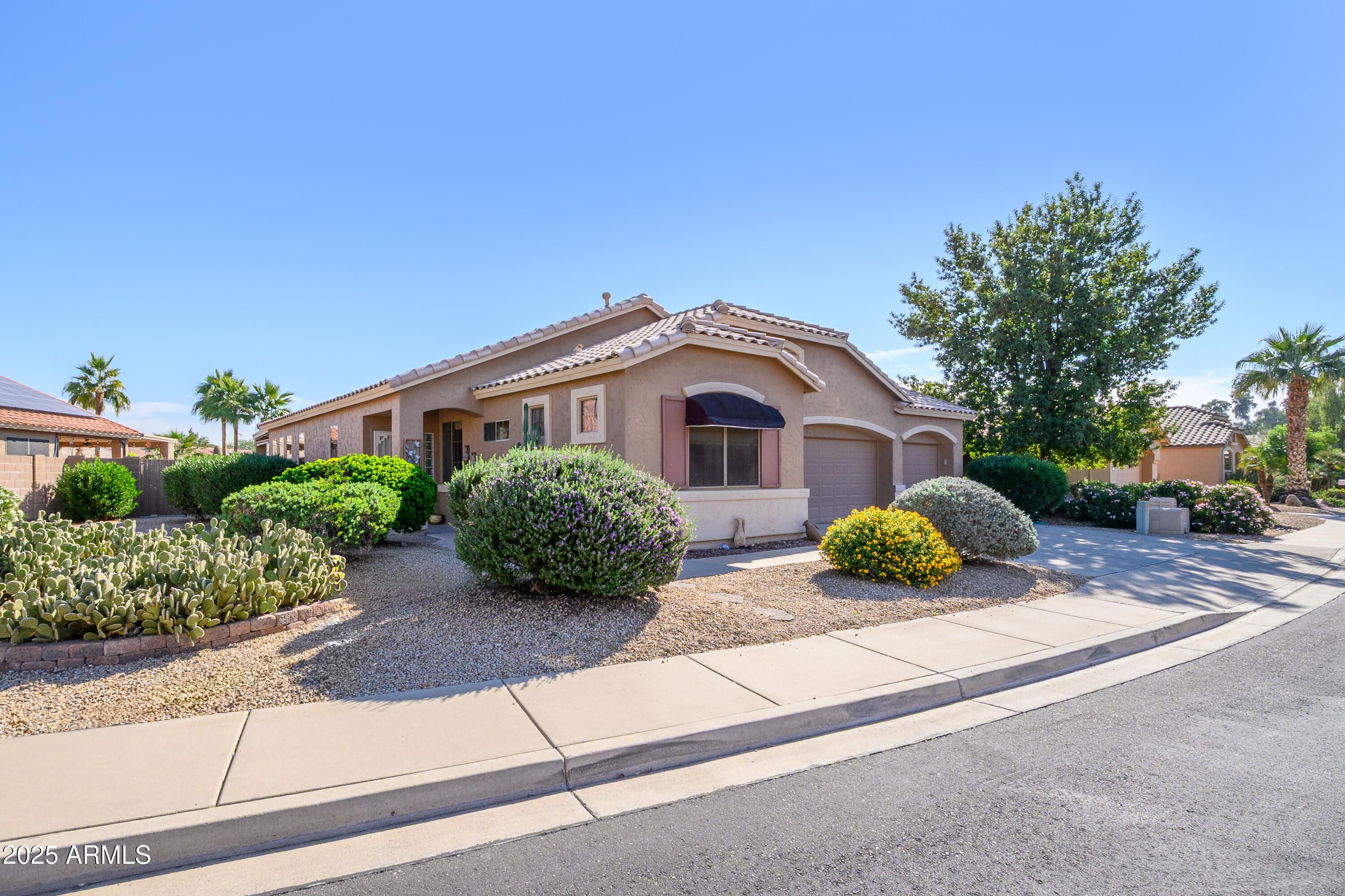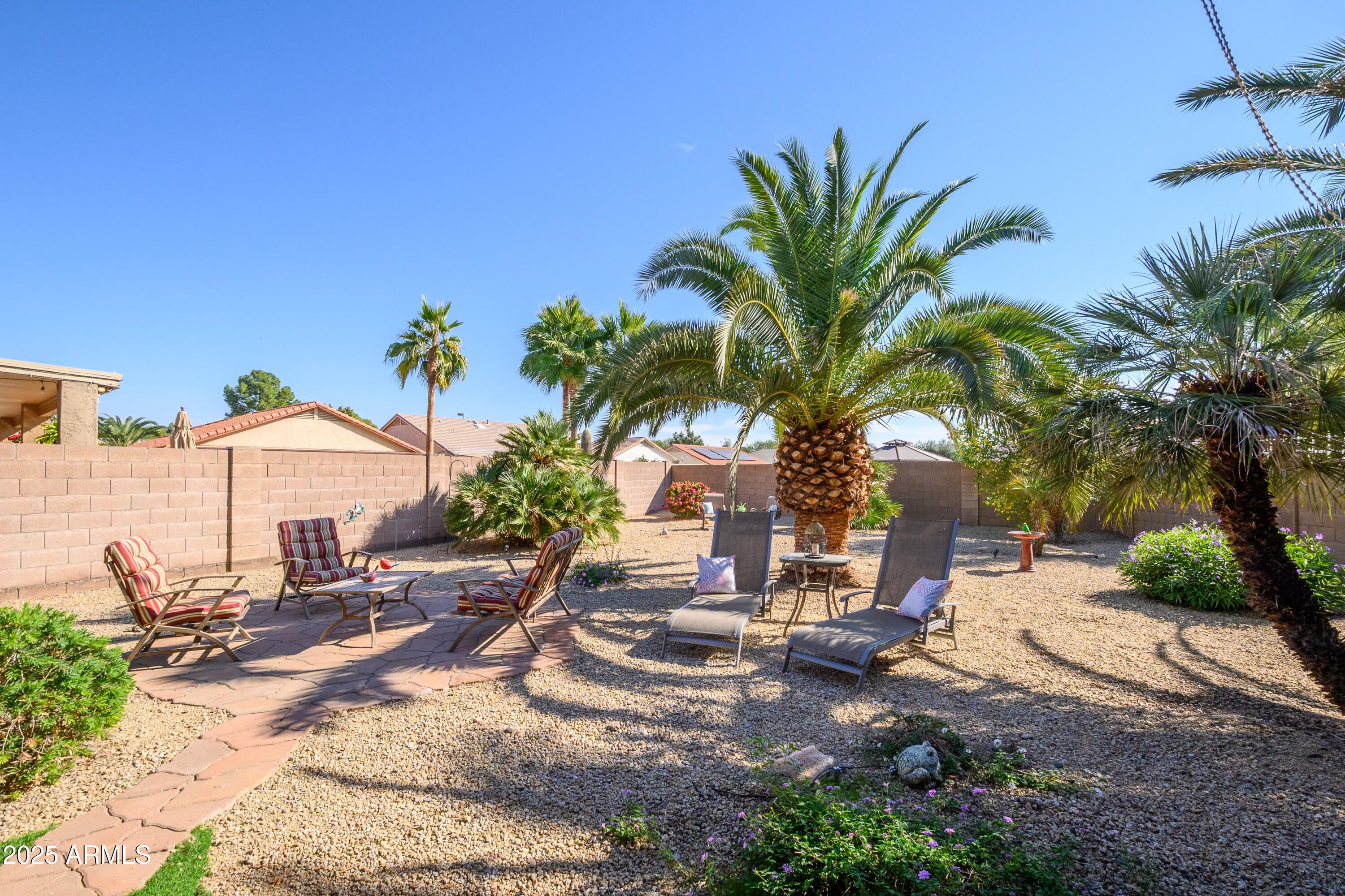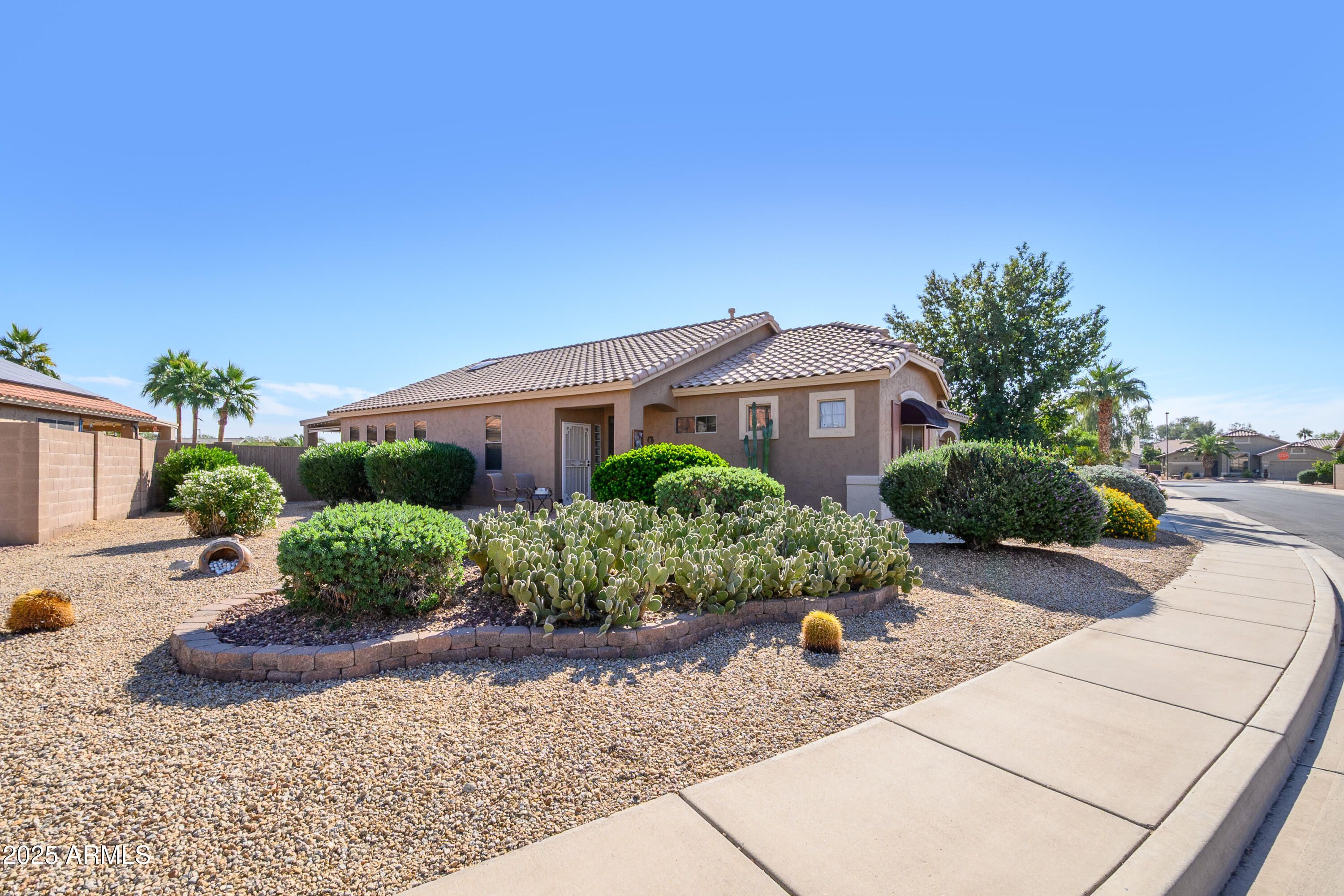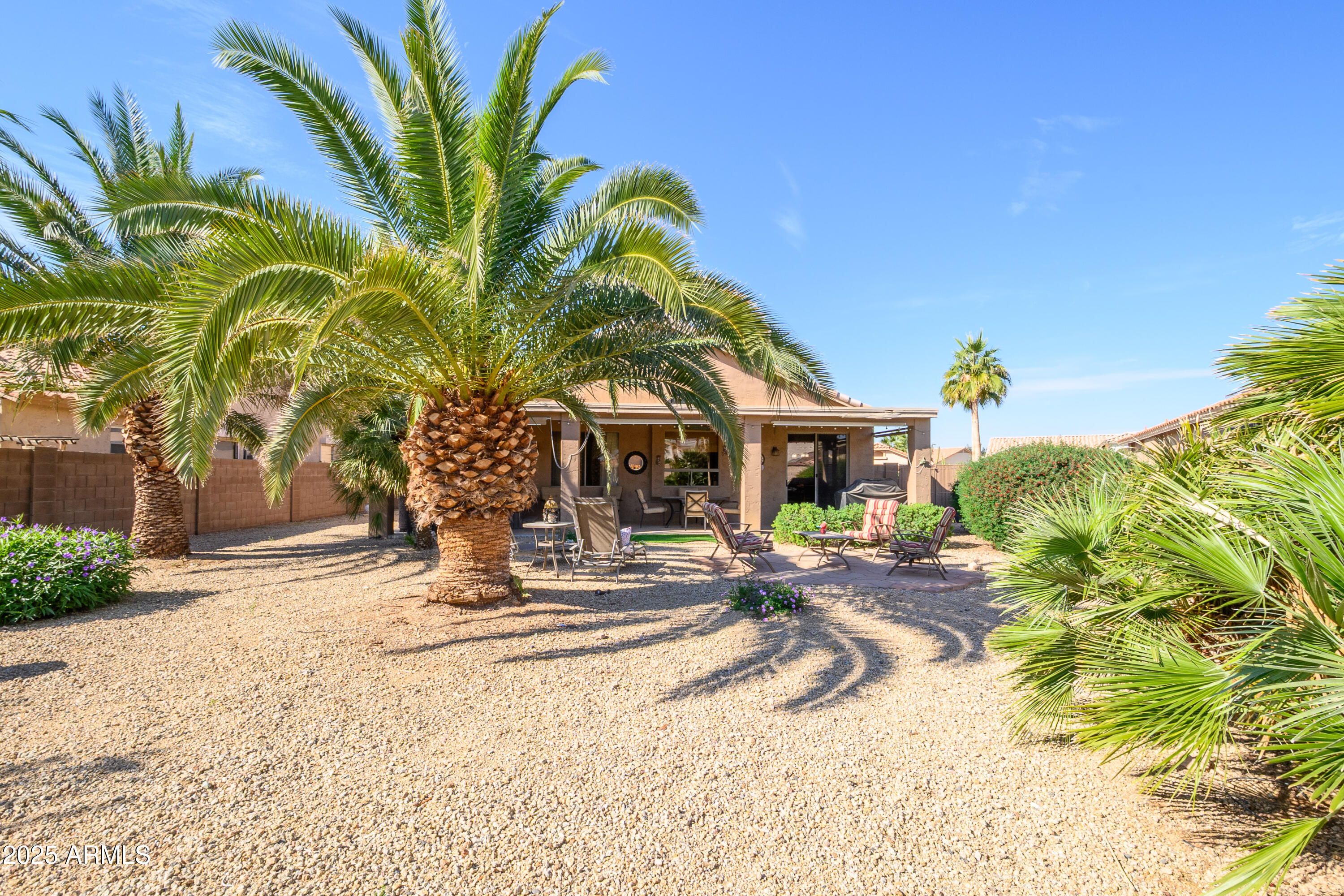 WHAT A FIND! This ideal move in ready home -furnished from top to bottom, is waiting for you, just bring your suitcase! This popular La Posada home features a highly sought after 3 car garage and is on an expanded 10,113 sq. ft. lot that offers privacy & the potential for you to create your own private oasis. Mature landscaping & palm trees complement the backyard experience & the covered patio w/ roller shades & open spaces is perfect for outdoor living & entertaining. The kitchen features a newer refrigerator, granite countertops, a breakfast bar, adjacent dining area all w/ a gorgeous view of the backyard. The main ensuite bedroom is nicely sized & has a walk in shower & closet. The guest bedroom & bath are on the opposite side of the home offering privacy for all. A den w/ double doors provides the perfect space for working at home or for a craft person. A great location within Arizona Traditions, close to events, amenities, sports & fitness & walking trails. Come join a fun community at Arizona Traditions, also close to shopping, freeway access, & entertainment. Made for full-time or seasonal living. With the security gate and 24 hr guards feel secure to lock & leave.