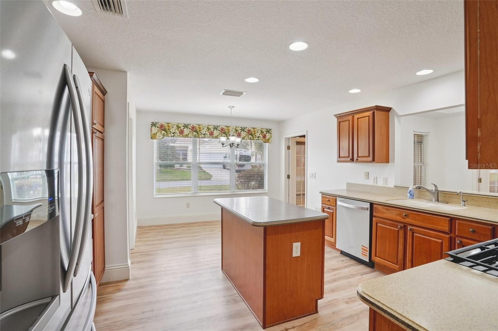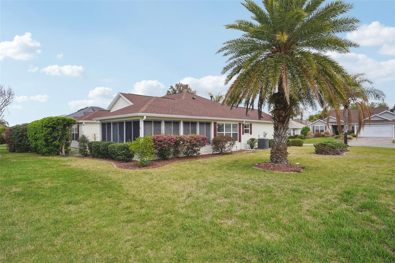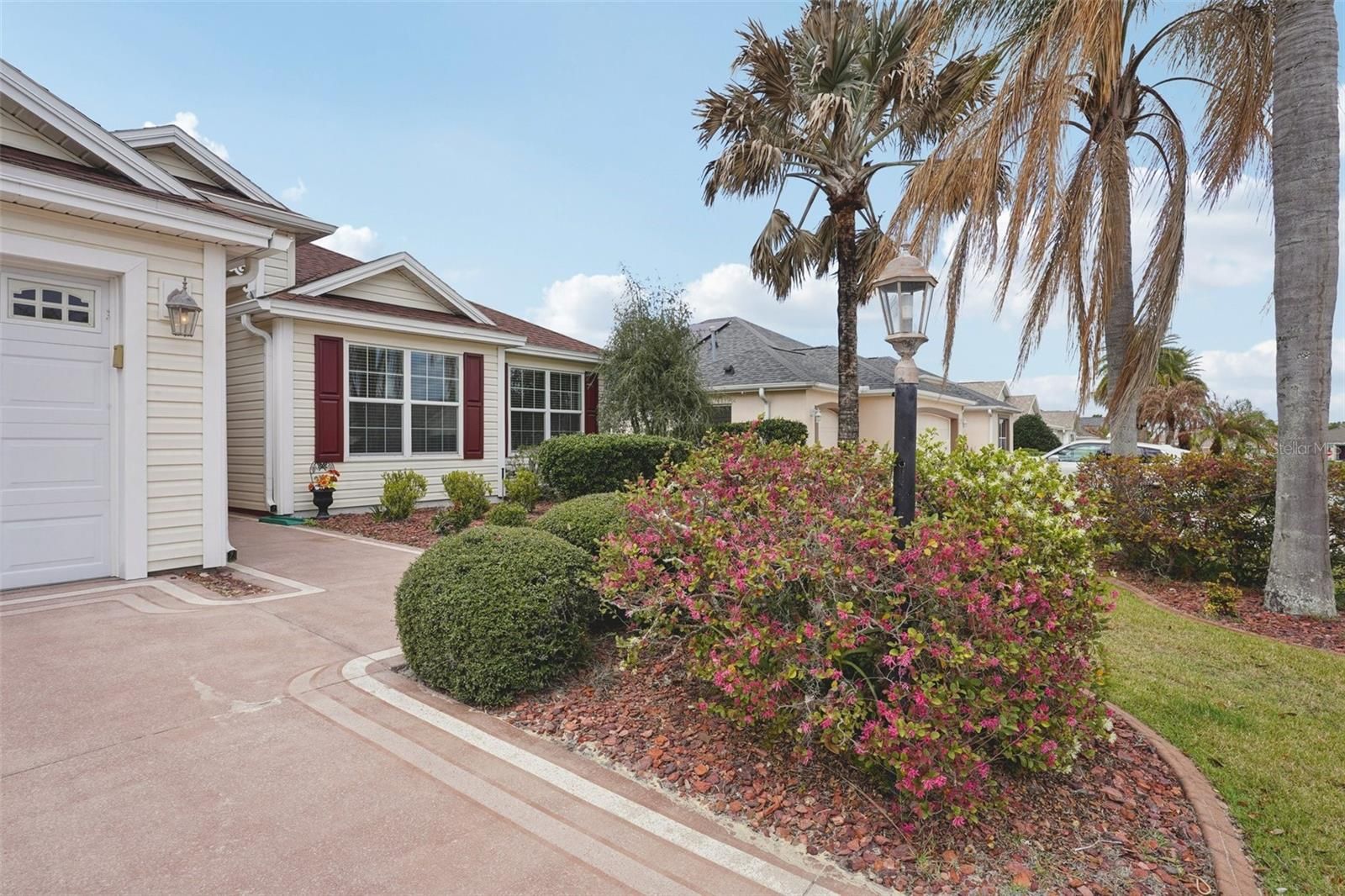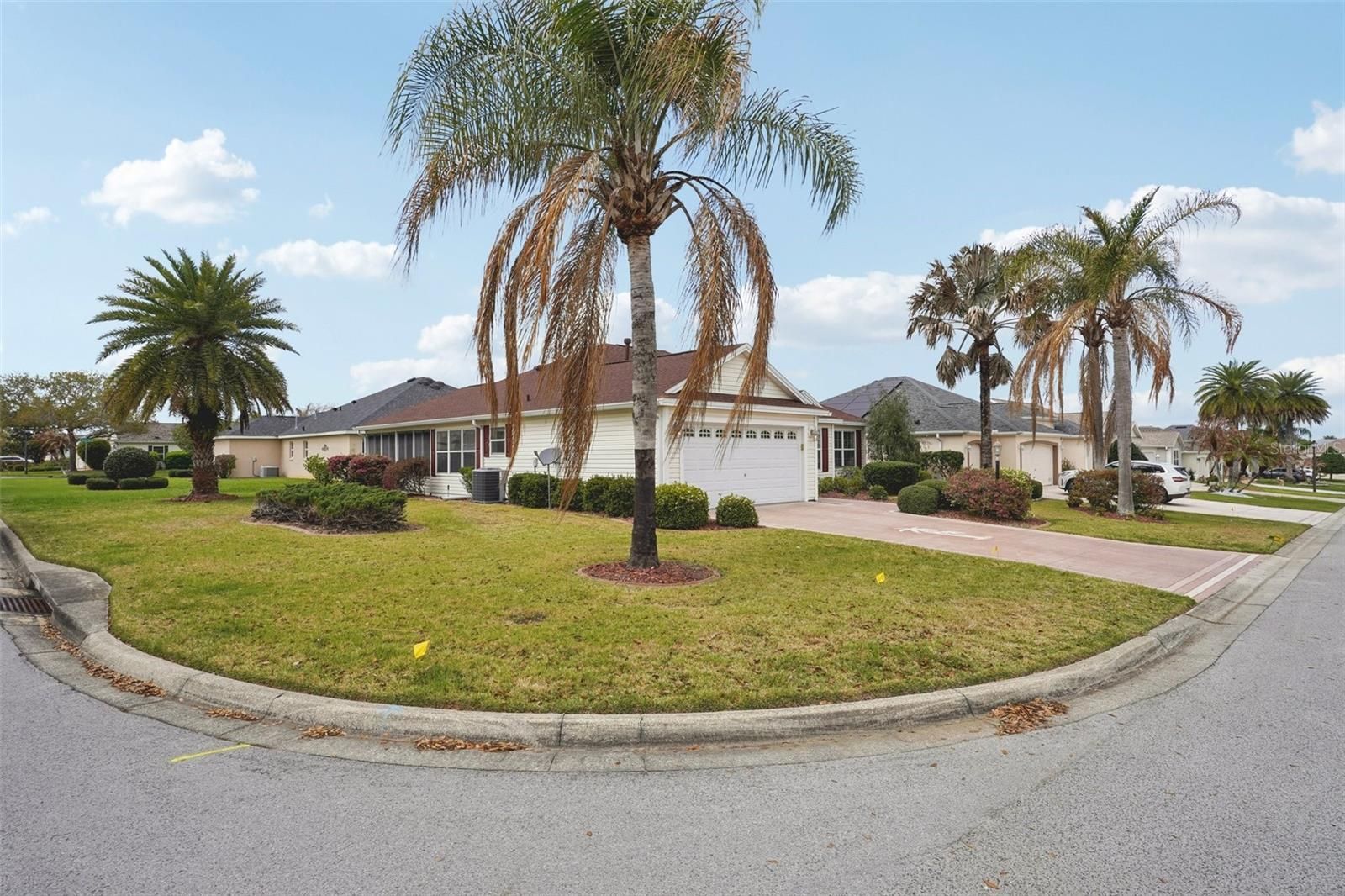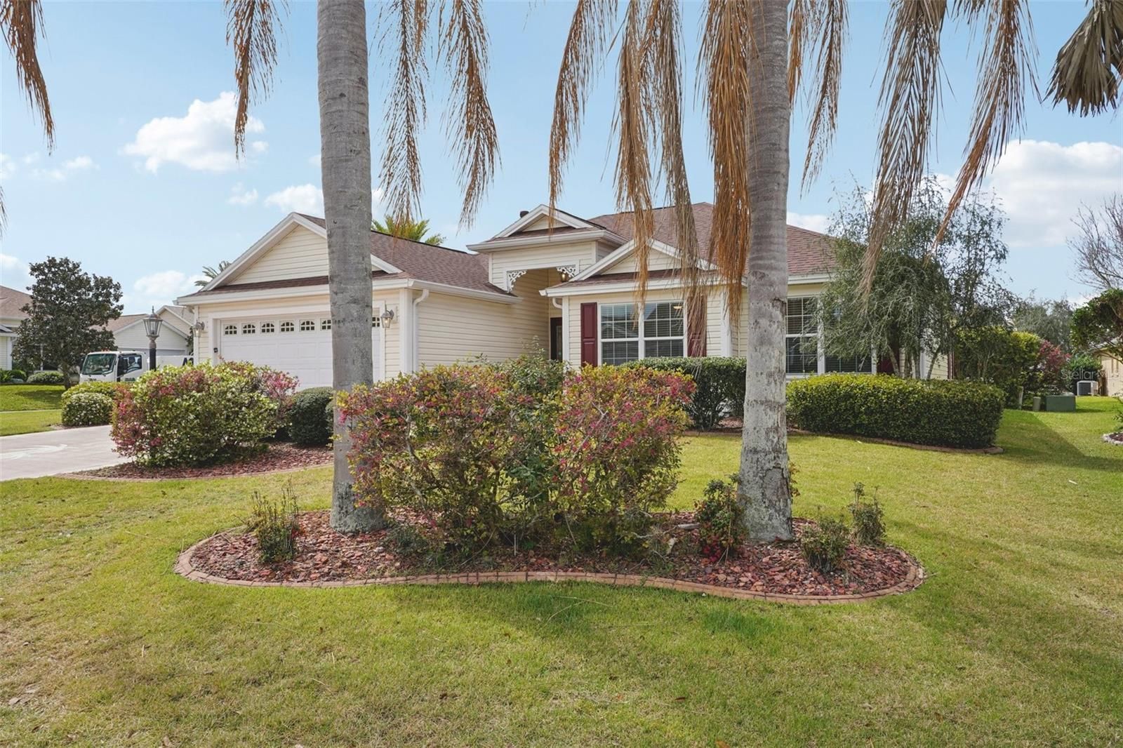 BOND PAID and Location, Location, Location. Just finished New Paint, New Appliances, New LVP Flooring, and New Fixtures. This 3-bedroom 2-bath Oleander Designer in the Village of SABAL CHASE sits on a Corner Lot, and has Mature Landscaping. Home Features: New Roof August 2023, HVAC Nov 2020, Water Heater January 2013, Island in Kitchen with Cherry finish cabinets and pull-out drawers, Corian Countertops, Eat-n-Kitchen, Formal Dining Room and French doors that open to the lanai, L-Shaped Lanai with Tile Floor, Private Patio, Water Filtration, and Radiant Roof Barrier in attic. The Garage has pull-down attic steps, a work bench, cabinets for plenty of storage, shelving, and a Garage Door with a Screen Garage Door. The Driveway and Walkway is Painted, and there is a 2012 Yamaha Gas Golf Cart. Just 1.1 mile from Sumter Landing off Canal Street. The Primary Bedroom has two walk-in closets, dual vanity, water closet with door, and a walk-in tile shower. Schedule your private showing today—or request a FaceTime tour if you’re out of the area—and experience all this beautiful property provides.