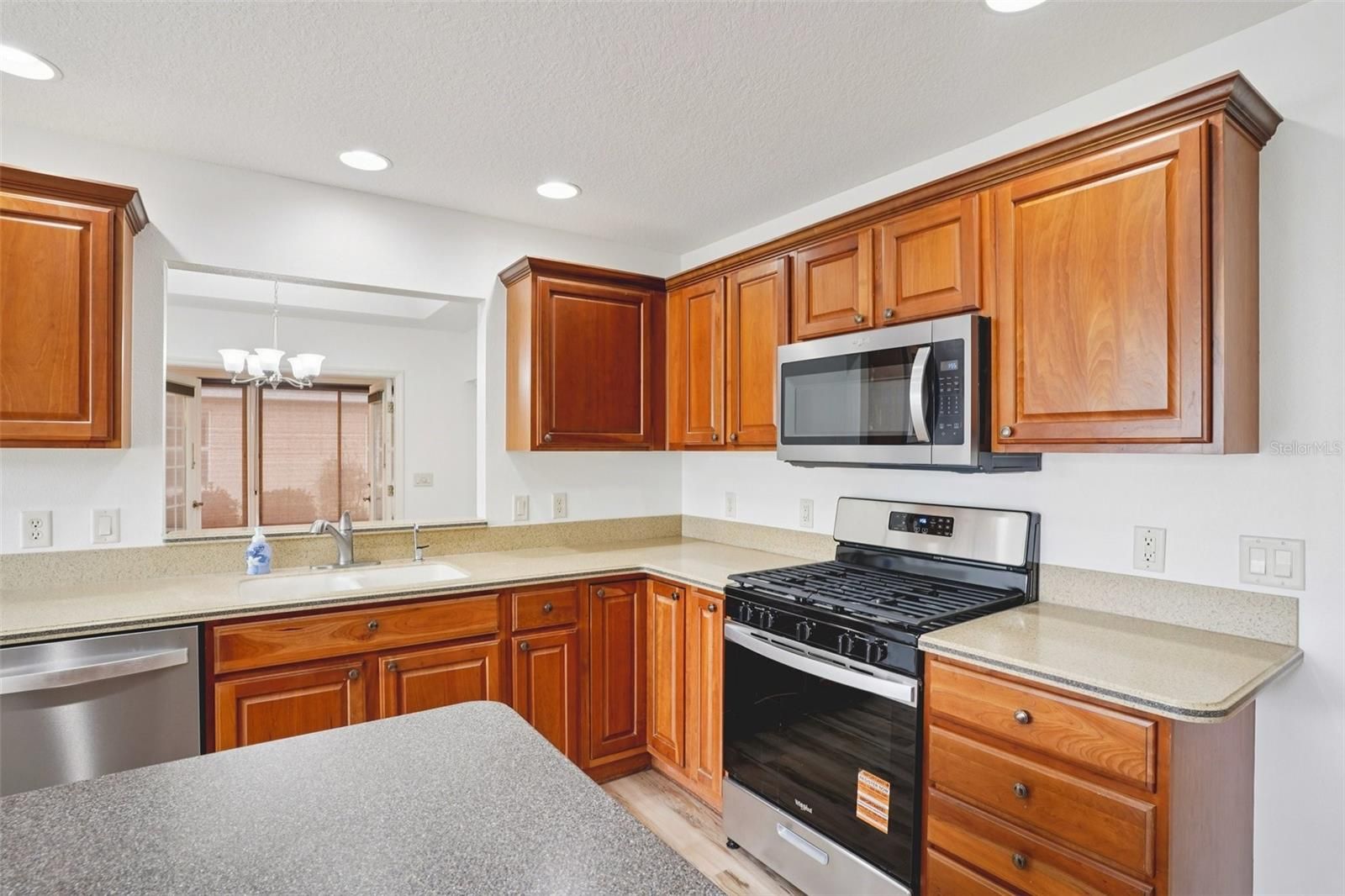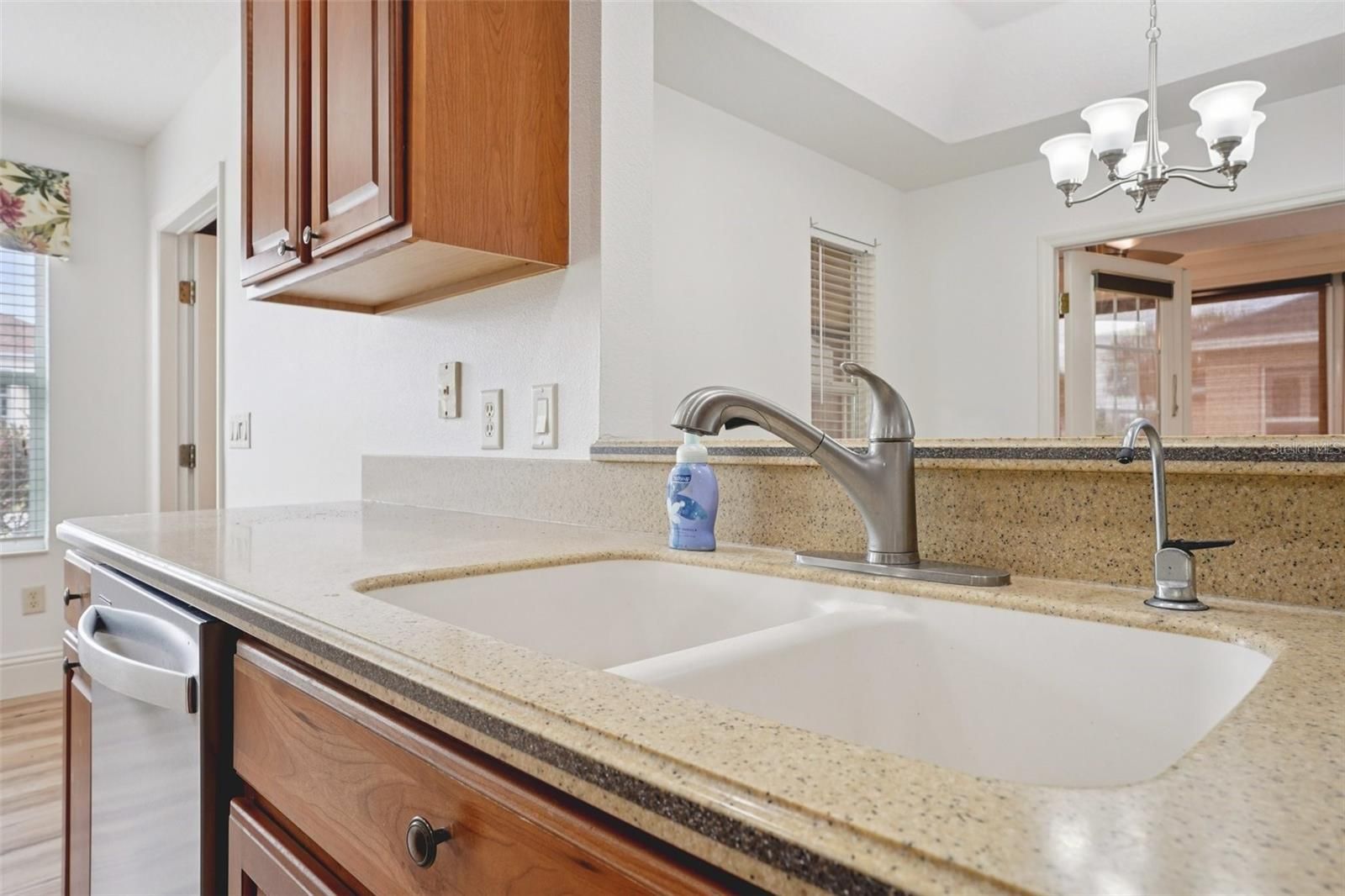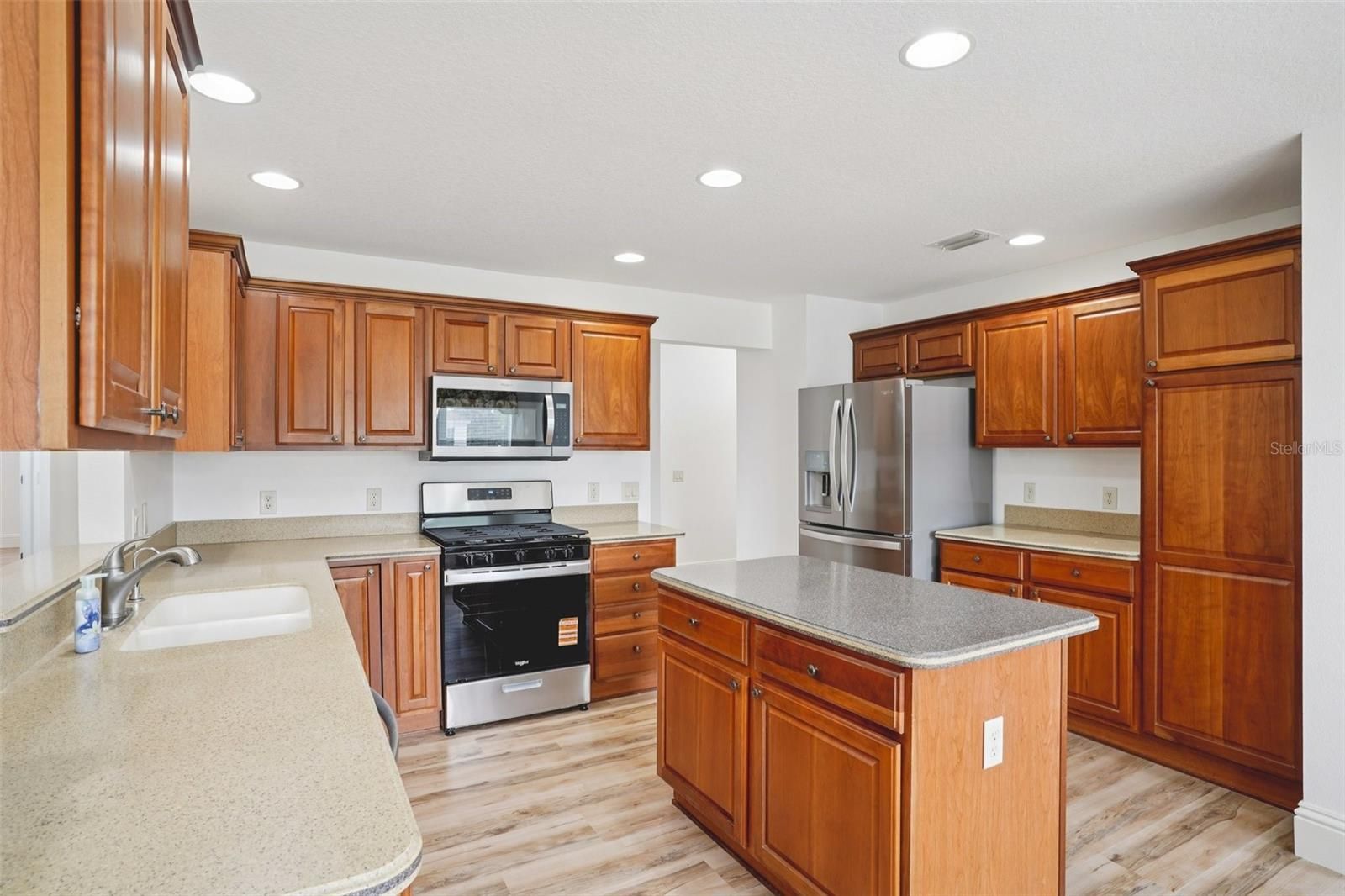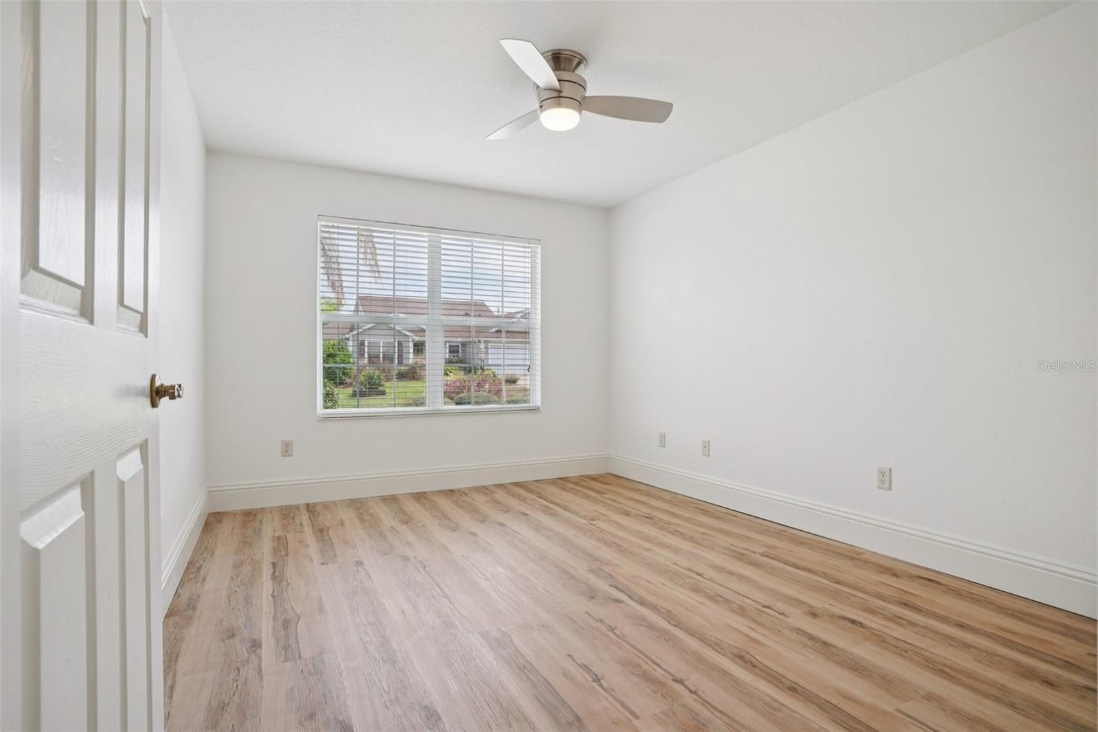 BOND PAID and Location, Location, Location. Just finished New Paint, New Appliances, New LVP Flooring, and New Fixtures. This 3-bedroom 2-bath Oleander Designer in the Village of SABAL CHASE sits on a Corner Lot, and has Mature Landscaping. Home Features: New Roof August 2023, HVAC Nov 2020, Water Heater January 2013, Island in Kitchen with Cherry finish cabinets and pull-out drawers, Corian Countertops, Eat-n-Kitchen, Formal Dining Room and French doors that open to the lanai, L-Shaped Lanai with Tile Floor, Private Patio, Water Filtration, and Radiant Roof Barrier in attic. The Garage has pull-down attic steps, a work bench, cabinets for plenty of storage, shelving, and a Garage Door with a Screen Garage Door. The Driveway and Walkway is Painted, and there is a 2012 Yamaha Gas Golf Cart. Just 1.1 mile from Sumter Landing off Canal Street. The Primary Bedroom has two walk-in closets, dual vanity, water closet with door, and a walk-in tile shower. Schedule your private showing today—or request a FaceTime tour if you’re out of the area—and experience all this beautiful property provides.