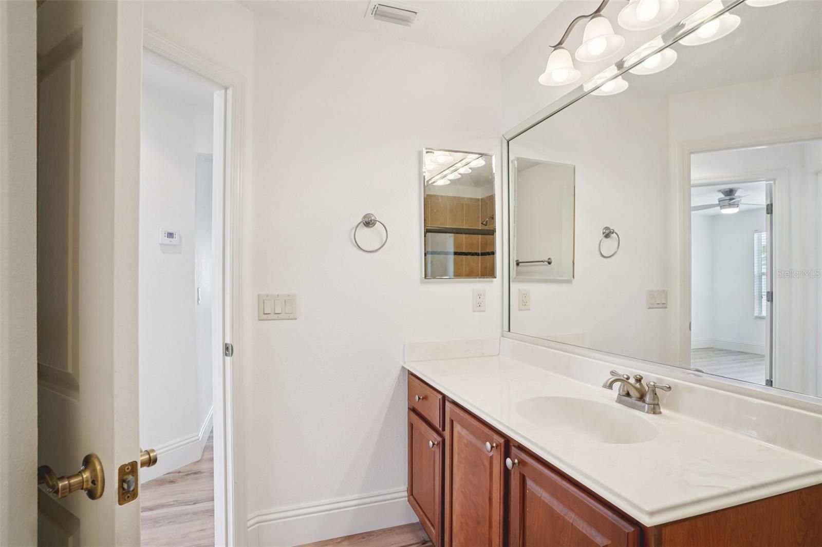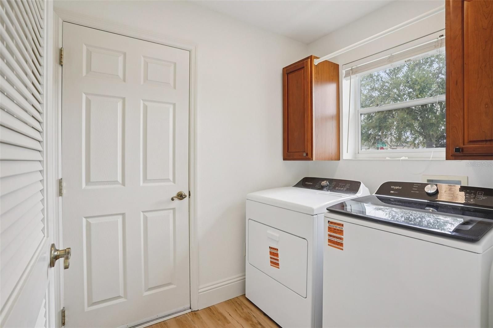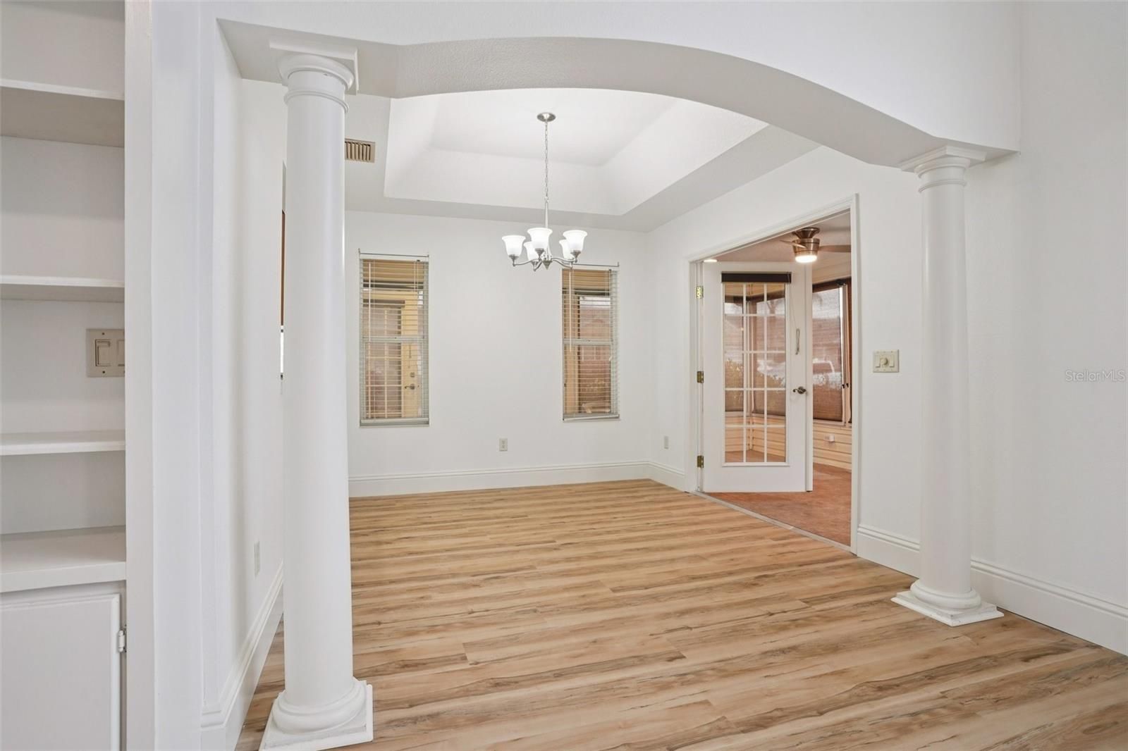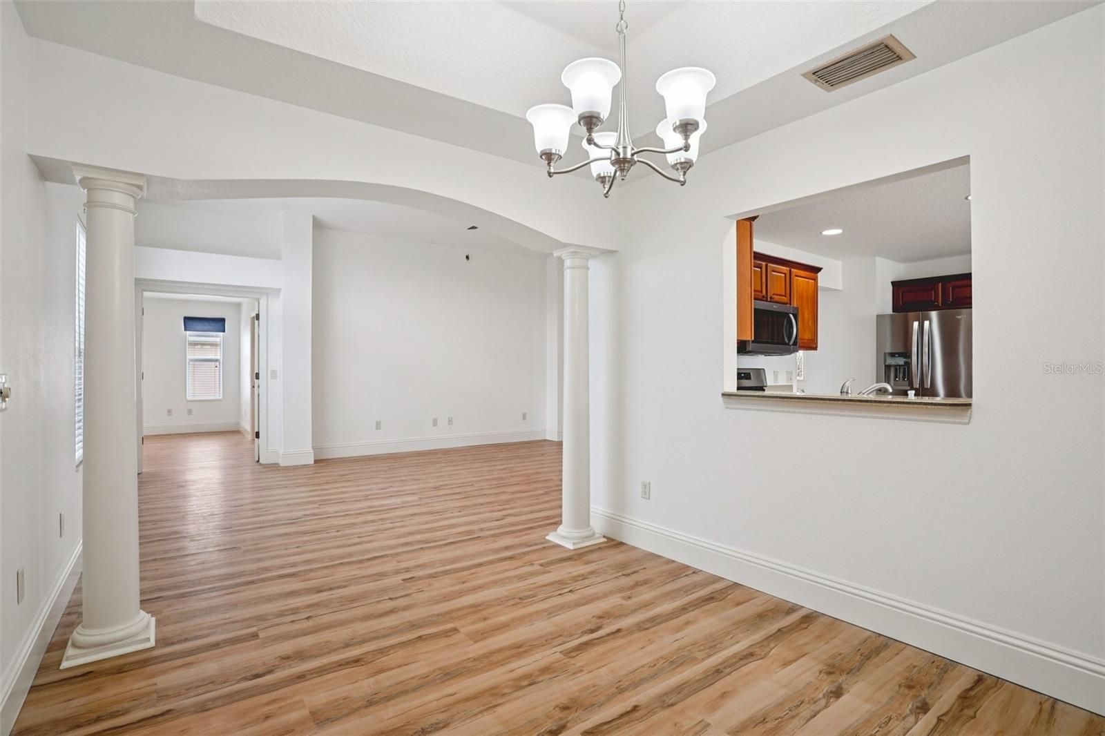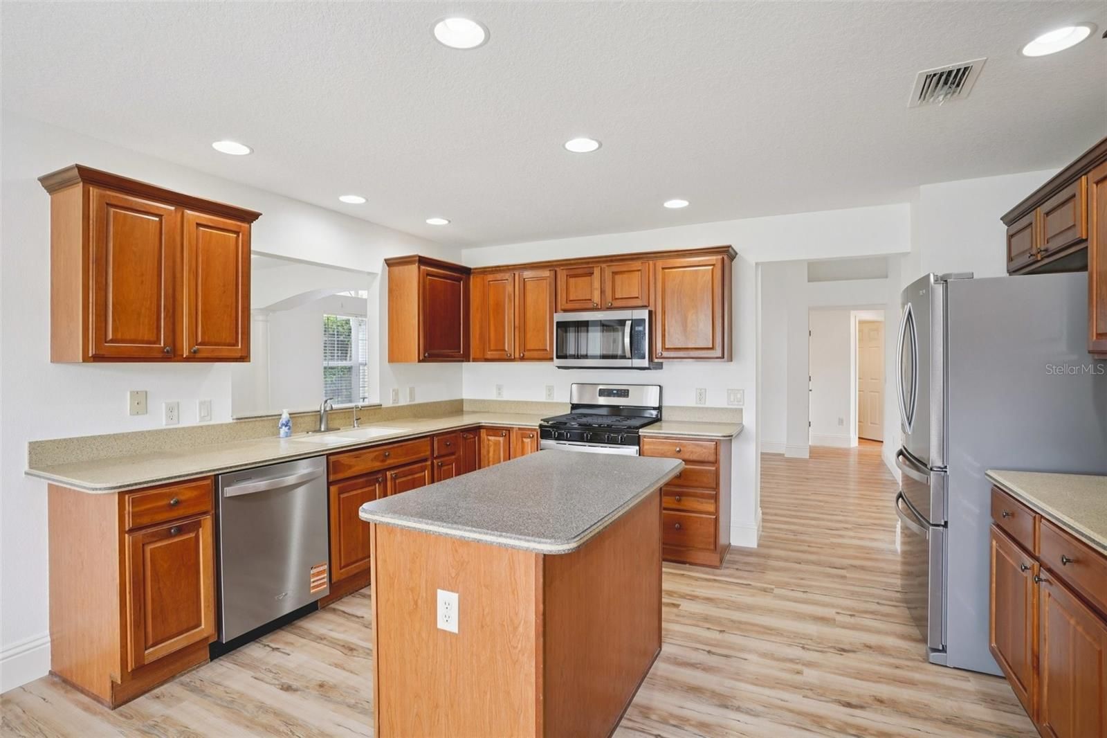 BOND PAID and Location, Location, Location. Just finished New Paint, New Appliances, New LVP Flooring, and New Fixtures. This 3-bedroom 2-bath Oleander Designer in the Village of SABAL CHASE sits on a Corner Lot, and has Mature Landscaping. Home Features: New Roof August 2023, HVAC Nov 2020, Water Heater January 2013, Island in Kitchen with Cherry finish cabinets and pull-out drawers, Corian Countertops, Eat-n-Kitchen, Formal Dining Room and French doors that open to the lanai, L-Shaped Lanai with Tile Floor, Private Patio, Water Filtration, and Radiant Roof Barrier in attic. The Garage has pull-down attic steps, a work bench, cabinets for plenty of storage, shelving, and a Garage Door with a Screen Garage Door. The Driveway and Walkway is Painted, and there is a 2012 Yamaha Gas Golf Cart. Just 1.1 mile from Sumter Landing off Canal Street. The Primary Bedroom has two walk-in closets, dual vanity, water closet with door, and a walk-in tile shower. Schedule your private showing today—or request a FaceTime tour if you’re out of the area—and experience all this beautiful property provides.