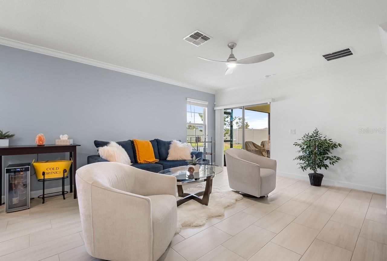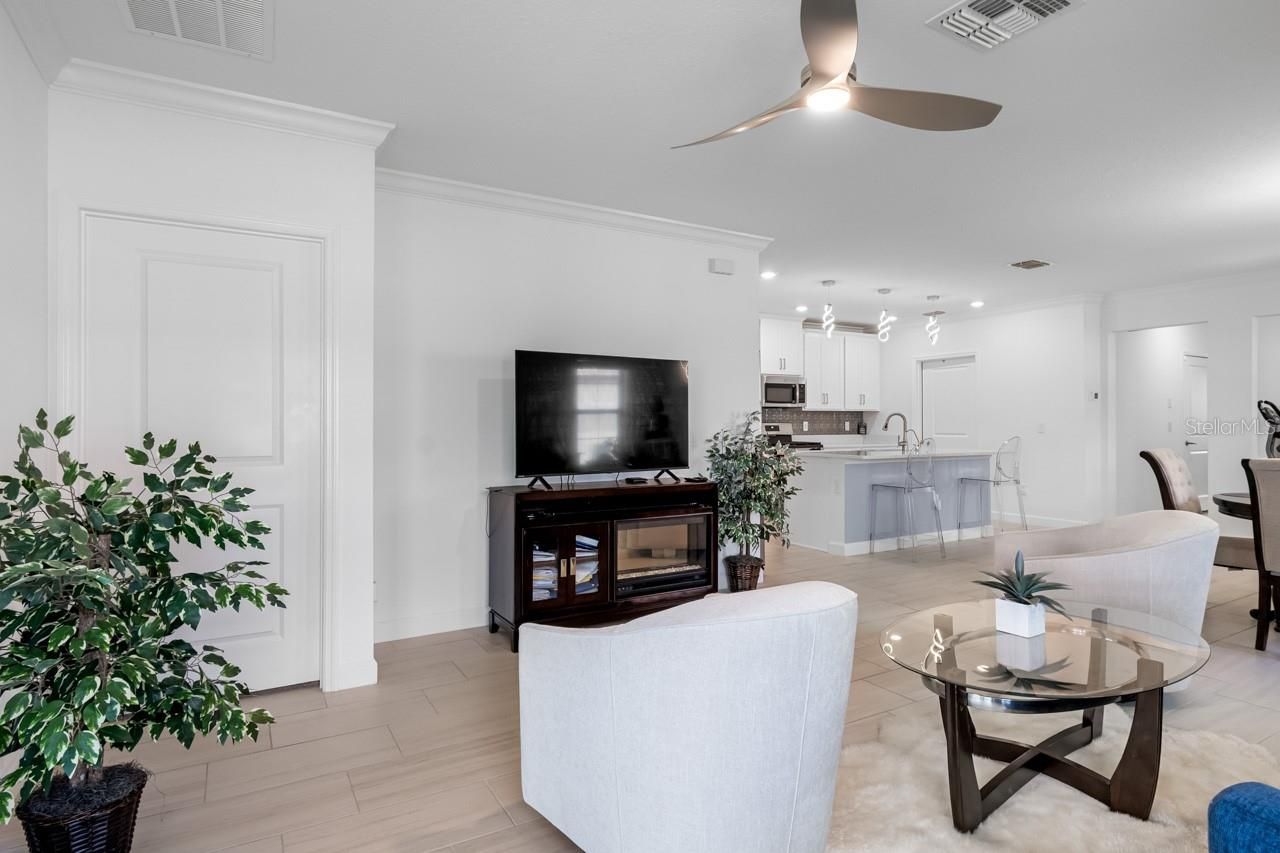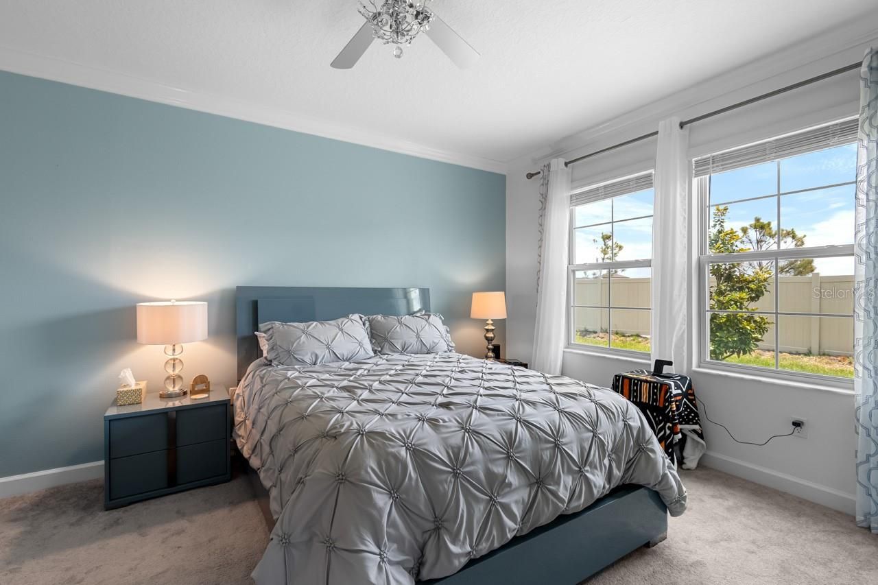 Luxury amenities await you in this LIKE NEW 2-bedroom + Den, 2-bathroom, 1-car garage MOVE-IN READY home in the active 55+ Medley neighborhood within the gorgeous Southshore Bay community! PAVER DRIVEWAY, QUARTZ COUNTERTOPS, easy-to-maintain CERAMIC TILE FLOORING in all wet areas, and plush carpet in both bedrooms. Enter into the OPEN CONCEPT Great Room to find the living and dining areas to your left and the open den to your right. The kitchen features CROWN MOLDING, a WALK-IN PANTRY, an ISLAND with BREAKFAST BAR seating, and all STAINLESS STEEL APPLIANCES including the GAS RANGE! Off the kitchen is the conveniently placed Laundry Room with built-in cabinetry, a washer, and a GAS DRYER. The opulent primary suite boasts a deep WALK-IN CLOSET and an EN-SUITE BATHROOM complete with a DUAL-SINK VANITY, shower stall, water closet, and linen closet. Positioned across from the primary in this SPLIT-BEDROOM LAYOUT is the secondary full bathroom with its shower and single vanity, along with the second bedroom. The garage provides lit ATTIC STORAGE via the pull-down ladder, and the COVERED & SCREENED LANAI includes a ceiling fan for enjoying the outdoors in comfort. Enjoy a wide range of resort-style amenities exclusive to living in Medley, such as their clubhouse, pickleball courts, resort-style pool, billiard room, ballroom, an on-site cafe & bar, and the state-of-the-art fitness center! In addition to these amenities are those available to all of Southshore Bay, most notably the incredible 5-acre crystal clear lagoon: kayak, paddleboard, swim, or visit the swim-up bar! Enjoy a carefree and relaxed lifestyle here, where everyday can feel like a vacation.