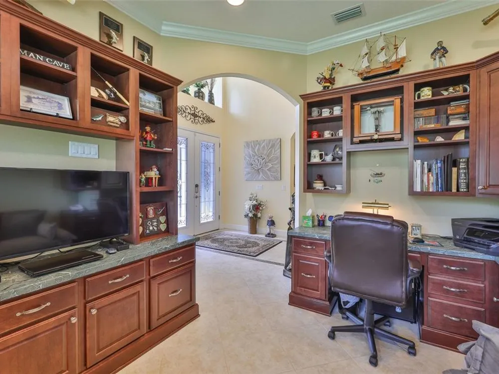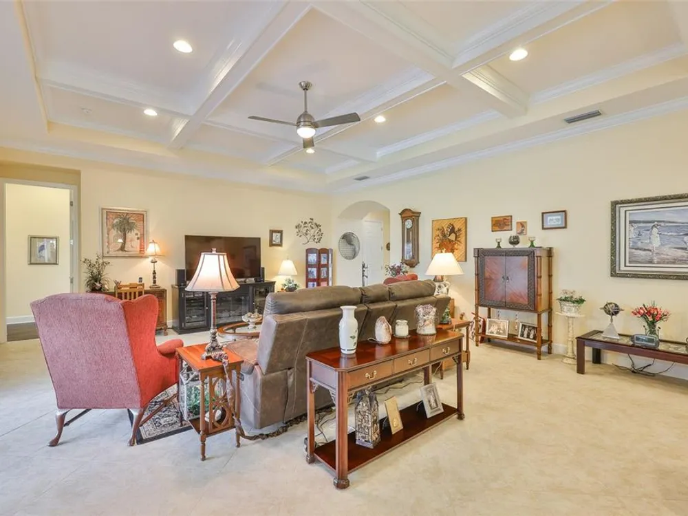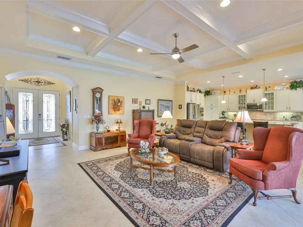 - Built-in Features, Ceiling Fan(s), Coffered Ceiling(s), Crown Molding, Eat-in Kitchen, High Ceilings, Open Floorplan, Solid-Wood Cabinets, Stone Counters, Walk-In Closet(s), Window Treatments