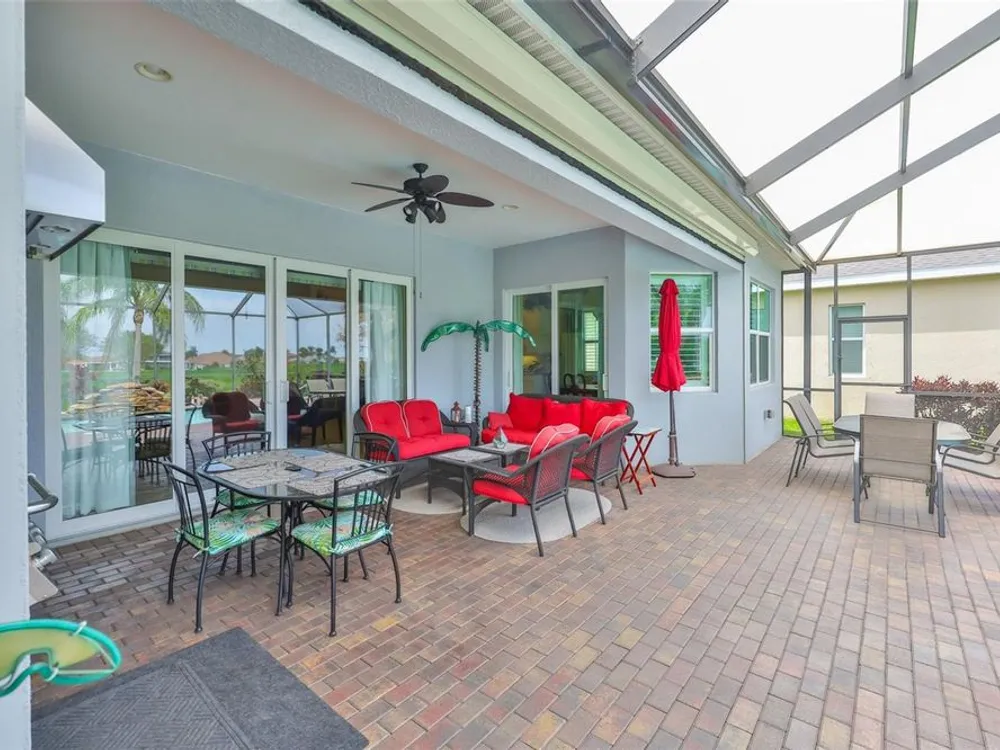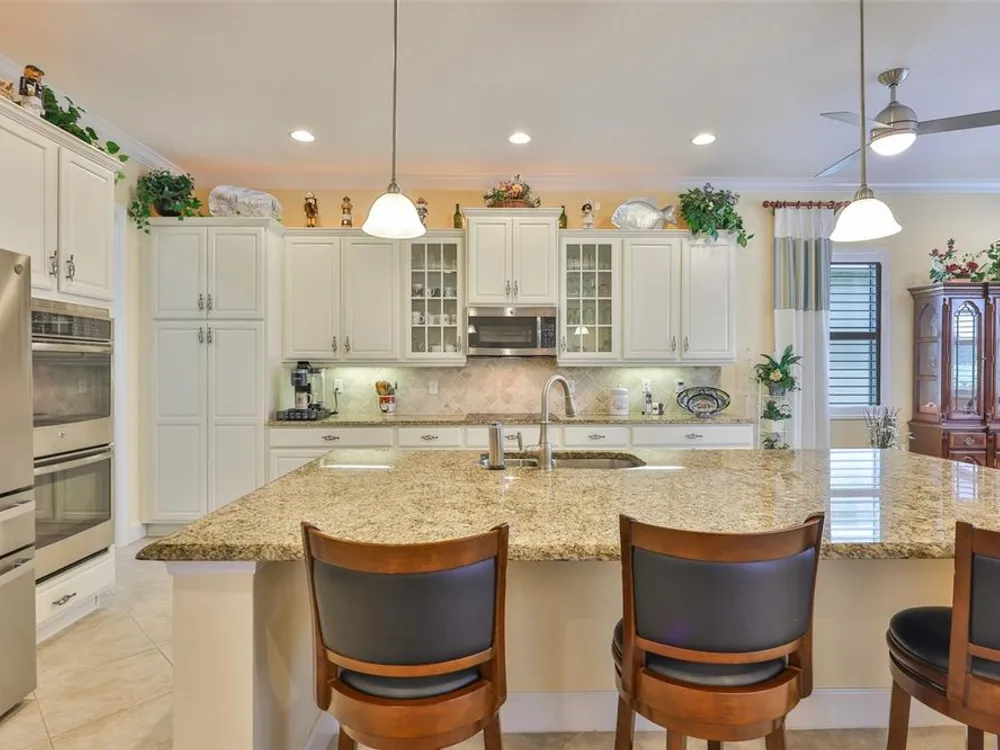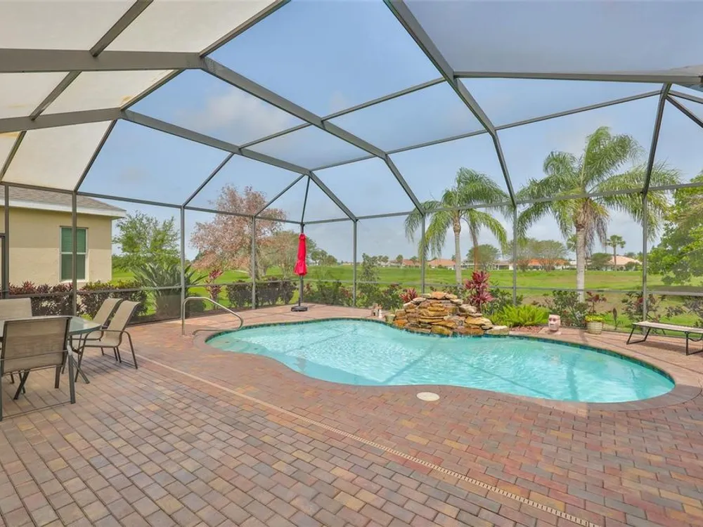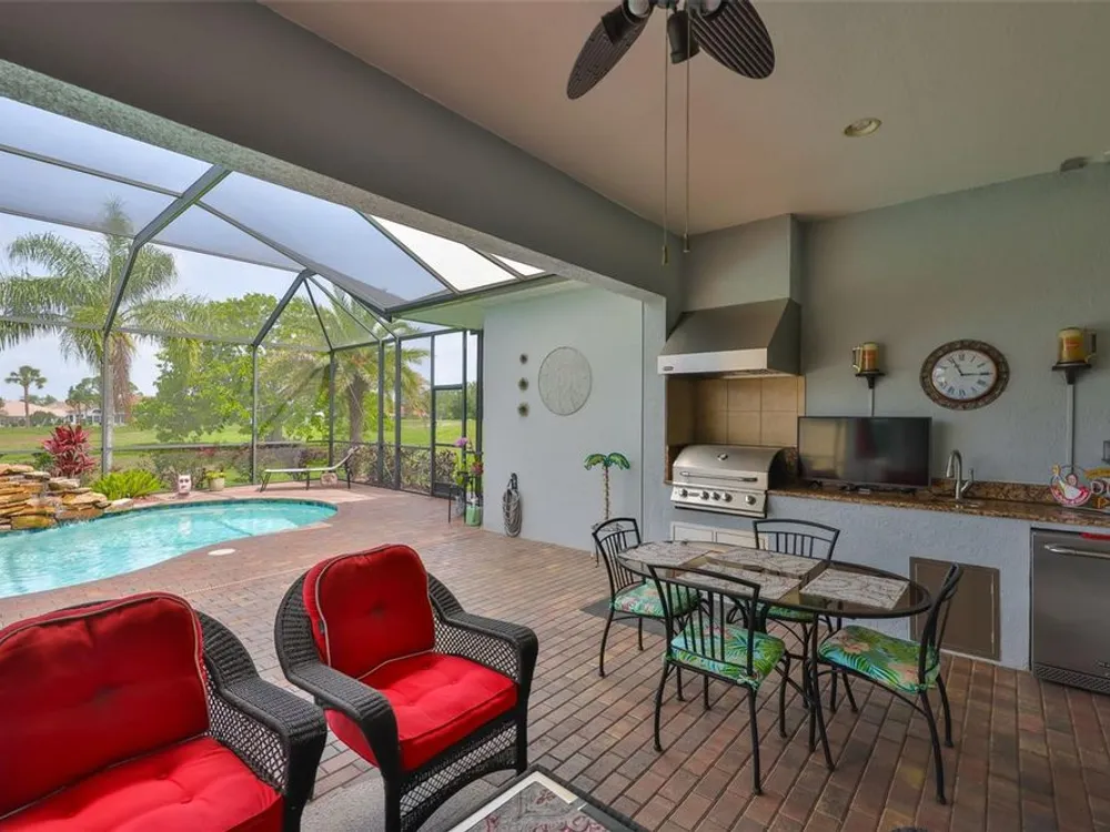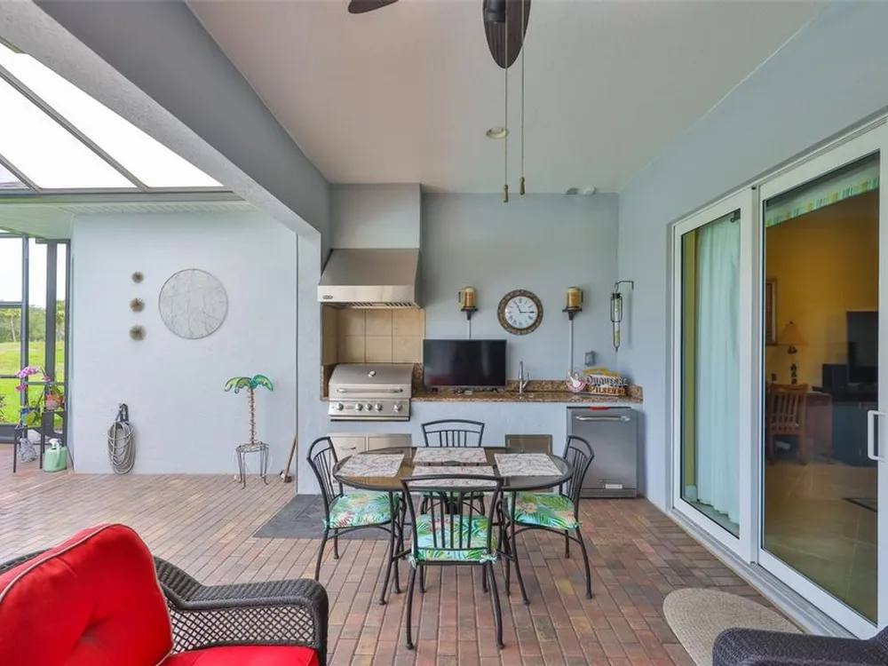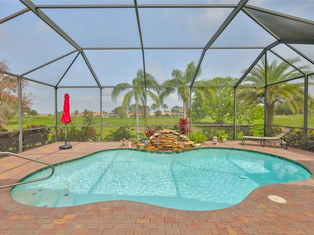CLICK ON 3D TOUR ABOVE ------- STUNNING HOME FEATURING 3 CAR GARAGE, IMPACT WINDOWS, HEATED SALT WATER POOL, 2 PRIVATE OWNERS' SUITES, NEW ROOF (2025) PLUS UPGRADES GALORE!! (COMPLETE LIST OF ALL UPGRADES IS AVAILABLE). Welcome to active retirement living in the premier 55+ GATED COMMUNITY of Verona, where you'll feel like you're on vacation every day! This immaculate and perfectly maintained 2 bedrooms & 2 1/2 bathrooms "MONTECITO" model offers almost 2400 sq ft of modern open living space. You'll love the elegant touches throughout, such as crown molding, coffered & tray ceilings, plantation shutters & custom window treatments (2020), tasteful decor and ceramic tile & hardwood flooring. The gourmet eat-in kitchen is a cook's dream with 42 inch white cabinetry w/pullouts, stainless appliances that include a double wall oven & induction cooktop (2022), granite counters and huge island for extra seating. The large great room is the perfect space for all your entertainment needs and allows your guests easy access to the lanai area. The den/office has beautiful custom built-in work spaces & bookshelves. For an added bonus, this home has 2 private owners' suites, both with plenty of closet space and lovely ensuite bathrooms. When you want to relax, retreat to your very own private oasis in the extended lanai that features a gorgeous heated salt-water pool w/custom waterfall, built-in outdoor kitchen w/gas grill, refrigerator & sink, plus a covered area for entertaining that has an impact screen for storm protection. HVAC WAS REPLACED 2023 AND WATER HEATER 2025. The new owner will have access to both Club Renaissance, where you can enjoy dining, drinks, fitness classes, spa, social activities PLUS all Sun City amenities such as shopping, restaurants, banking, doctors, numerous social clubs, pickleball and so much more, all accessible by golf cart. So come and view this beauty today and see why you'll want to call it home!