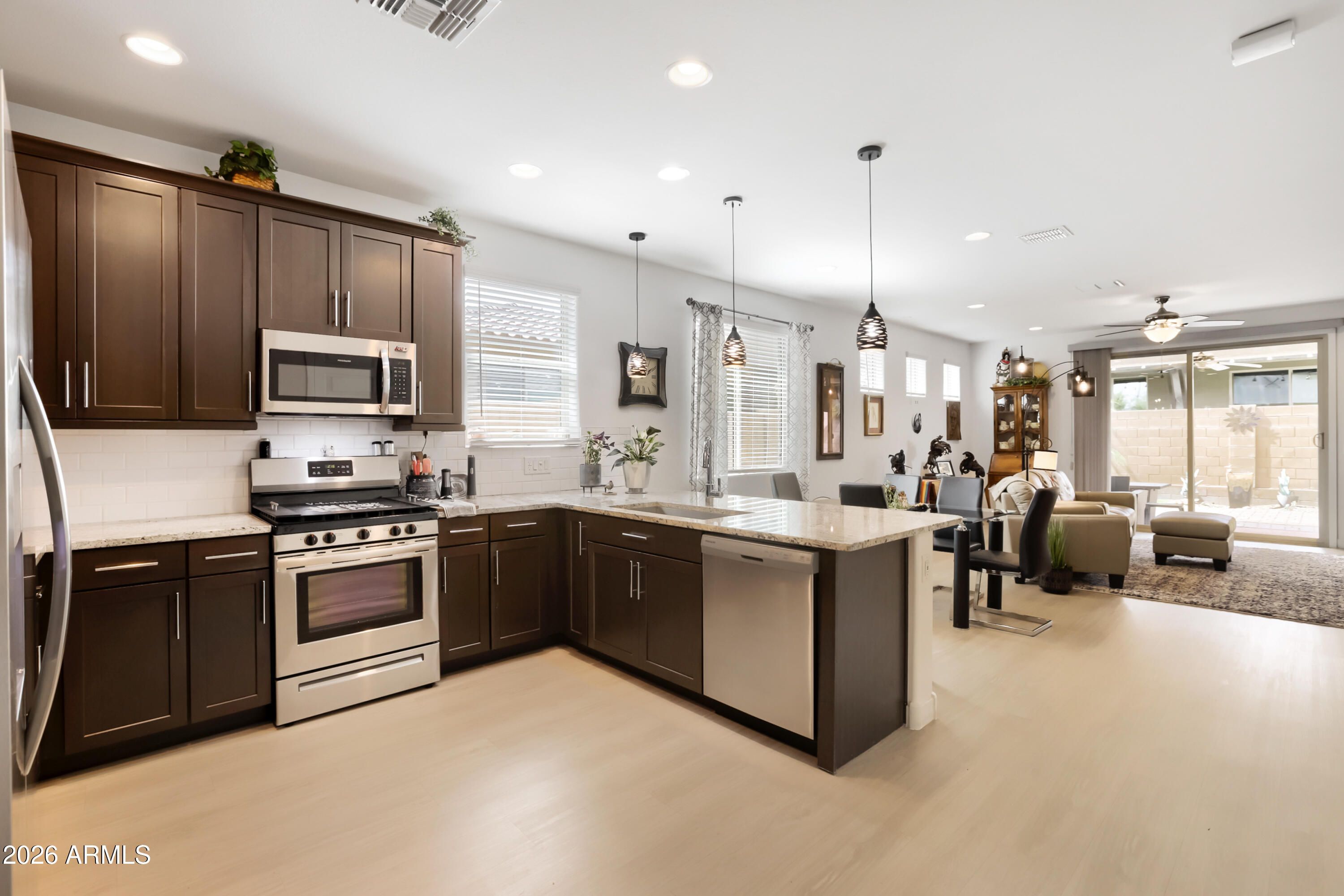 Gorgeous, upgraded 2BD, 2BA open concept home w/ great flow & enchanting BKYD. Stylish kitchen: Shaker cabs w/ crown molding; granite counters; stainless appliances; tile backsplash; pendant lights; breakfast bar. Entertainers delight! Customizable flex space near dining area. Owner's suite has large en suite w/ dual vanity; walk-in closet; shower w/ accessibility features; water closet. Cabs & counters in baths match kitchen. Guest BD is adjacent to full BA. Modern laminate floor, wide baseboards, fans & soothing color palette imbue a finished look. Low-maint. BKYD w/ covered patio; fountain; turf; pavers; gas BBQ stub. HOA maintains front yard. Plenty of storage & epoxy floor in garage. Nearby clubhouse w/ fitness center, pool, spa, pickleball & many other amenities. Gated 55+ community.