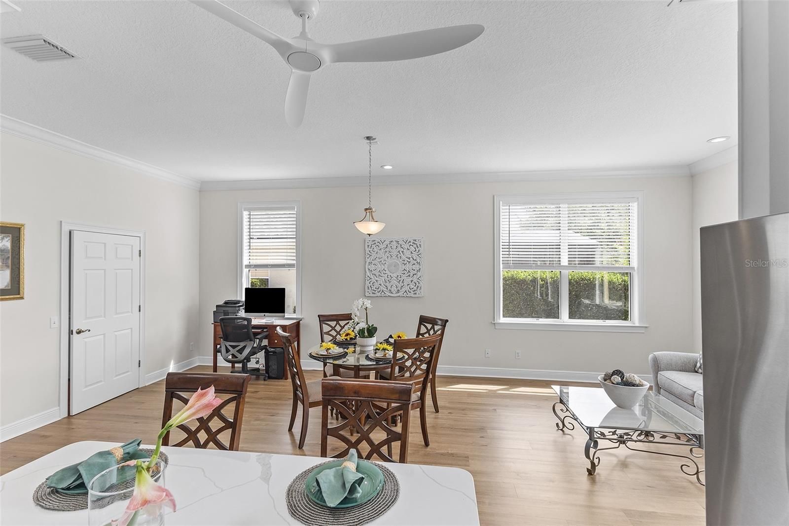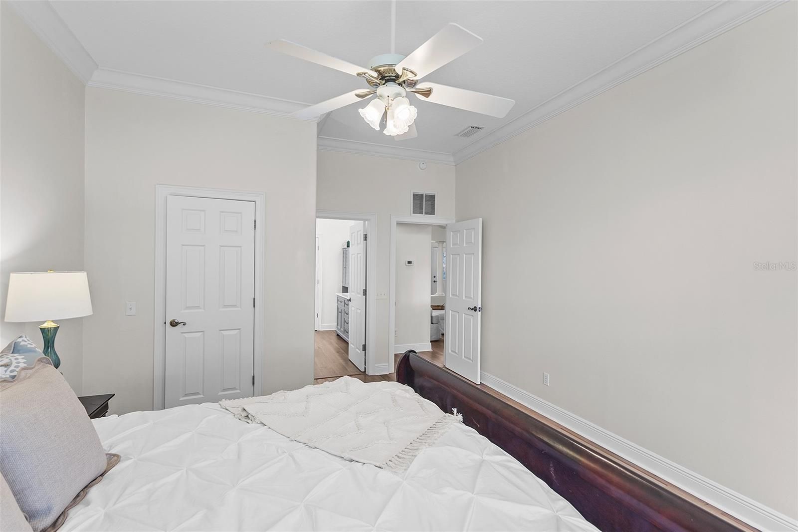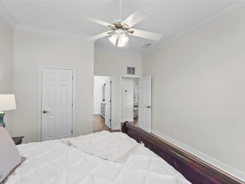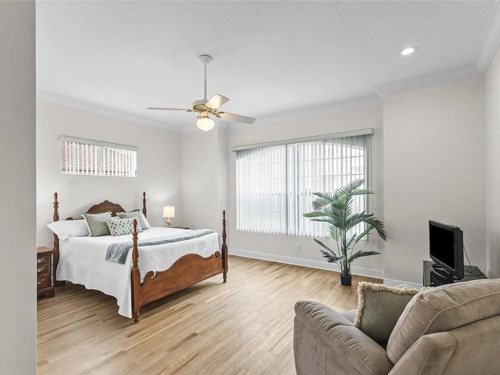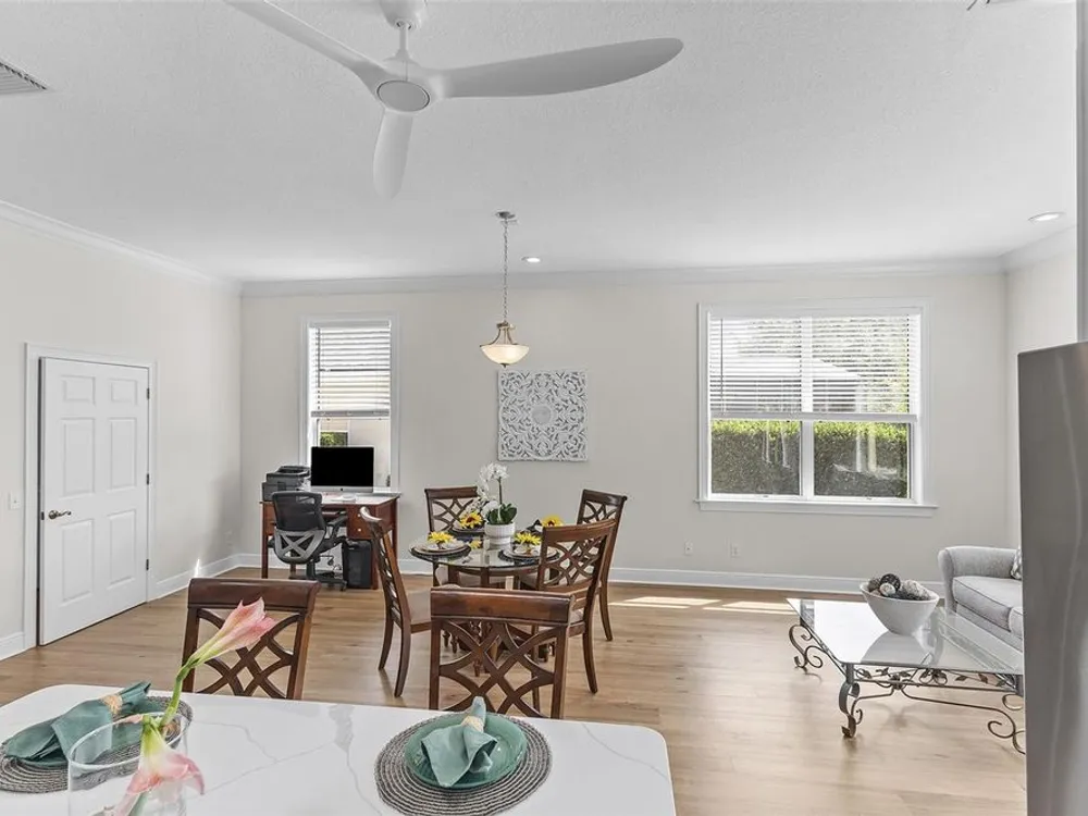 - Crown Molding, Eat-in Kitchen, High Ceilings, Kitchen/Family Room Combo, Main Level Primary, Split Bedrooms, Walk-In Closet(s), Window Treatments