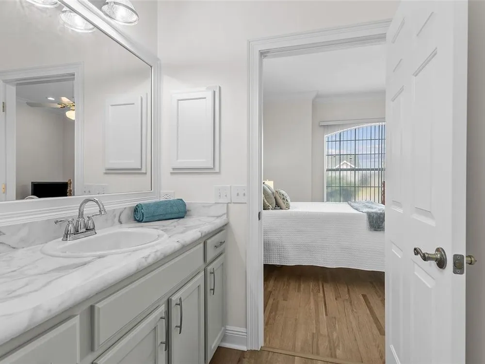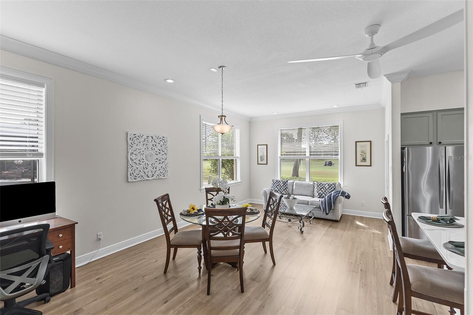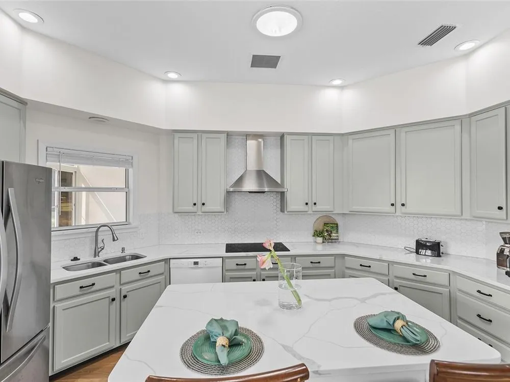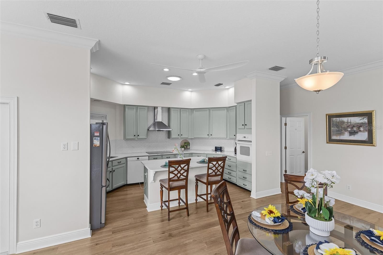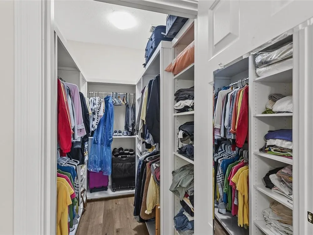 - Crown Molding, Eat-in Kitchen, High Ceilings, Kitchen/Family Room Combo, Main Level Primary, Split Bedrooms, Walk-In Closet(s), Window Treatments