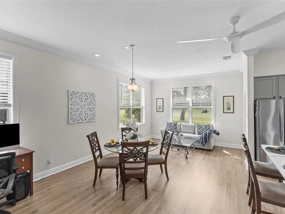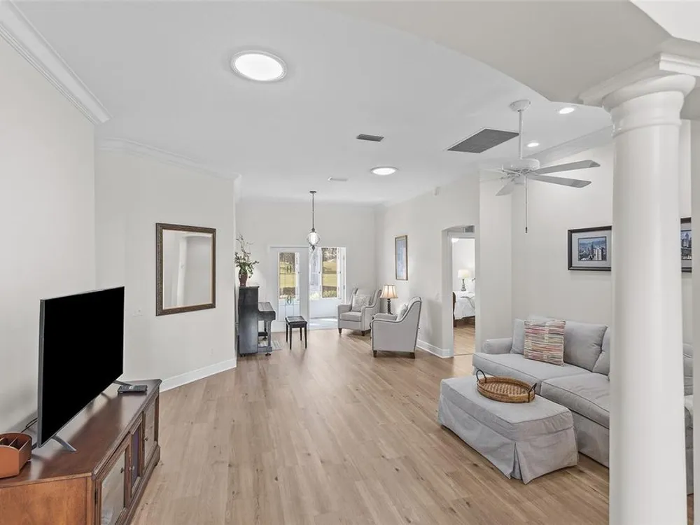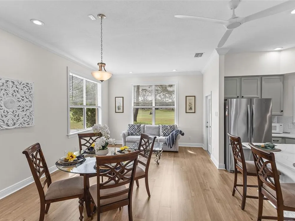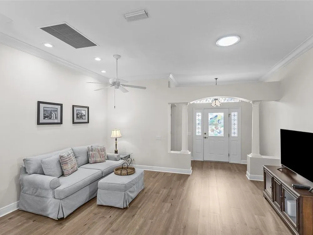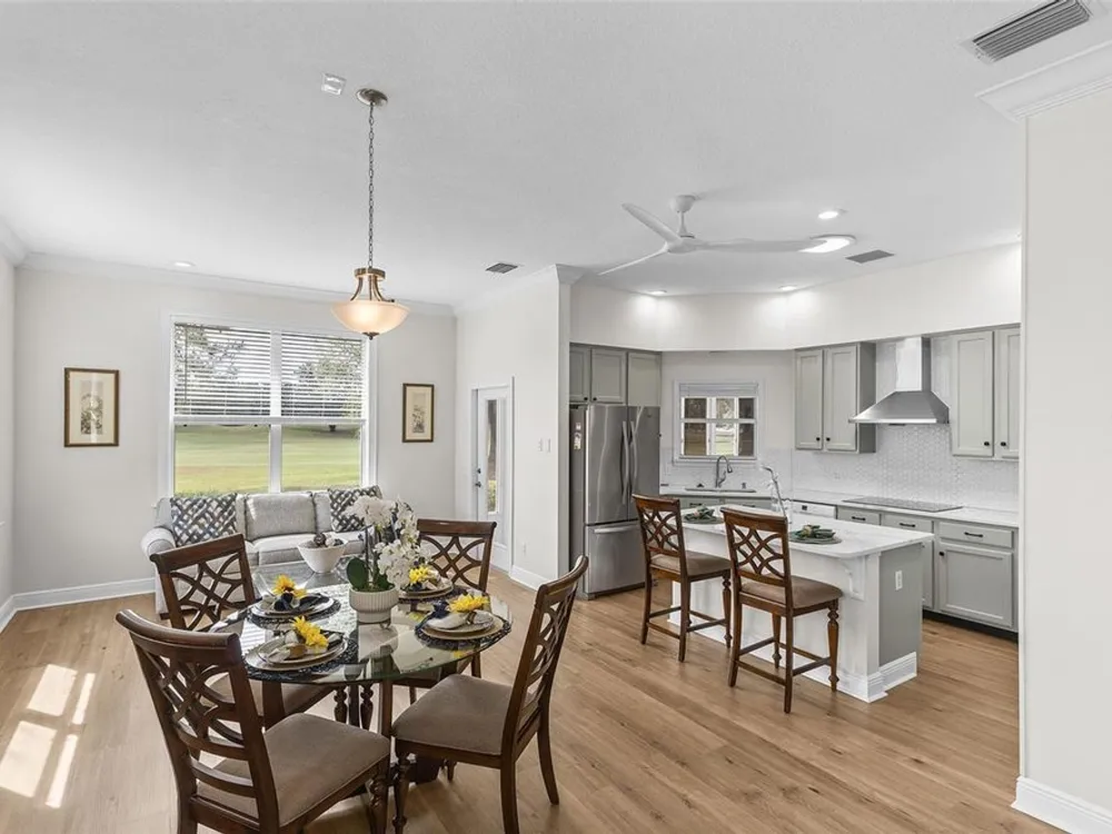 Welcome Home to this BEAUTIFULLY RENOVATED Las Cruces model in the conveniently located Village of Santo Domingo, offering a perfect blend of modern elegance and classic Florida living. From the moment you arrive, the curb appeal hints at the exceptional interior that awaits. Step inside to discover nearly 2,000 square feet of thoughtfully designed living space with soaring 10-foot ceilings, LUXURY VINYL FLOORING in neutral tones, and architecturally detailed trim that highlights the large, light-filled windows throughout. The home’s layout flows effortlessly from the living/TV room into the open living, dining, and kitchen area, all oriented to take in panoramic views of the #7 Fairway of the Hernando Golf Course, part of the vibrant Tierra Del Sol Recreation Area. The kitchen has been updated with MODERN CABINETRY featuring convenient PULL-OUT shelving & STAINLESS APPLIANCESproviding both style and functionality for everyday living or entertaining. BOTH spacious bedrooms are EN-SUITE BATHROOMS with generous walk-in closets, offering privacy and comfort for family and guests. The owner’s suite boasts an panoramic view of the golf course and a customized walk-in closet designed for optimal storage. In addition to the two full bathrooms, a convenient HALF BATH adds flexibility for visitors. Additional highlights include an oversized 22' deep garage with 10-foot ceilings for overhead storage, NEW ROOF in 2020, NEW HVAC in 2025, and NO BOND remaining—making this home move-in ready with peace of mind. Fresh Exterior paint in 2025. Enjoy all the amenities Santo Domingo and the surrounding community offer, including Tierra Del Sol Recreation Center with pools, tennis, pickleball, and more, all set within a vibrant, active neighborhood. This home seamlessly combines luxury, comfort, and a lifestyle of golf-front elegance—don’t miss your chance to make it yours.