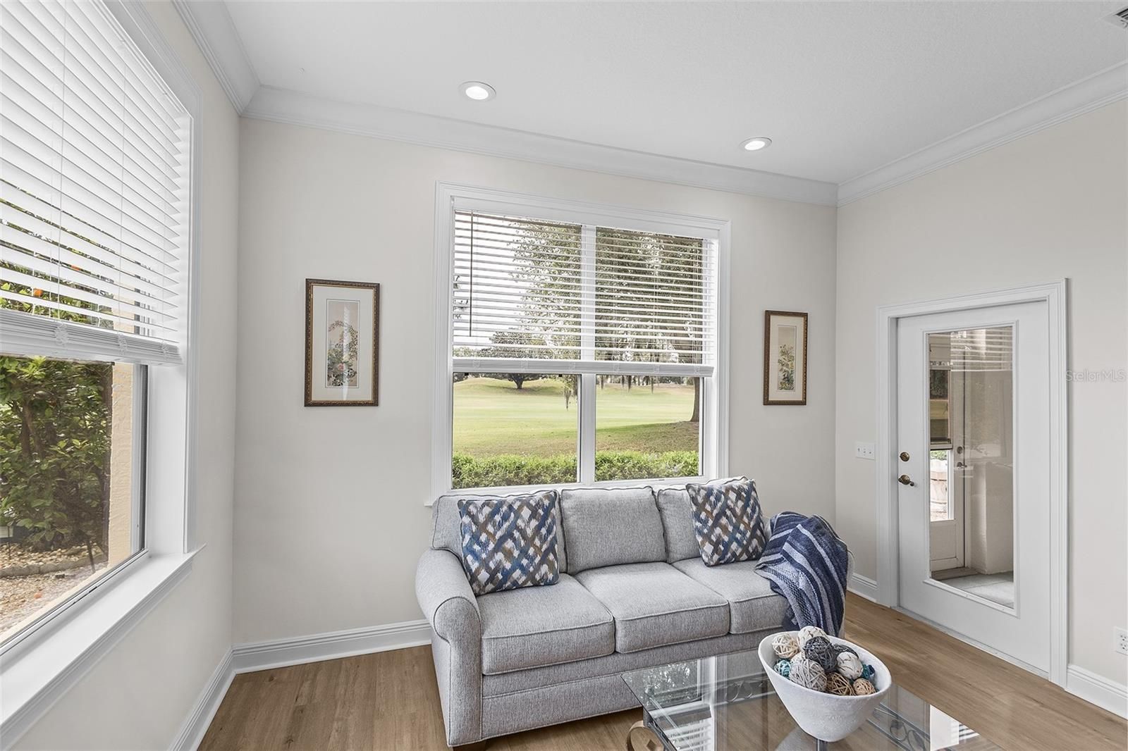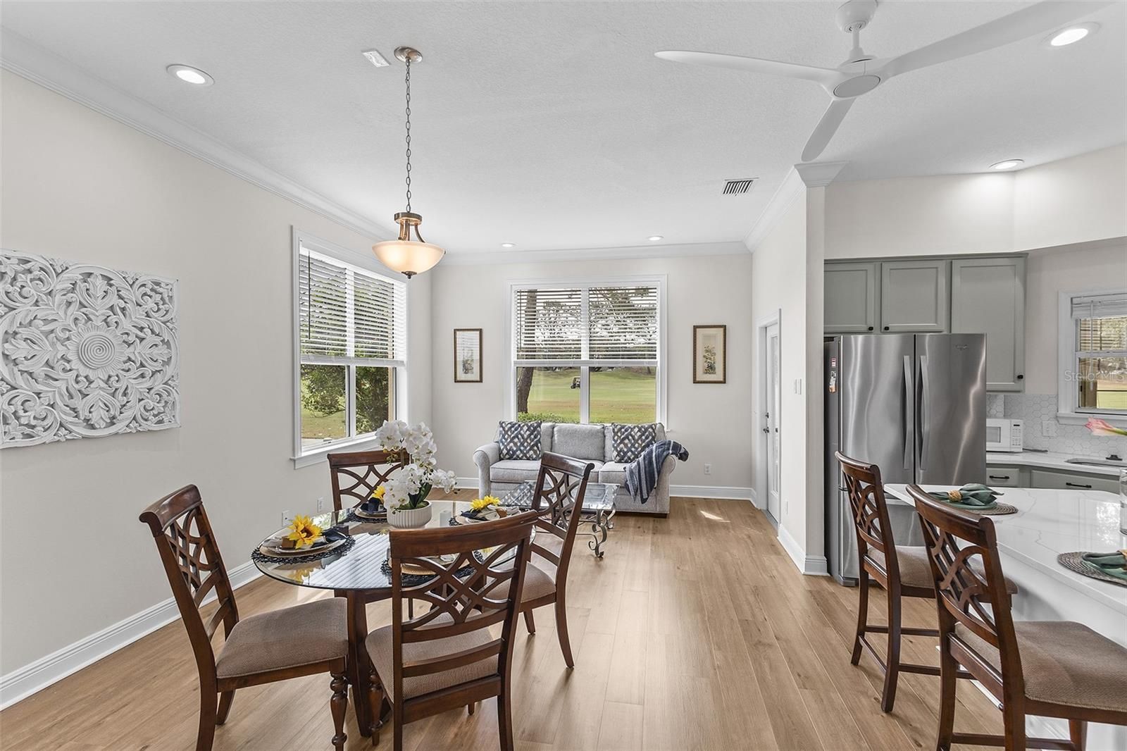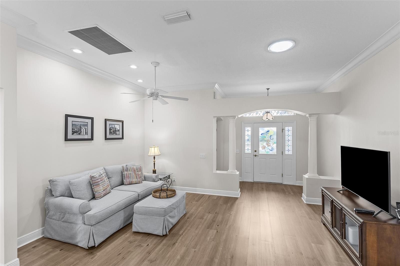 Welcome Home to this BEAUTIFULLY RENOVATED Las Cruces model in the conveniently located Village of Santo Domingo, offering a perfect blend of modern elegance and classic Florida living. From the moment you arrive, the curb appeal hints at the exceptional interior that awaits. Step inside to discover nearly 2,000 square feet of thoughtfully designed living space with soaring 10-foot ceilings, LUXURY VINYL FLOORING in neutral tones, and architecturally detailed trim that highlights the large, light-filled windows throughout. The home’s layout flows effortlessly from the living/TV room into the open living, dining, and kitchen area, all oriented to take in panoramic views of the #7 Fairway of the Hernando Golf Course, part of the vibrant Tierra Del Sol Recreation Area. The kitchen has been updated with MODERN CABINETRY featuring convenient PULL-OUT shelving & STAINLESS APPLIANCESproviding both style and functionality for everyday living or entertaining. BOTH spacious bedrooms are EN-SUITE BATHROOMS with generous walk-in closets, offering privacy and comfort for family and guests. The owner’s suite boasts an panoramic view of the golf course and a customized walk-in closet designed for optimal storage. In addition to the two full bathrooms, a convenient HALF BATH adds flexibility for visitors. Additional highlights include an oversized 22' deep garage with 10-foot ceilings for overhead storage, NEW ROOF in 2020, NEW HVAC in 2025, and NO BOND remaining—making this home move-in ready with peace of mind. Fresh Exterior paint in 2025. Enjoy all the amenities Santo Domingo and the surrounding community offer, including Tierra Del Sol Recreation Center with pools, tennis, pickleball, and more, all set within a vibrant, active neighborhood. This home seamlessly combines luxury, comfort, and a lifestyle of golf-front elegance—don’t miss your chance to make it yours.