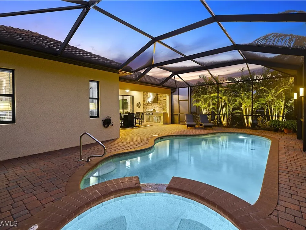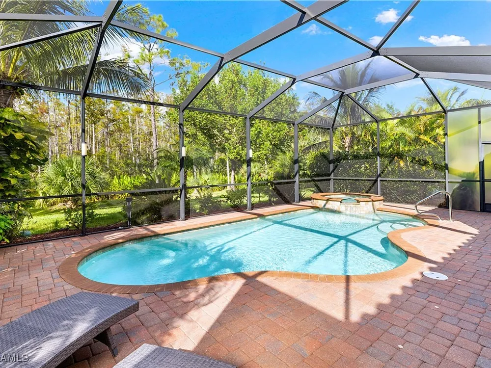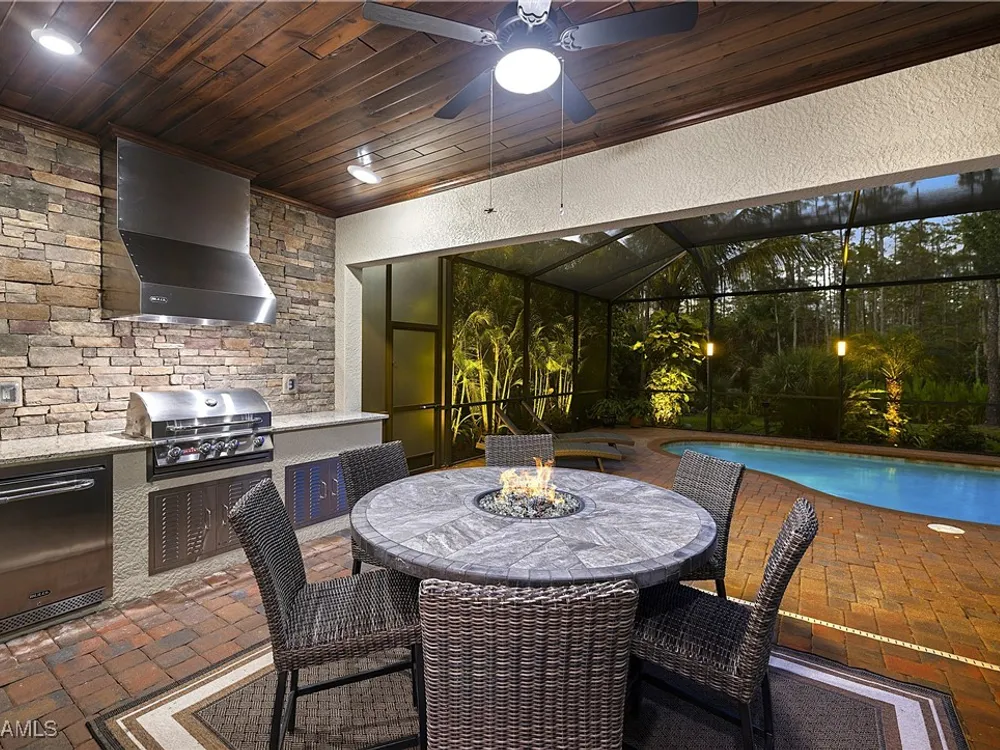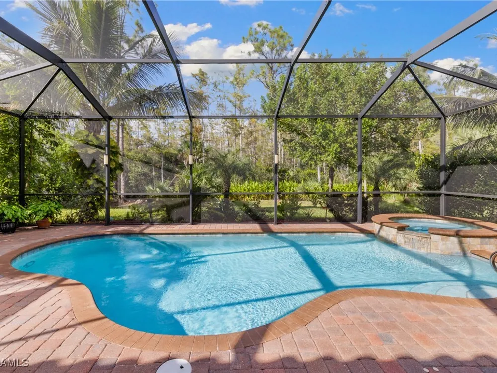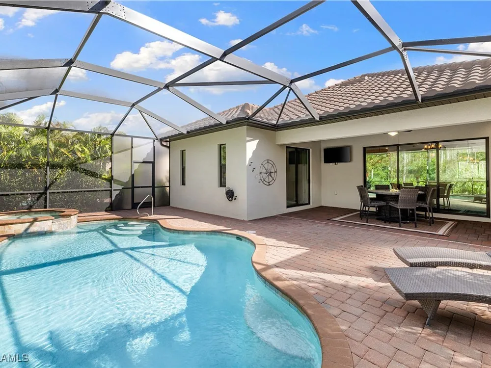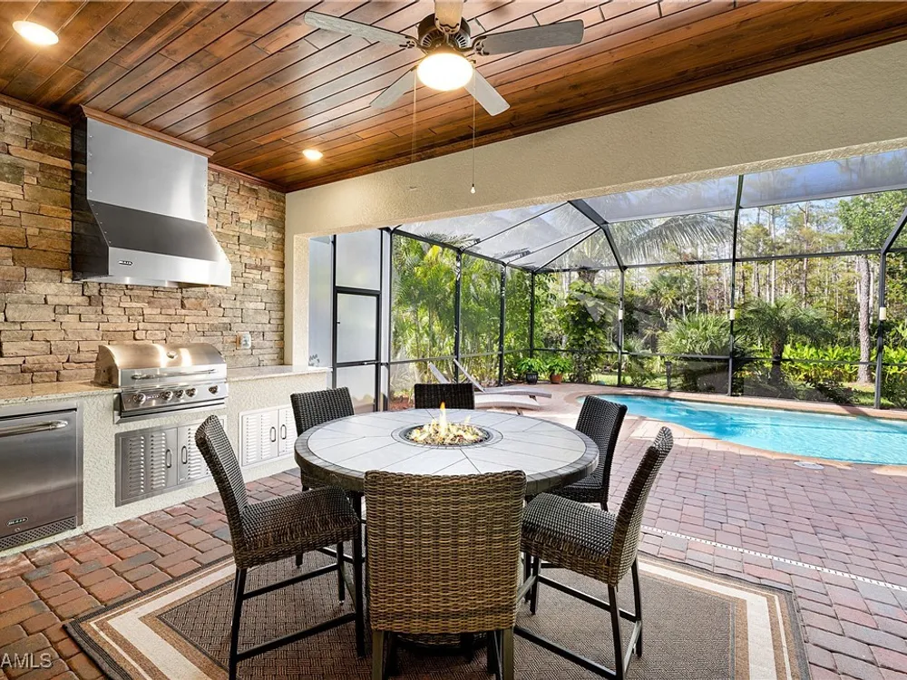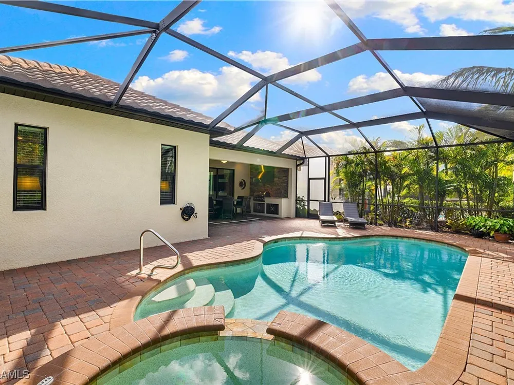 COME SEE THIS HIGHLY UPGRADED “MARIA” MODEL WITH DELUXE OUTDOOR KITCHEN, POOL/SPA & ULTRA PRIVATE PRESERVE VIEWS! This meticulously kept home with SOCIAL MEMBERSHIP offers 4 bedrooms (one can be used as a den), 3 full baths, 2 car garage, 2,247sf living area and is equipped with IMPACT-RESISTANT windows and doors. Take notice of all the WOOD TRIM and CUSTOM MILLWORK throughout the home including crown molding, custom wood accent walls, designer mirror wall in dining area and a beautifully constructed TV Fireplace feature wall. Enjoy the OPEN CONCEPT living space with elegant lighting, TRAY CEILINGS and wood look plank tile. The kitchen blends style and functionality with an oversized walk-in pantry, granite countertops, a large island, built in stainless steel appliances. The elegant off-white cabinetry with accent detail is DOVETAIL CONSTRUCTION with 42-inch upper cabinets enhanced by a STONE BACKSPLASH and UNDER-CABINET LIGHTING for a polished, designer finish. The spacious greatroom is beautifully appointed with an LED ELECTRIC FIREPLACE FEATURE WALL and large glass sliding doors opening up to the lanai. Step out from the greatroom into the expansive lanai, where relaxation and entertaining come naturally. The lanai is accentuated by the SEALED pavers, TONGUE-N-GROOVE CEILING, stone wall and custom OUTDOOR KITCHEN complete with a stainless steel grill, vented hood, refrigerator, sink and storage compartments. Relax in the HEATED POOL AND SPA while taking in the landscaped, manicured views. The pool cage pillar lights and upscale EXTERIOR LANDSCAPE LIGHTING set the perfect evening ambiance for all to enjoy. Inside the home, the primary suite showcases pool and serene preserve views along with having direct lanai access... it also is outfitted with a tray ceiling, dual walk-in closets (one with custom organizers with soft-close drawers, the other with wood shelving). The spa-style bathroom features granite countertops, dual sinks, vanity area and an oversized shower with HEAVY GLASS ENCLOSURE and rainfall showerhead. The two guest bedrooms provide family and friends with ample space to stay. One bedroom has a private en-suite bath and the other has a Jack and Jill bath shared with the den. The 4th Bedroom/Den boasts wood flooring, separate closet and a charming white bookcase w/bench seating, perfect for a reading nook. Laundry and garage are complete with CABINETRY for added storage. Bonita National Golf & Country Club is in FLOOD ZONE X (no flood insurance required) and centrally located, just a short drive to the Gulf beaches, Airport, upscale shopping, Coconut Point Mall, Miromar Outlets, Gulf Coast Town Center, and the exciting new Midtown Bonita! Bonita National offers an impressive array of amenities including an on-site restaurant and bar, resort-style pool, lap pool, spa, pickleball courts, tennis, fitness center, clubhouse, beauty salon, and 24-hour guard at gate. Social members can play unlimited golf from May through October!