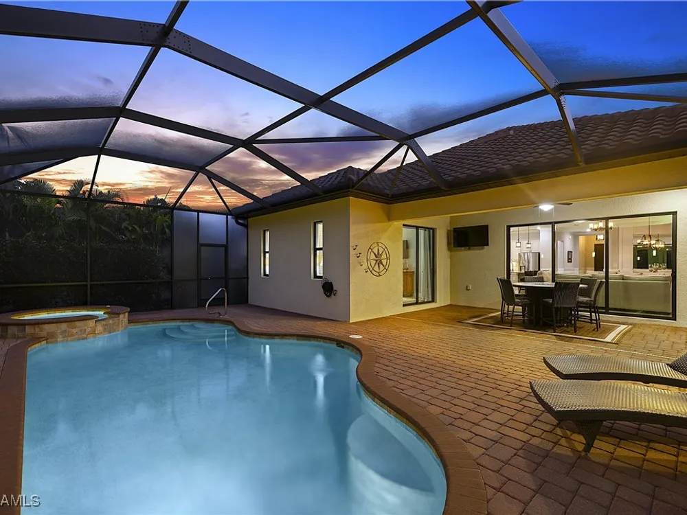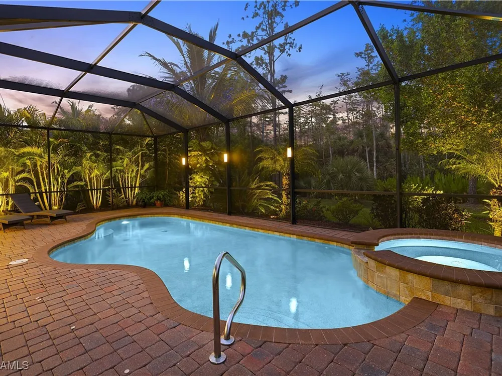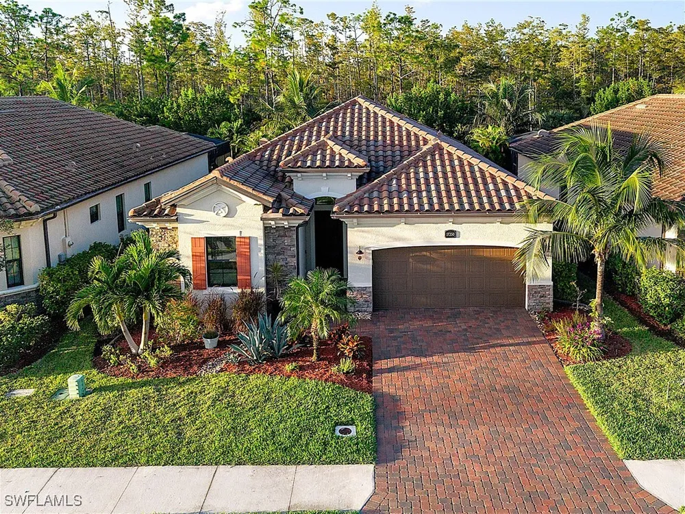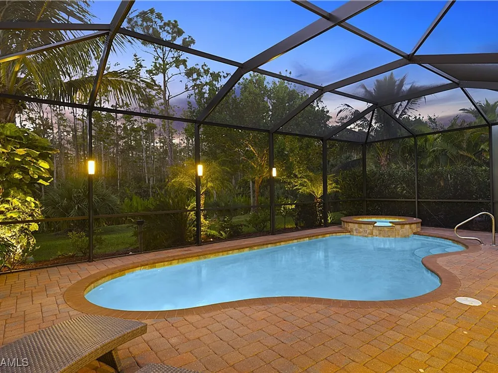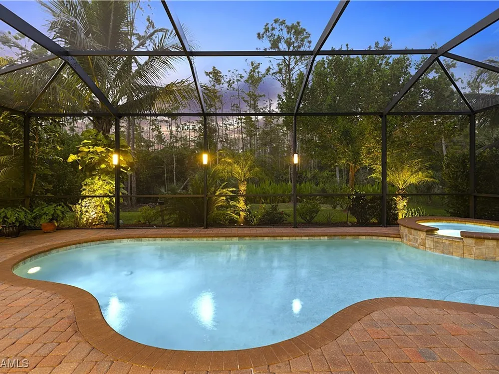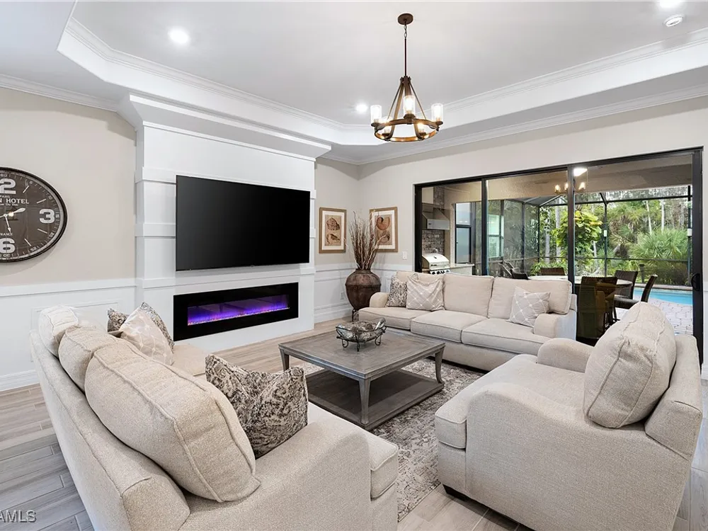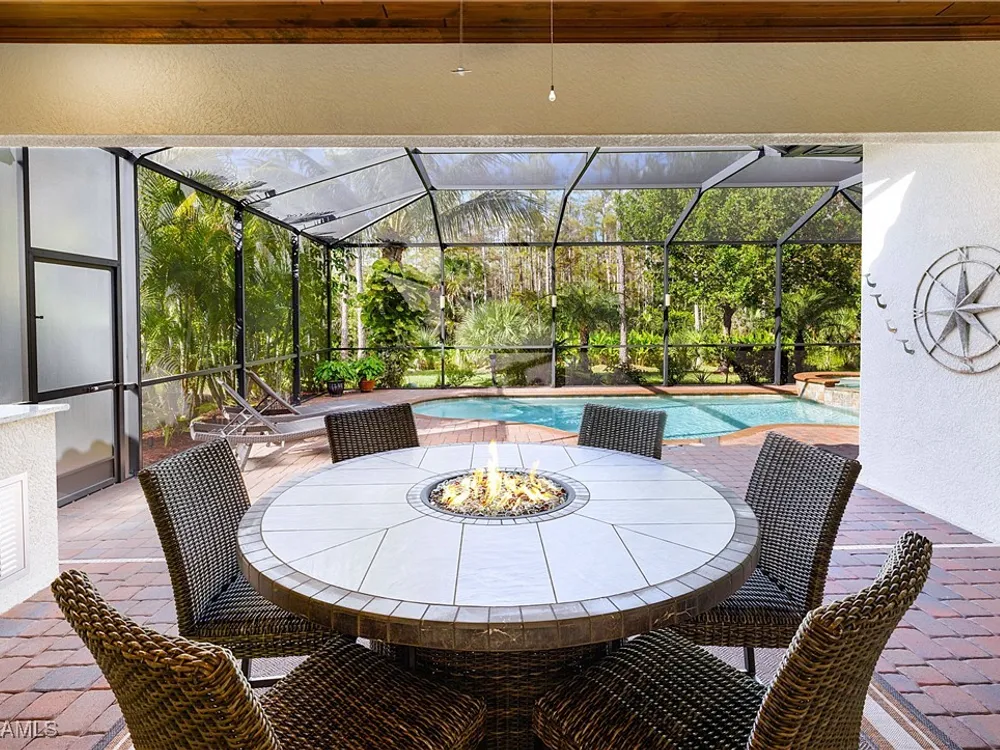 COME SEE THIS HIGHLY UPGRADED “MARIA” MODEL WITH DELUXE OUTDOOR KITCHEN, POOL/SPA & ULTRA PRIVATE PRESERVE VIEWS! This meticulously kept home with SOCIAL MEMBERSHIP offers 4 bedrooms (one can be used as a den), 3 full baths, 2 car garage, 2,247sf living area and is equipped with IMPACT-RESISTANT windows and doors. Take notice of all the WOOD TRIM and CUSTOM MILLWORK throughout the home including crown molding, custom wood accent walls, designer mirror wall in dining area and a beautifully constructed TV Fireplace feature wall. Enjoy the OPEN CONCEPT living space with elegant lighting, TRAY CEILINGS and wood look plank tile. The kitchen blends style and functionality with an oversized walk-in pantry, granite countertops, a large island, built in stainless steel appliances. The elegant off-white cabinetry with accent detail is DOVETAIL CONSTRUCTION with 42-inch upper cabinets enhanced by a STONE BACKSPLASH and UNDER-CABINET LIGHTING for a polished, designer finish. The spacious greatroom is beautifully appointed with an LED ELECTRIC FIREPLACE FEATURE WALL and large glass sliding doors opening up to the lanai. Step out from the greatroom into the expansive lanai, where relaxation and entertaining come naturally. The lanai is accentuated by the SEALED pavers, TONGUE-N-GROOVE CEILING, stone wall and custom OUTDOOR KITCHEN complete with a stainless steel grill, vented hood, refrigerator, sink and storage compartments. Relax in the HEATED POOL AND SPA while taking in the landscaped, manicured views. The pool cage pillar lights and upscale EXTERIOR LANDSCAPE LIGHTING set the perfect evening ambiance for all to enjoy. Inside the home, the primary suite showcases pool and serene preserve views along with having direct lanai access... it also is outfitted with a tray ceiling, dual walk-in closets (one with custom organizers with soft-close drawers, the other with wood shelving). The spa-style bathroom features granite countertops, dual sinks, vanity area and an oversized shower with HEAVY GLASS ENCLOSURE and rainfall showerhead. The two guest bedrooms provide family and friends with ample space to stay. One bedroom has a private en-suite bath and the other has a Jack and Jill bath shared with the den. The 4th Bedroom/Den boasts wood flooring, separate closet and a charming white bookcase w/bench seating, perfect for a reading nook. Laundry and garage are complete with CABINETRY for added storage. Bonita National Golf & Country Club is in FLOOD ZONE X (no flood insurance required) and centrally located, just a short drive to the Gulf beaches, Airport, upscale shopping, Coconut Point Mall, Miromar Outlets, Gulf Coast Town Center, and the exciting new Midtown Bonita! Bonita National offers an impressive array of amenities including an on-site restaurant and bar, resort-style pool, lap pool, spa, pickleball courts, tennis, fitness center, clubhouse, beauty salon, and 24-hour guard at gate. Social members can play unlimited golf from May through October!