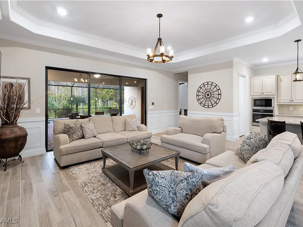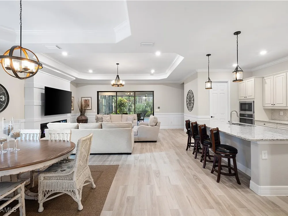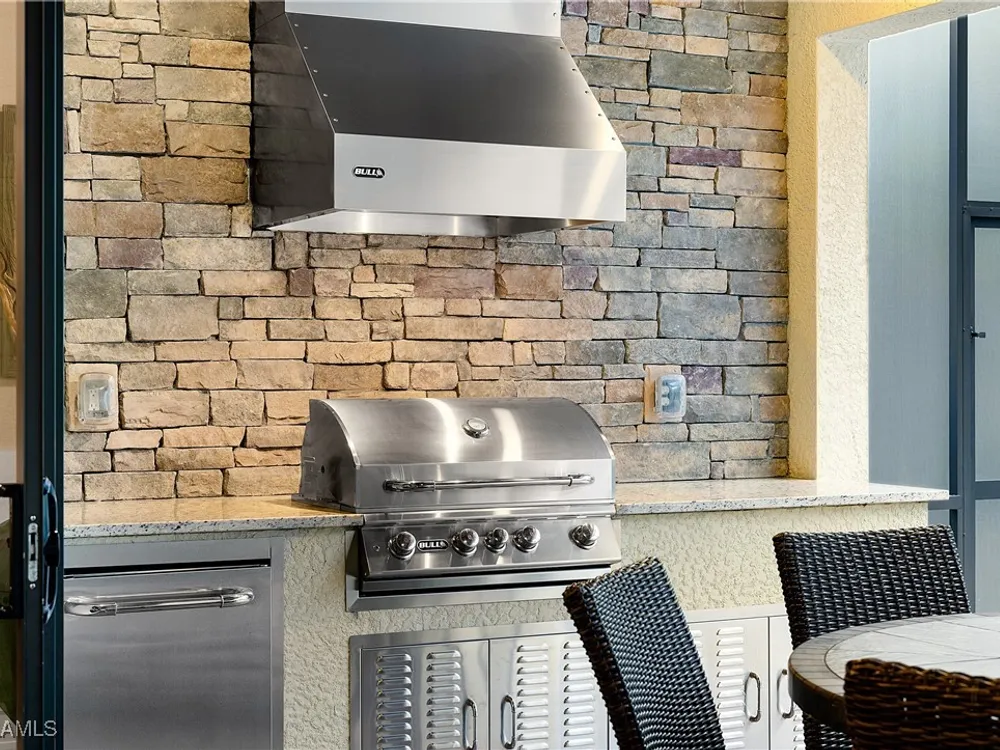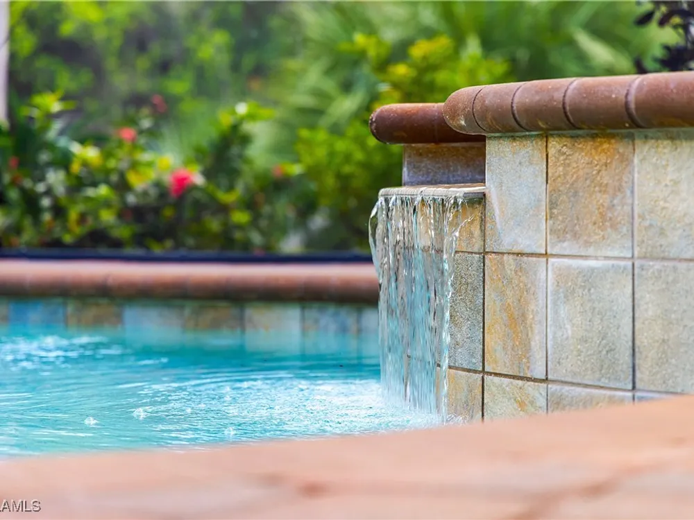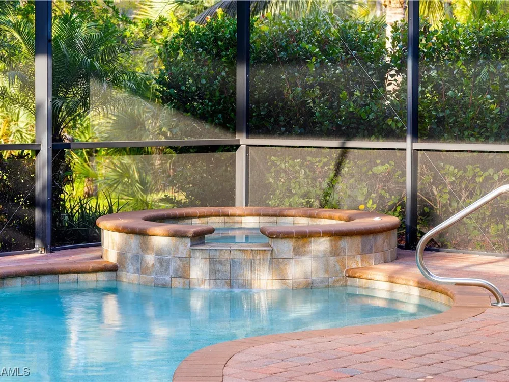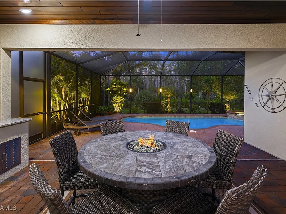 COME SEE THIS HIGHLY UPGRADED “MARIA” MODEL WITH DELUXE OUTDOOR KITCHEN, POOL/SPA & ULTRA PRIVATE PRESERVE VIEWS! This meticulously kept home with SOCIAL MEMBERSHIP offers 4 bedrooms (one can be used as a den), 3 full baths, 2 car garage, 2,247sf living area and is equipped with IMPACT-RESISTANT windows and doors. Take notice of all the WOOD TRIM and CUSTOM MILLWORK throughout the home including crown molding, custom wood accent walls, designer mirror wall in dining area and a beautifully constructed TV Fireplace feature wall. Enjoy the OPEN CONCEPT living space with elegant lighting, TRAY CEILINGS and wood look plank tile. The kitchen blends style and functionality with an oversized walk-in pantry, granite countertops, a large island, built in stainless steel appliances. The elegant off-white cabinetry with accent detail is DOVETAIL CONSTRUCTION with 42-inch upper cabinets enhanced by a STONE BACKSPLASH and UNDER-CABINET LIGHTING for a polished, designer finish. The spacious greatroom is beautifully appointed with an LED ELECTRIC FIREPLACE FEATURE WALL and large glass sliding doors opening up to the lanai. Step out from the greatroom into the expansive lanai, where relaxation and entertaining come naturally. The lanai is accentuated by the SEALED pavers, TONGUE-N-GROOVE CEILING, stone wall and custom OUTDOOR KITCHEN complete with a stainless steel grill, vented hood, refrigerator, sink and storage compartments. Relax in the HEATED POOL AND SPA while taking in the landscaped, manicured views. The pool cage pillar lights and upscale EXTERIOR LANDSCAPE LIGHTING set the perfect evening ambiance for all to enjoy. Inside the home, the primary suite showcases pool and serene preserve views along with having direct lanai access... it also is outfitted with a tray ceiling, dual walk-in closets (one with custom organizers with soft-close drawers, the other with wood shelving). The spa-style bathroom features granite countertops, dual sinks, vanity area and an oversized shower with HEAVY GLASS ENCLOSURE and rainfall showerhead. The two guest bedrooms provide family and friends with ample space to stay. One bedroom has a private en-suite bath and the other has a Jack and Jill bath shared with the den. The 4th Bedroom/Den boasts wood flooring, separate closet and a charming white bookcase w/bench seating, perfect for a reading nook. Laundry and garage are complete with CABINETRY for added storage. Bonita National Golf & Country Club is in FLOOD ZONE X (no flood insurance required) and centrally located, just a short drive to the Gulf beaches, Airport, upscale shopping, Coconut Point Mall, Miromar Outlets, Gulf Coast Town Center, and the exciting new Midtown Bonita! Bonita National offers an impressive array of amenities including an on-site restaurant and bar, resort-style pool, lap pool, spa, pickleball courts, tennis, fitness center, clubhouse, beauty salon, and 24-hour guard at gate. Social members can play unlimited golf from May through October!