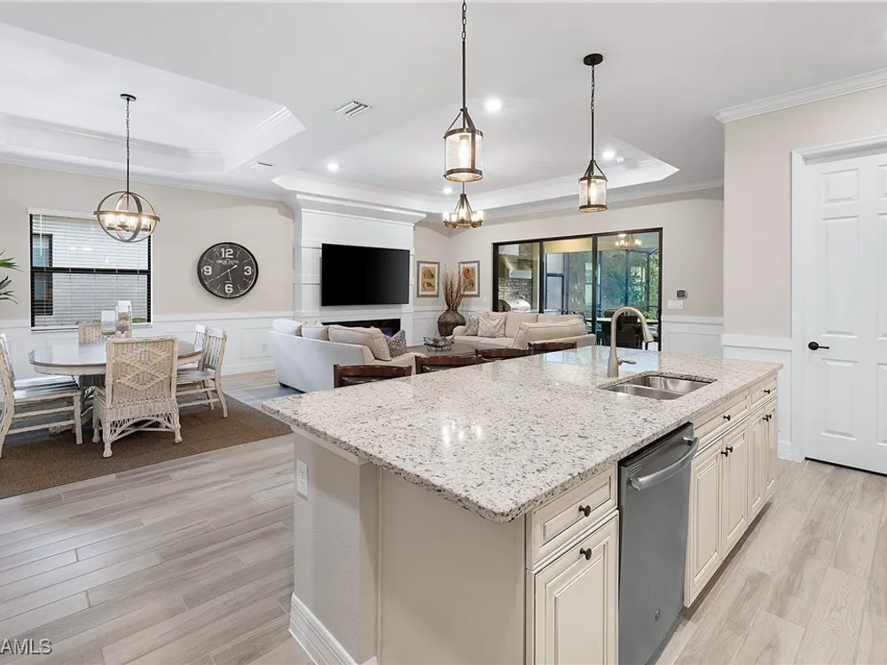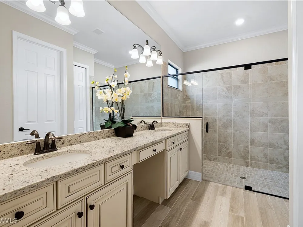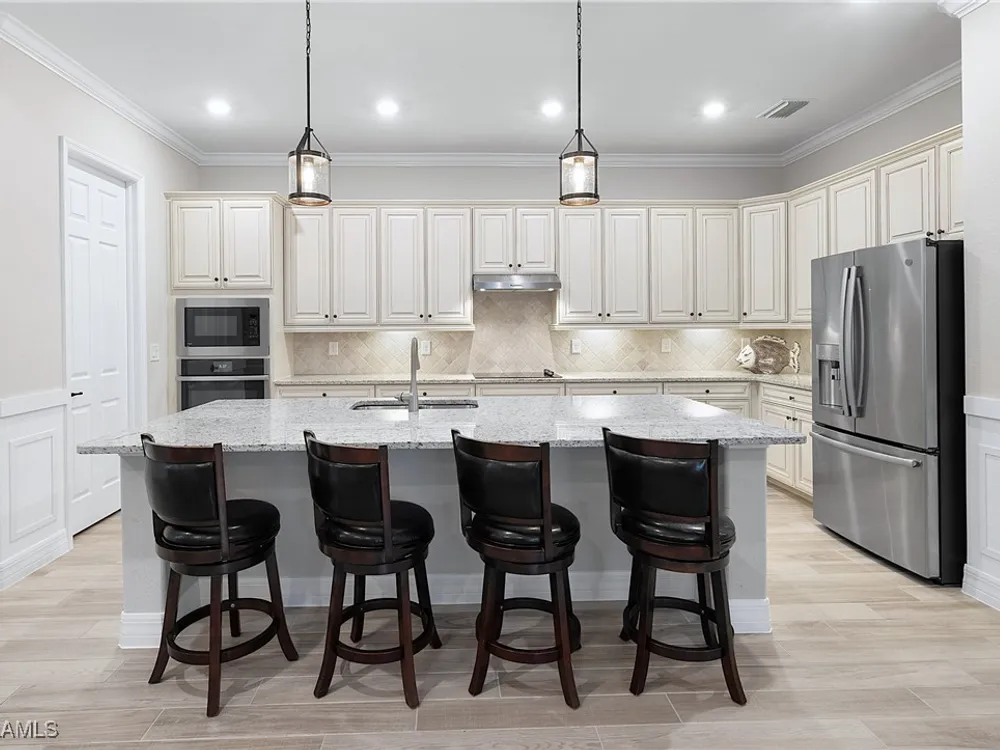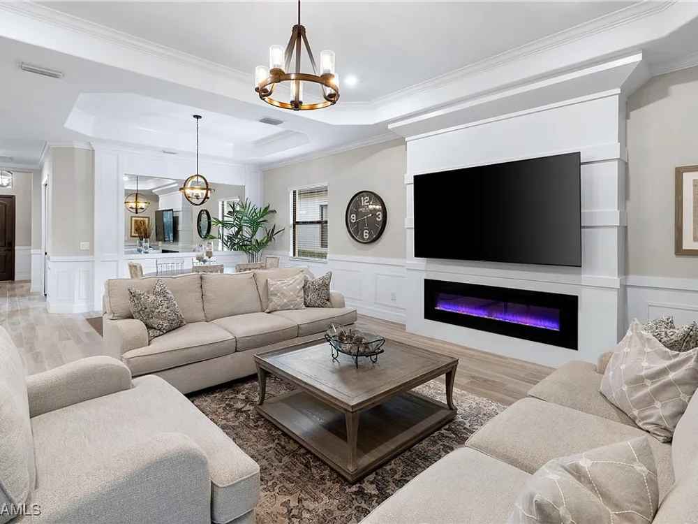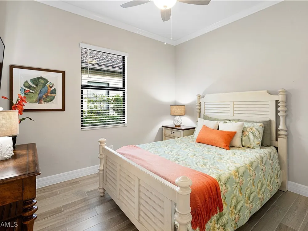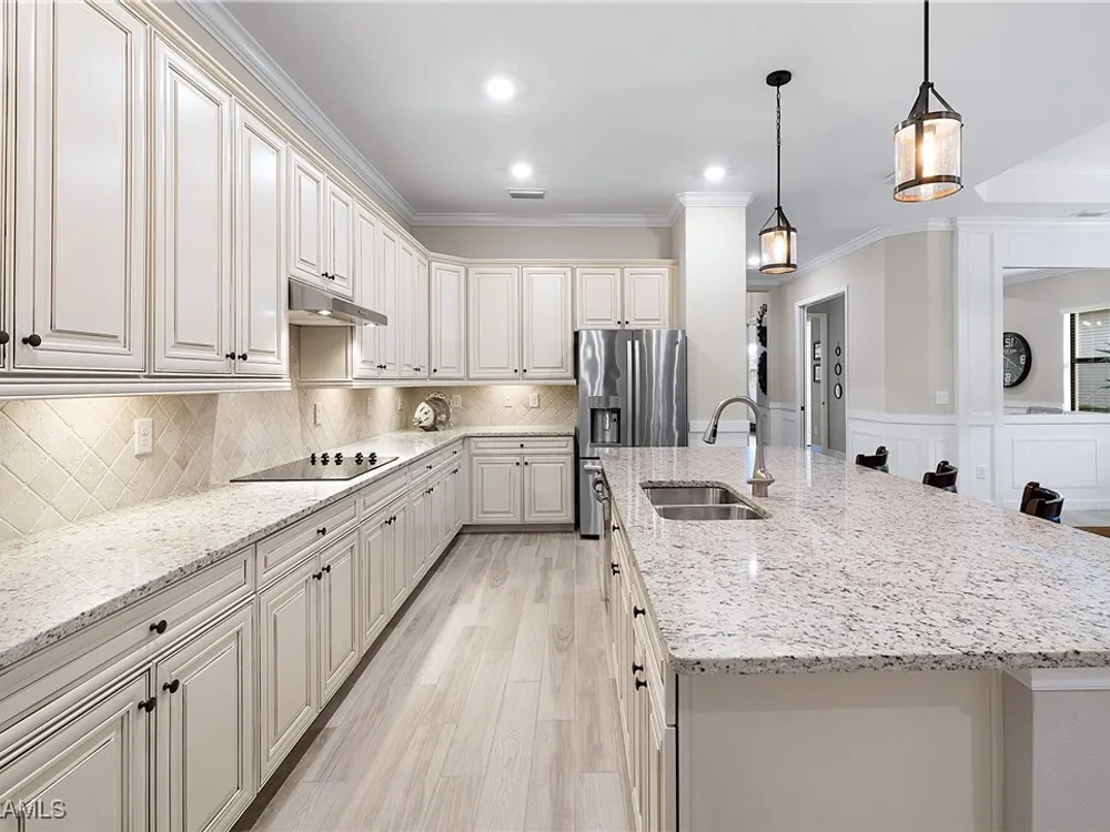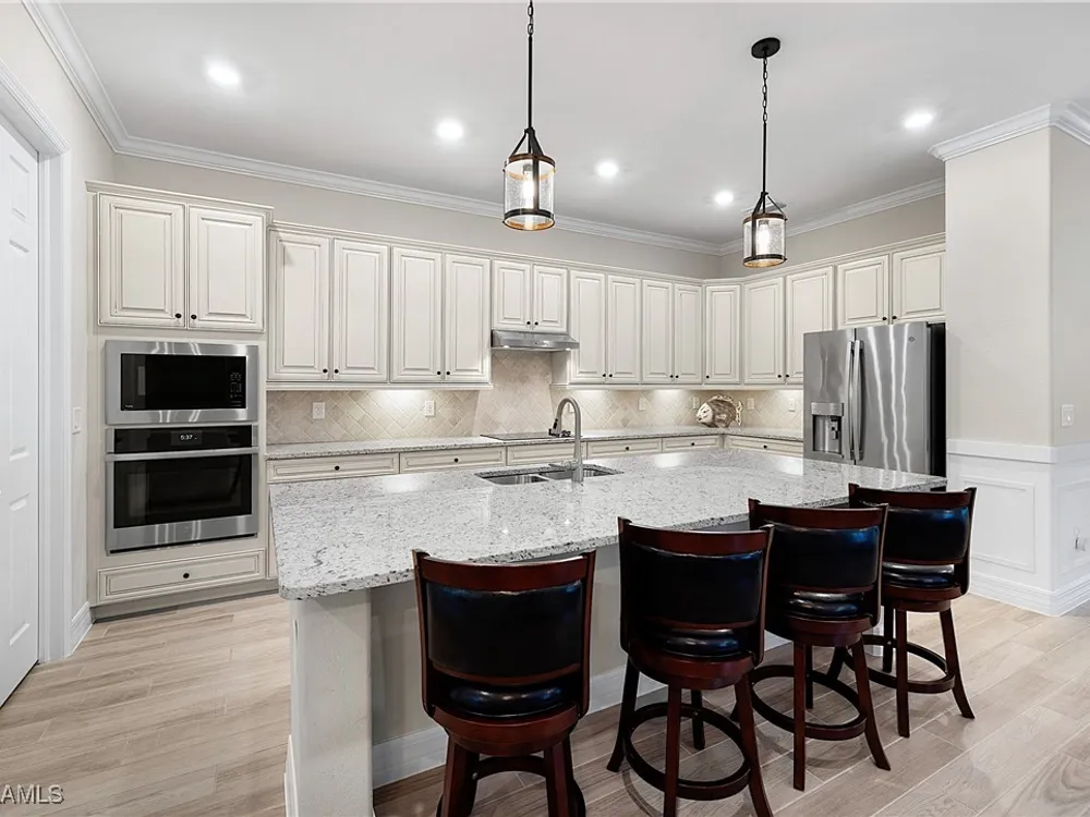COME SEE THIS HIGHLY UPGRADED “MARIA” MODEL WITH DELUXE OUTDOOR KITCHEN, POOL/SPA & ULTRA PRIVATE PRESERVE VIEWS! This meticulously kept home with SOCIAL MEMBERSHIP offers 4 bedrooms (one can be used as a den), 3 full baths, 2 car garage, 2,247sf living area and is equipped with IMPACT-RESISTANT windows and doors. Take notice of all the WOOD TRIM and CUSTOM MILLWORK throughout the home including crown molding, custom wood accent walls, designer mirror wall in dining area and a beautifully constructed TV Fireplace feature wall. Enjoy the OPEN CONCEPT living space with elegant lighting, TRAY CEILINGS and wood look plank tile. The kitchen blends style and functionality with an oversized walk-in pantry, granite countertops, a large island, built in stainless steel appliances. The elegant off-white cabinetry with accent detail is DOVETAIL CONSTRUCTION with 42-inch upper cabinets enhanced by a STONE BACKSPLASH and UNDER-CABINET LIGHTING for a polished, designer finish. The spacious greatroom is beautifully appointed with an LED ELECTRIC FIREPLACE FEATURE WALL and large glass sliding doors opening up to the lanai. Step out from the greatroom into the expansive lanai, where relaxation and entertaining come naturally. The lanai is accentuated by the SEALED pavers, TONGUE-N-GROOVE CEILING, stone wall and custom OUTDOOR KITCHEN complete with a stainless steel grill, vented hood, refrigerator, sink and storage compartments. Relax in the HEATED POOL AND SPA while taking in the landscaped, manicured views. The pool cage pillar lights and upscale EXTERIOR LANDSCAPE LIGHTING set the perfect evening ambiance for all to enjoy. Inside the home, the primary suite showcases pool and serene preserve views along with having direct lanai access... it also is outfitted with a tray ceiling, dual walk-in closets (one with custom organizers with soft-close drawers, the other with wood shelving). The spa-style bathroom features granite countertops, dual sinks, vanity area and an oversized shower with HEAVY GLASS ENCLOSURE and rainfall showerhead. The two guest bedrooms provide family and friends with ample space to stay. One bedroom has a private en-suite bath and the other has a Jack and Jill bath shared with the den. The 4th Bedroom/Den boasts wood flooring, separate closet and a charming white bookcase w/bench seating, perfect for a reading nook. Laundry and garage are complete with CABINETRY for added storage. Bonita National Golf & Country Club is in FLOOD ZONE X (no flood insurance required) and centrally located, just a short drive to the Gulf beaches, Airport, upscale shopping, Coconut Point Mall, Miromar Outlets, Gulf Coast Town Center, and the exciting new Midtown Bonita! Bonita National offers an impressive array of amenities including an on-site restaurant and bar, resort-style pool, lap pool, spa, pickleball courts, tennis, fitness center, clubhouse, beauty salon, and 24-hour guard at gate. Social members can play unlimited golf from May through October!