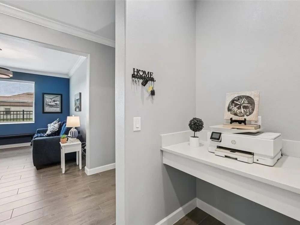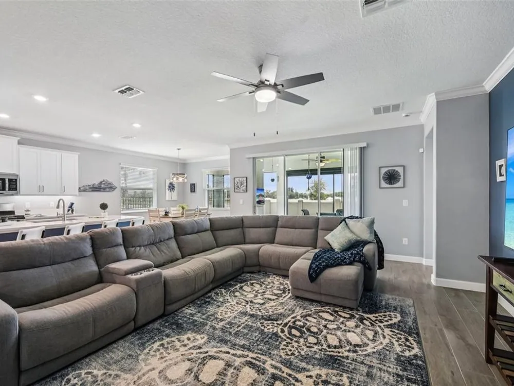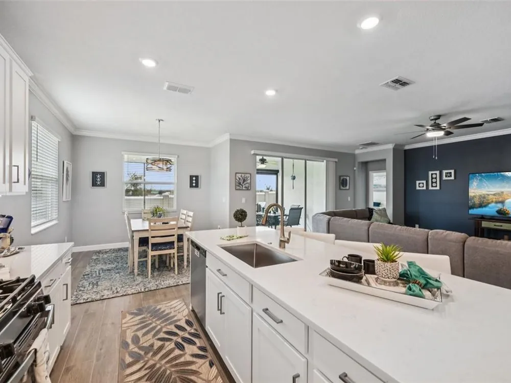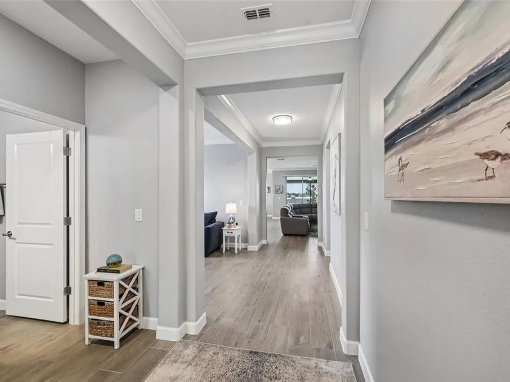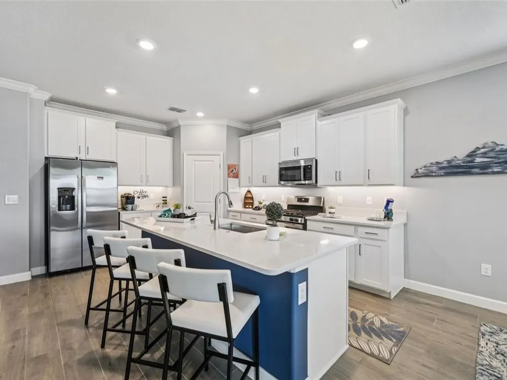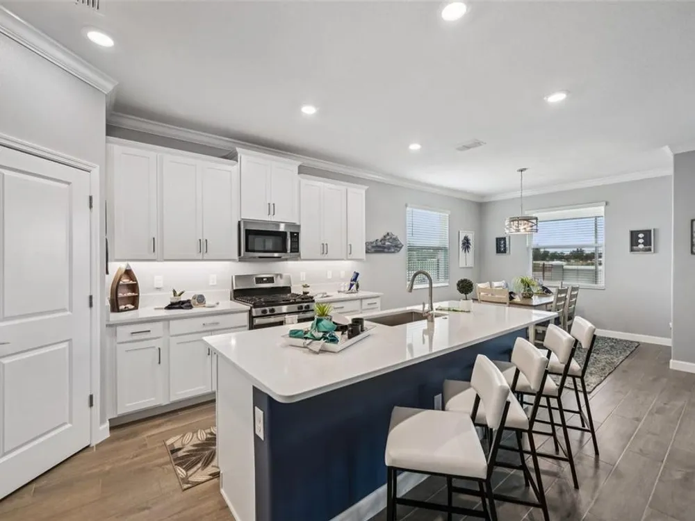 Have you checked out Wimauma, FL, lately? This 2023 Sunburst model is packed with upgrades and located in Medley at South Shore Bay—a gated, newly built 55+ community known for its vibrant lifestyle and upscale clubhouse. This single-story, standalone home offers curb appeal with a curved front archway, multi-pitched roofline, woodgrain-style garage door, and colorful landscaping (maintained by the association). The convenient community location allows for quick in-and-out access, and there’s plenty of room to spread out with 2 bedrooms, 2 full bathrooms, and a versatile flex room. The interior showcases a modern design with stylish paint tones—including a striking navy-blue accent wall and coordinating island—paired with lever door handles, bullnose corners, crown molding, beveled baseboards, and plank tile flooring throughout except in the carpeted bedrooms. The open-concept living space combines the living room, dining area, and entertainer’s kitchen. The kitchen features quartz/quartzite countertops, a 4-seat center, an under-counter stainless steel farmhouse sink with a sprayer faucet, sponge caddy, and disposer. KCMA sustainable 42” white shaker cabinets are topped with molding, have pull-out shelves and drawers, and are enhanced by dimmable LED under-cab lighting. A corner walk-in pantry and GE stainless steel appliances—including a gas stove, microwave, dishwasher, and refrigerator with water/ice dispenser—complete this impressive space. The entire home is equipped with a filtration water softener, providing clean, drinkable water. The bedrooms are split at opposite ends of the home, with the primary suite tucked away at the back of home. The east side of the home features a smart and unique layout: the primary bedroom connects to a sprawling en-suite bath complete with dual sinks, a makeup vanity, a glass-framed, easy step-in shower with bench seating, and a water closet. Thanks to the tankless water heater, you can enjoy long, hot showers. The walk-in closet flows directly into the laundry room, which can be closed off from the main living space for added convenience. The laundry room includes a white GE top-load W/D, a modern washtub sink with sprayer faucet, cabinet storage, and a place to plug in rechargeable vacuums. Step through tinted glass sliders into the oversized screened lanai—perfect for outdoor dining or relaxing, complete with remote privacy screen, patio TV wiring, and string light hooks. The 2 car garage features an insulated, impact-rated Banko door, LiftMaster smart opener, built-in cabinets, tool hook, LED lighting, and a raised threshold for cleaner entry. A convenient drop-zone counter sits just inside the home’s garage entry, and the A/C condenser has its own closet. Storm protection panels are neatly organized for all dual-pane vinyl windows—qualifying for wind mitigation credits. This is a golf cart-friendly neighborhood with a resort-style clubhouse offering a restaurant, indoor/outdoor bar, computer center, dining areas, ballroom, pool table, lagoon pool, fitness center, lifestyle clubs, pickleball, bocce ball, turfed cornhole, and dog walking area. One of the most impressive clubhouses this Realtor has seen. I would highly recommend planning your showing around lunch or dinner time to taste test the clubhouse restaurant. Residents also enjoy access to the famed Southshore Bay Lagoon. Whether relaxing at home or joining the fun, this exceptional home delivers the best of Florida’s 55+ lifestyle.