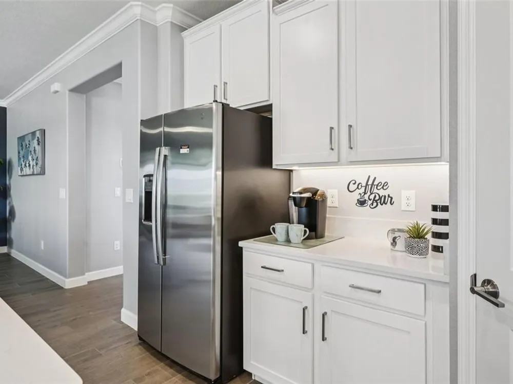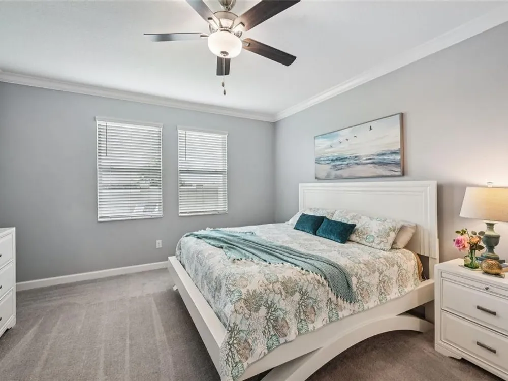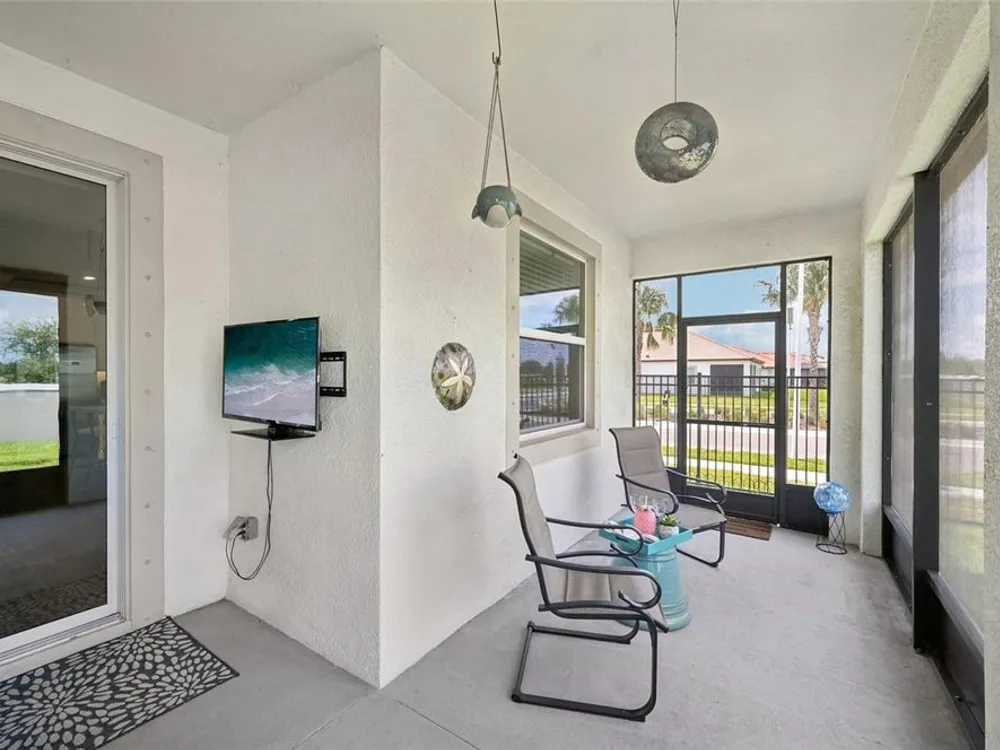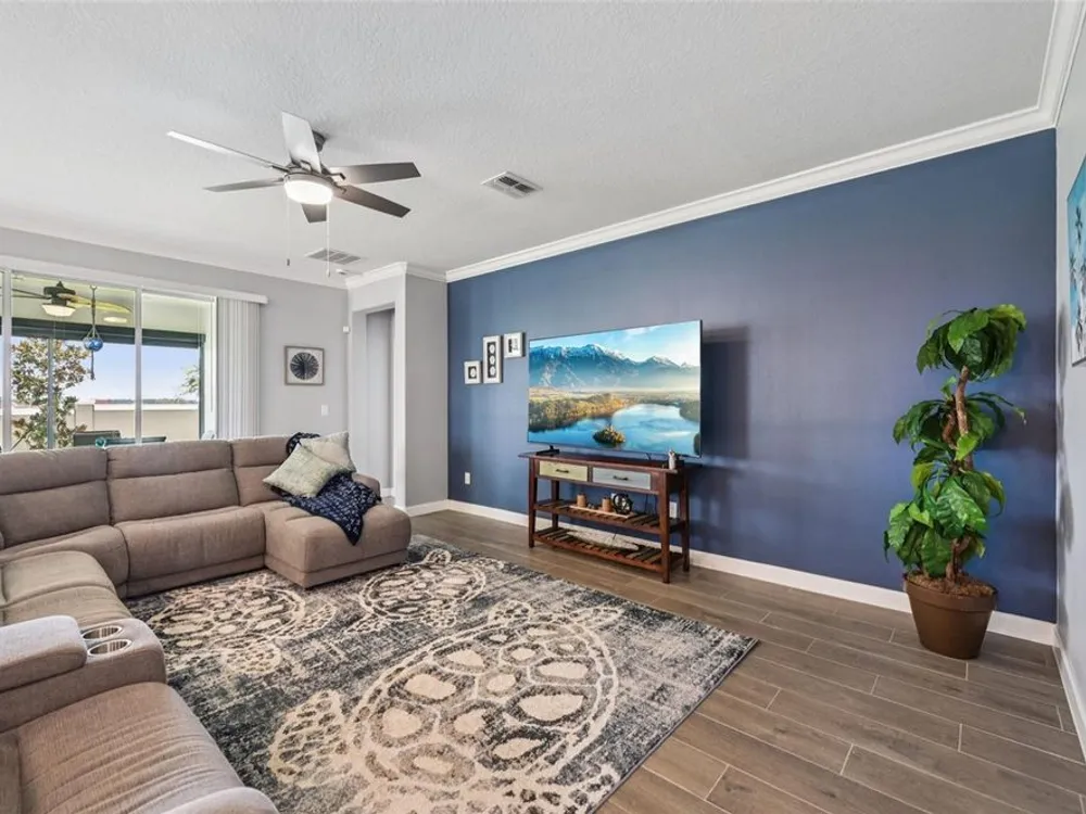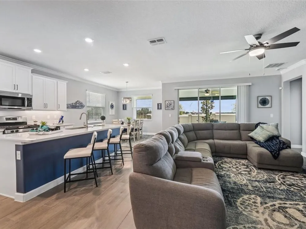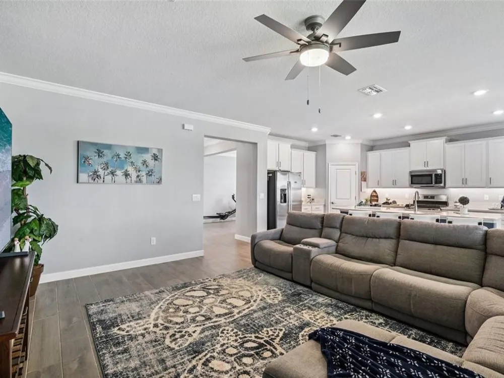 Have you checked out Wimauma, FL, lately? This 2023 Sunburst model is packed with upgrades and located in Medley at South Shore Bay—a gated, newly built 55+ community known for its vibrant lifestyle and upscale clubhouse. This single-story, standalone home offers curb appeal with a curved front archway, multi-pitched roofline, woodgrain-style garage door, and colorful landscaping (maintained by the association). The convenient community location allows for quick in-and-out access, and there’s plenty of room to spread out with 2 bedrooms, 2 full bathrooms, and a versatile flex room. The interior showcases a modern design with stylish paint tones—including a striking navy-blue accent wall and coordinating island—paired with lever door handles, bullnose corners, crown molding, beveled baseboards, and plank tile flooring throughout except in the carpeted bedrooms. The open-concept living space combines the living room, dining area, and entertainer’s kitchen. The kitchen features quartz/quartzite countertops, a 4-seat center, an under-counter stainless steel farmhouse sink with a sprayer faucet, sponge caddy, and disposer. KCMA sustainable 42” white shaker cabinets are topped with molding, have pull-out shelves and drawers, and are enhanced by dimmable LED under-cab lighting. A corner walk-in pantry and GE stainless steel appliances—including a gas stove, microwave, dishwasher, and refrigerator with water/ice dispenser—complete this impressive space. The entire home is equipped with a filtration water softener, providing clean, drinkable water. The bedrooms are split at opposite ends of the home, with the primary suite tucked away at the back of home. The east side of the home features a smart and unique layout: the primary bedroom connects to a sprawling en-suite bath complete with dual sinks, a makeup vanity, a glass-framed, easy step-in shower with bench seating, and a water closet. Thanks to the tankless water heater, you can enjoy long, hot showers. The walk-in closet flows directly into the laundry room, which can be closed off from the main living space for added convenience. The laundry room includes a white GE top-load W/D, a modern washtub sink with sprayer faucet, cabinet storage, and a place to plug in rechargeable vacuums. Step through tinted glass sliders into the oversized screened lanai—perfect for outdoor dining or relaxing, complete with remote privacy screen, patio TV wiring, and string light hooks. The 2 car garage features an insulated, impact-rated Banko door, LiftMaster smart opener, built-in cabinets, tool hook, LED lighting, and a raised threshold for cleaner entry. A convenient drop-zone counter sits just inside the home’s garage entry, and the A/C condenser has its own closet. Storm protection panels are neatly organized for all dual-pane vinyl windows—qualifying for wind mitigation credits. This is a golf cart-friendly neighborhood with a resort-style clubhouse offering a restaurant, indoor/outdoor bar, computer center, dining areas, ballroom, pool table, lagoon pool, fitness center, lifestyle clubs, pickleball, bocce ball, turfed cornhole, and dog walking area. One of the most impressive clubhouses this Realtor has seen. I would highly recommend planning your showing around lunch or dinner time to taste test the clubhouse restaurant. Residents also enjoy access to the famed Southshore Bay Lagoon. Whether relaxing at home or joining the fun, this exceptional home delivers the best of Florida’s 55+ lifestyle.