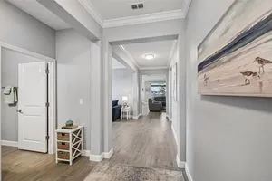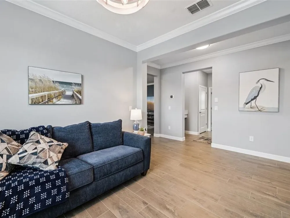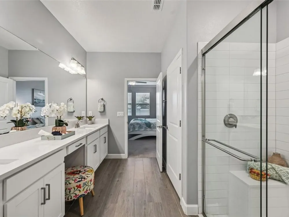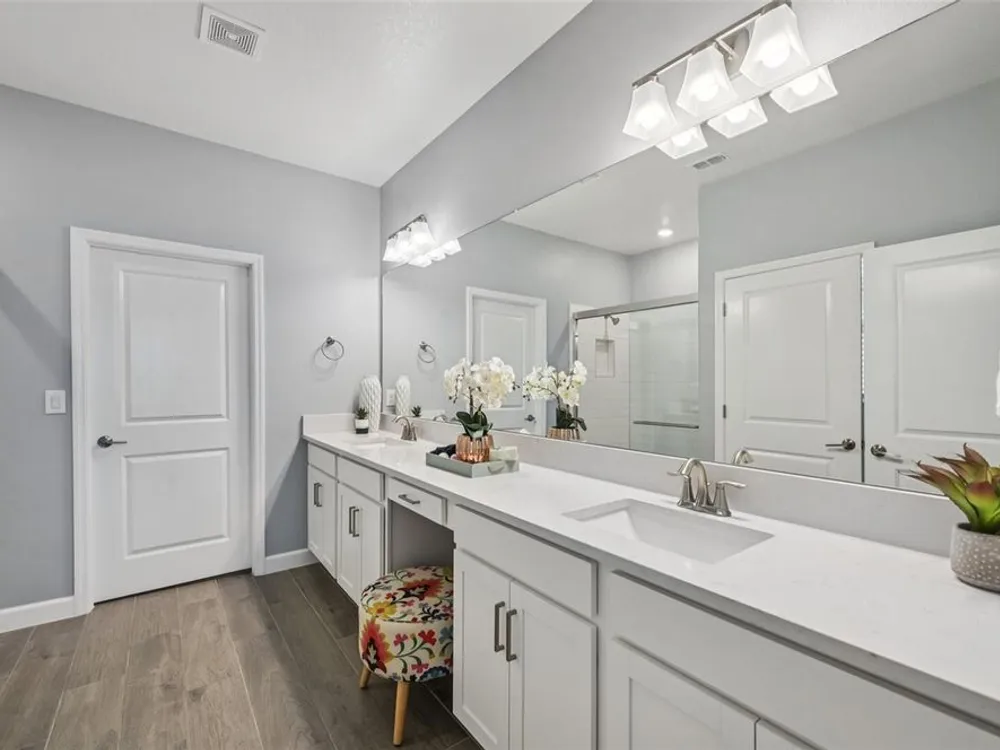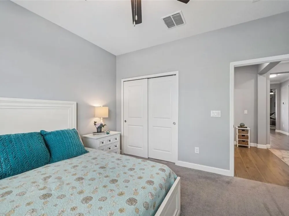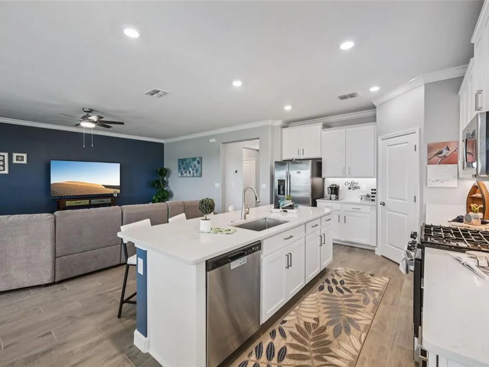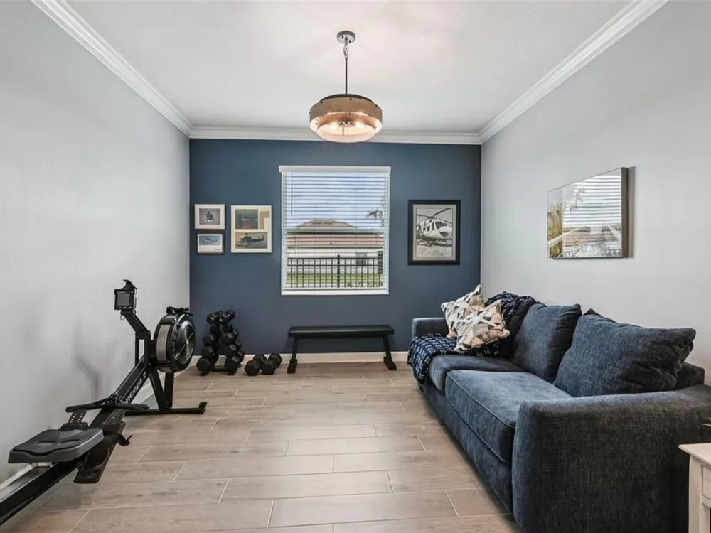 Have you checked out Wimauma, FL, lately? This 2023 Sunburst model is packed with upgrades and located in Medley at South Shore Bay—a gated, newly built 55+ community known for its vibrant lifestyle and upscale clubhouse. This single-story, standalone home offers curb appeal with a curved front archway, multi-pitched roofline, woodgrain-style garage door, and colorful landscaping (maintained by the association). The convenient community location allows for quick in-and-out access, and there’s plenty of room to spread out with 2 bedrooms, 2 full bathrooms, and a versatile flex room. The interior showcases a modern design with stylish paint tones—including a striking navy-blue accent wall and coordinating island—paired with lever door handles, bullnose corners, crown molding, beveled baseboards, and plank tile flooring throughout except in the carpeted bedrooms. The open-concept living space combines the living room, dining area, and entertainer’s kitchen. The kitchen features quartz/quartzite countertops, a 4-seat center, an under-counter stainless steel farmhouse sink with a sprayer faucet, sponge caddy, and disposer. KCMA sustainable 42” white shaker cabinets are topped with molding, have pull-out shelves and drawers, and are enhanced by dimmable LED under-cab lighting. A corner walk-in pantry and GE stainless steel appliances—including a gas stove, microwave, dishwasher, and refrigerator with water/ice dispenser—complete this impressive space. The entire home is equipped with a filtration water softener, providing clean, drinkable water. The bedrooms are split at opposite ends of the home, with the primary suite tucked away at the back of home. The east side of the home features a smart and unique layout: the primary bedroom connects to a sprawling en-suite bath complete with dual sinks, a makeup vanity, a glass-framed, easy step-in shower with bench seating, and a water closet. Thanks to the tankless water heater, you can enjoy long, hot showers. The walk-in closet flows directly into the laundry room, which can be closed off from the main living space for added convenience. The laundry room includes a white GE top-load W/D, a modern washtub sink with sprayer faucet, cabinet storage, and a place to plug in rechargeable vacuums. Step through tinted glass sliders into the oversized screened lanai—perfect for outdoor dining or relaxing, complete with remote privacy screen, patio TV wiring, and string light hooks. The 2 car garage features an insulated, impact-rated Banko door, LiftMaster smart opener, built-in cabinets, tool hook, LED lighting, and a raised threshold for cleaner entry. A convenient drop-zone counter sits just inside the home’s garage entry, and the A/C condenser has its own closet. Storm protection panels are neatly organized for all dual-pane vinyl windows—qualifying for wind mitigation credits. This is a golf cart-friendly neighborhood with a resort-style clubhouse offering a restaurant, indoor/outdoor bar, computer center, dining areas, ballroom, pool table, lagoon pool, fitness center, lifestyle clubs, pickleball, bocce ball, turfed cornhole, and dog walking area. One of the most impressive clubhouses this Realtor has seen. I would highly recommend planning your showing around lunch or dinner time to taste test the clubhouse restaurant. Residents also enjoy access to the famed Southshore Bay Lagoon. Whether relaxing at home or joining the fun, this exceptional home delivers the best of Florida’s 55+ lifestyle.