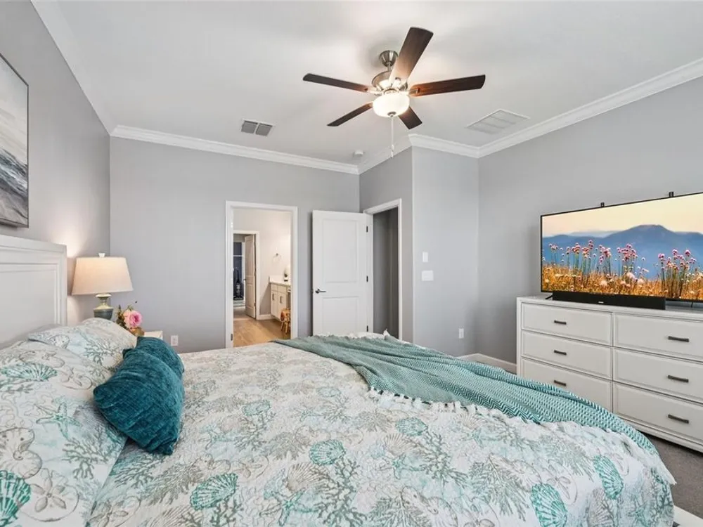 - Ceiling Fan(s), Crown Molding, Eat-in Kitchen, Kitchen/Family Room Combo, Open Floorplan, Main Level Primary, Split Bedrooms, Stone Counters, Thermostat, Walk-In Closet(s), Window Treatments